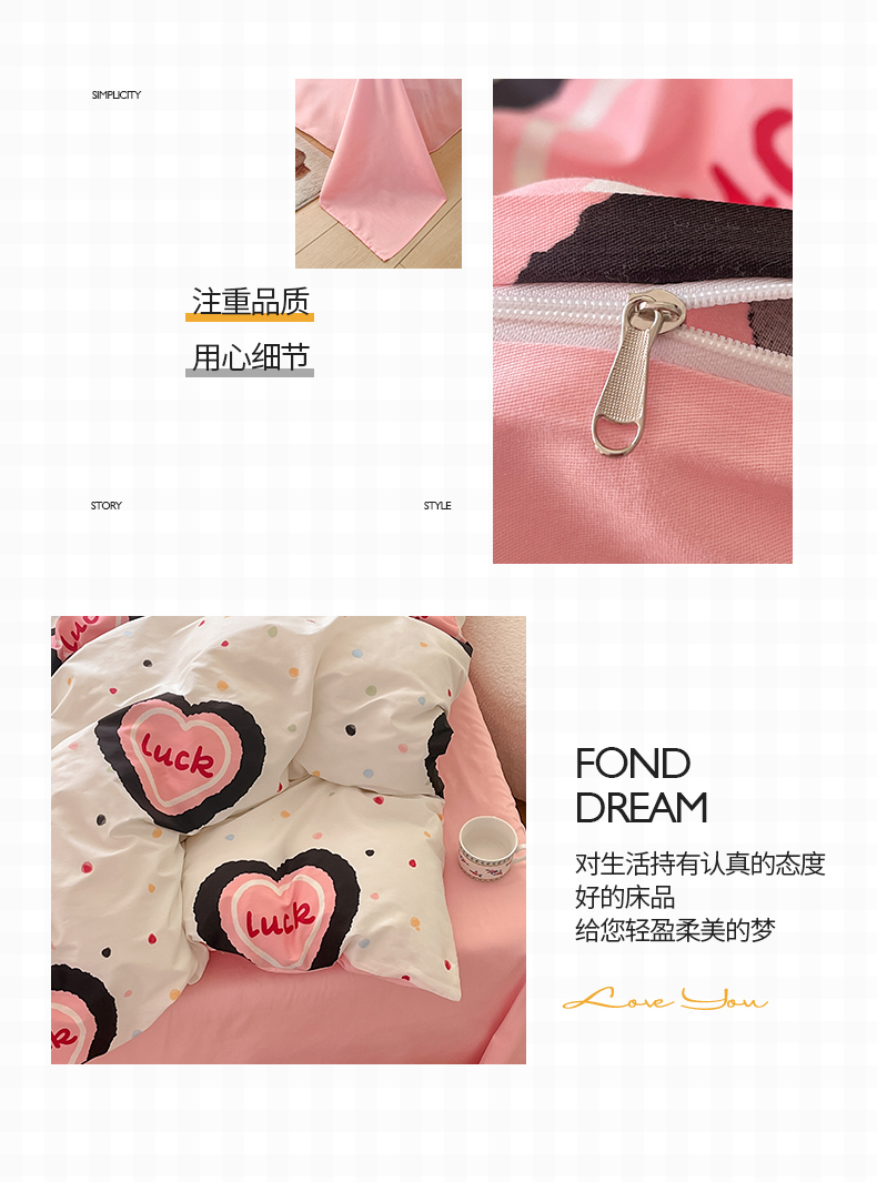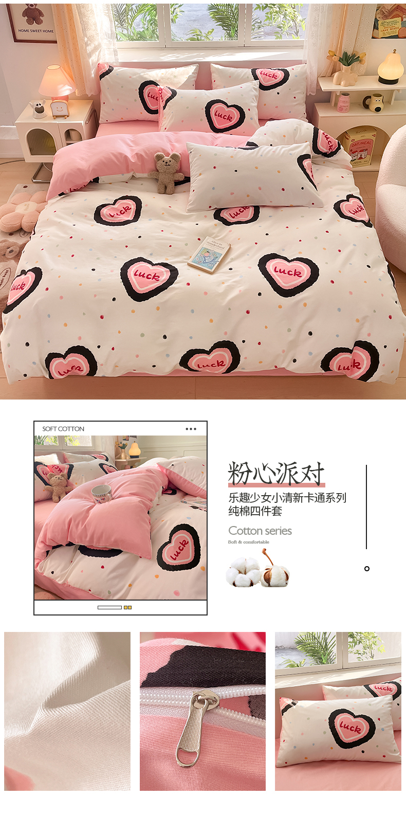 商品名称:桃子 2024新款纯棉13372萌趣少女小清新卡通四件套第二批 棉-粉心派对