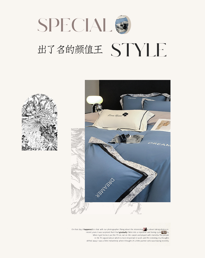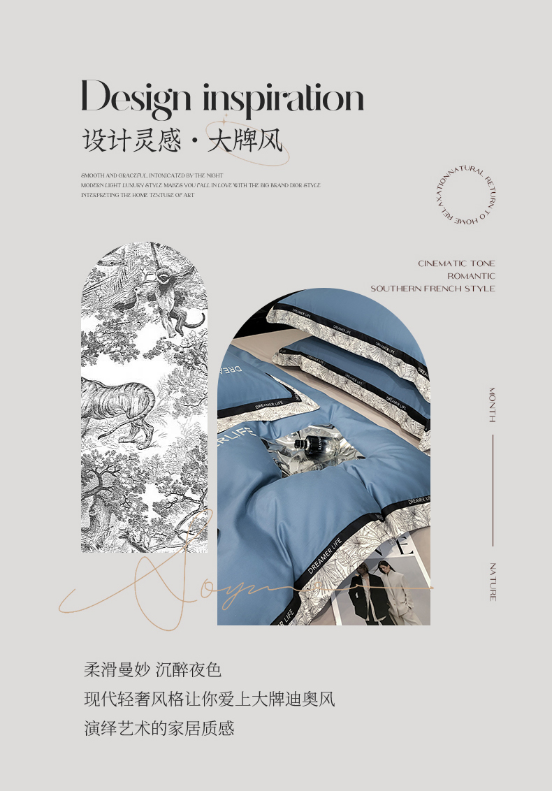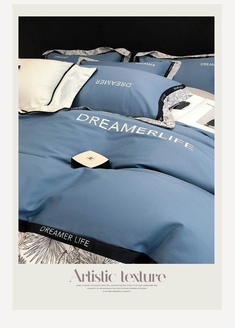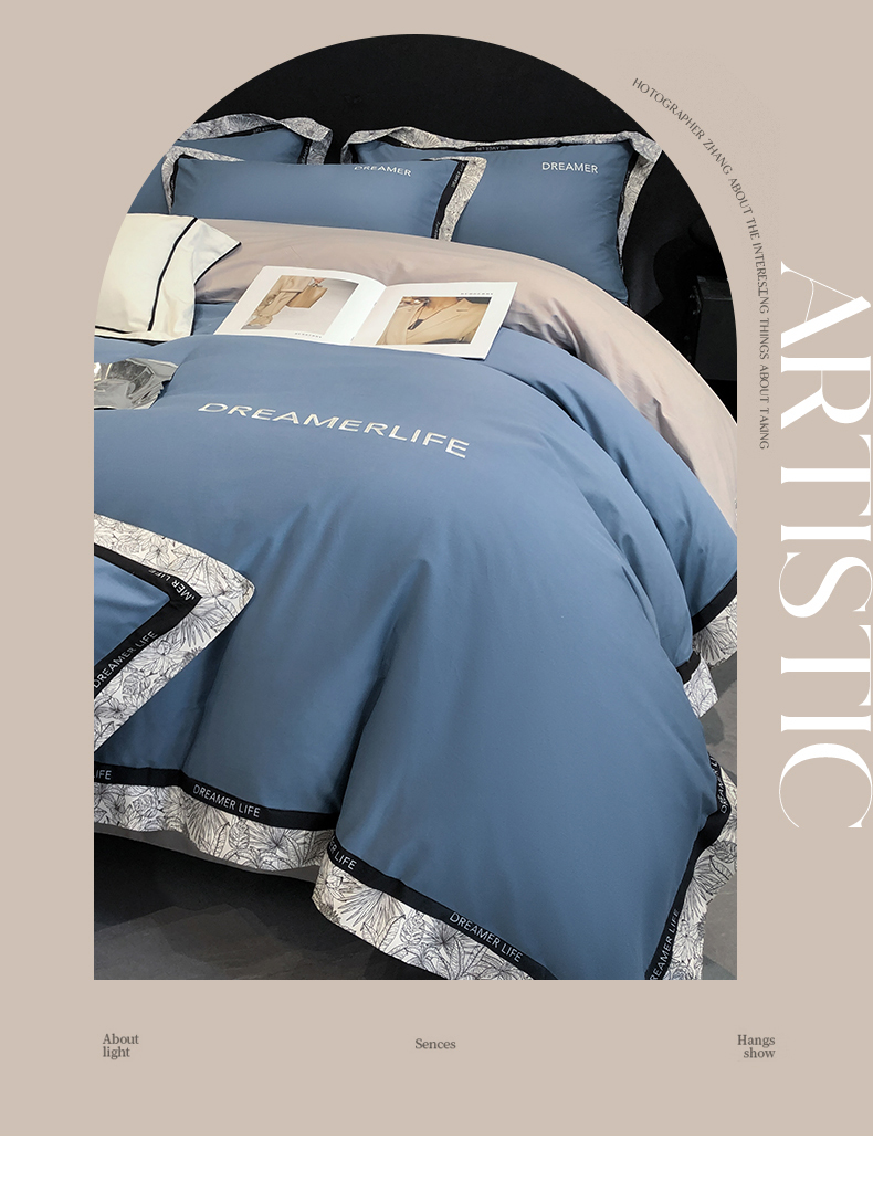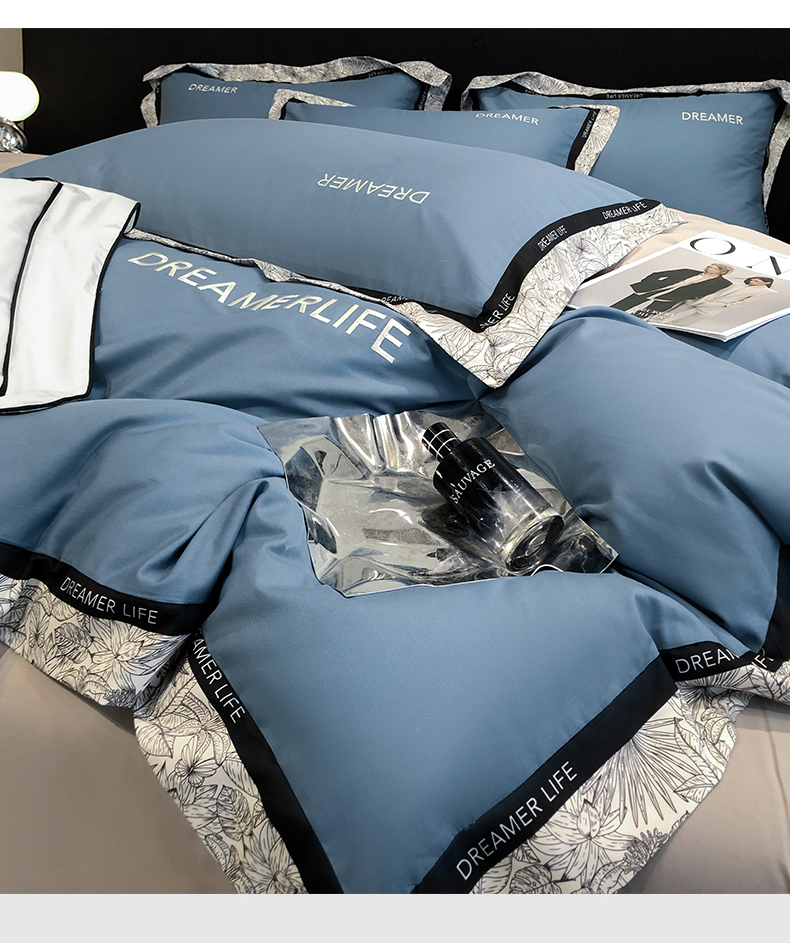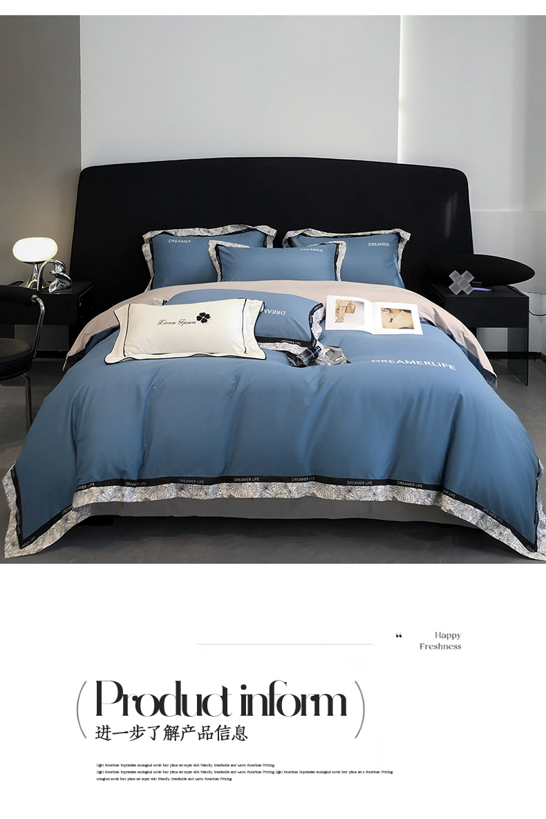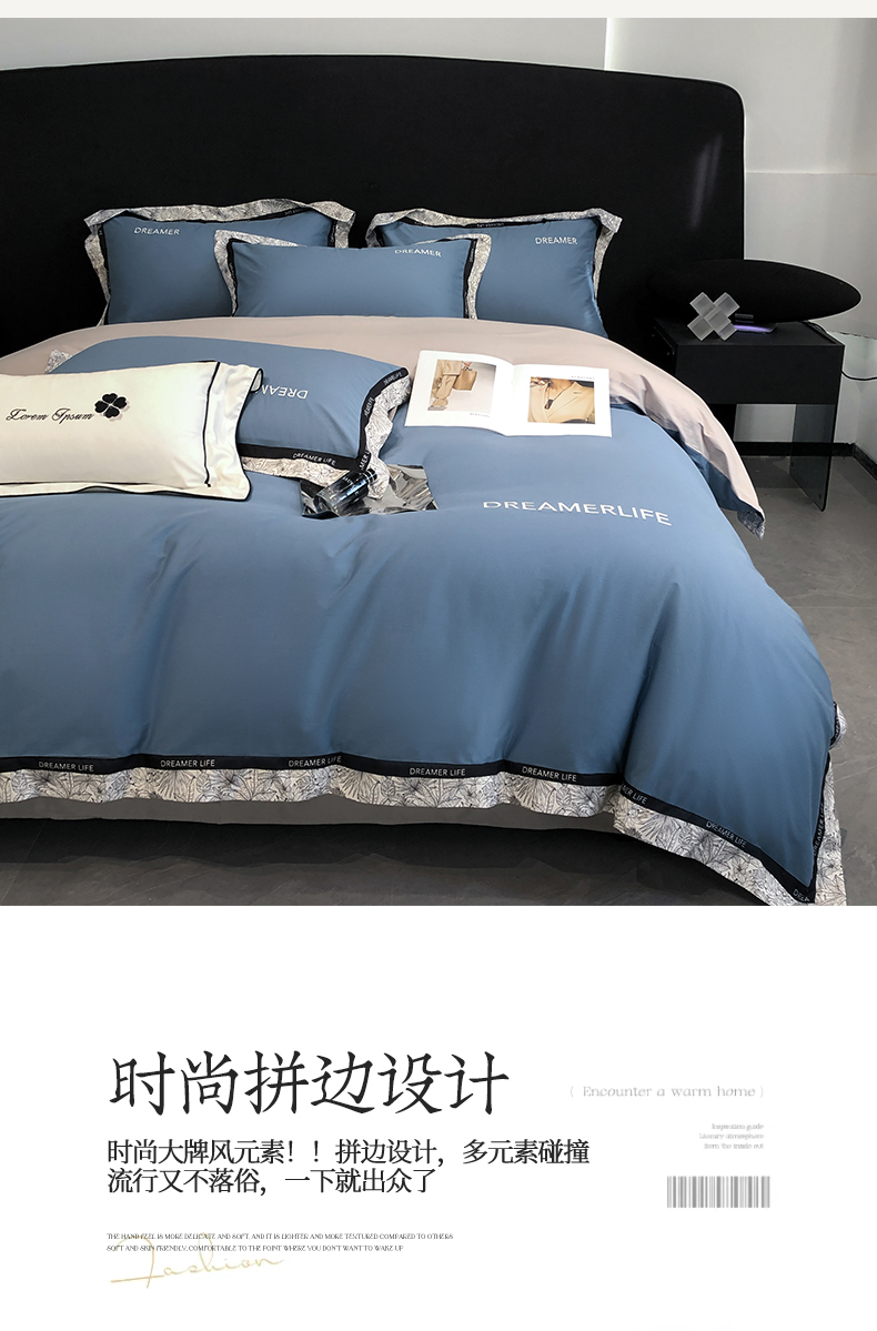 笙意家纺 2025新款全棉刺绣拼边四件套 宾利蓝+山灰