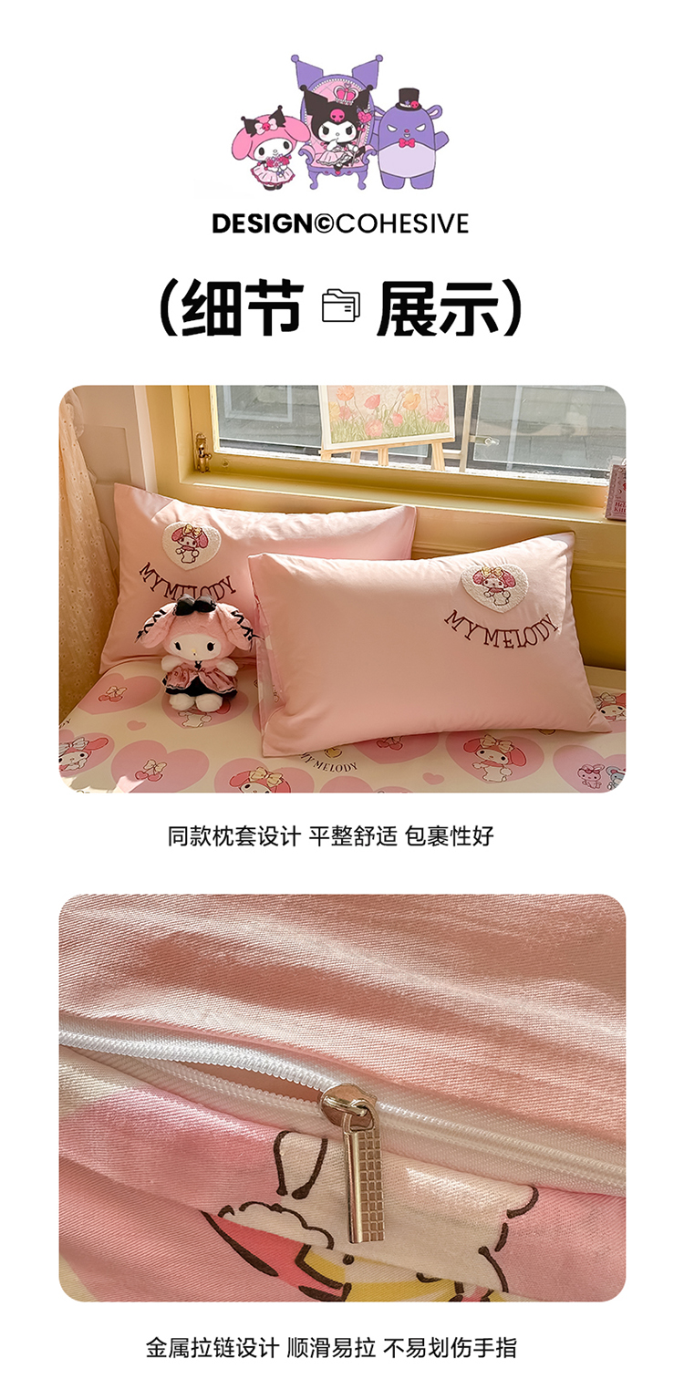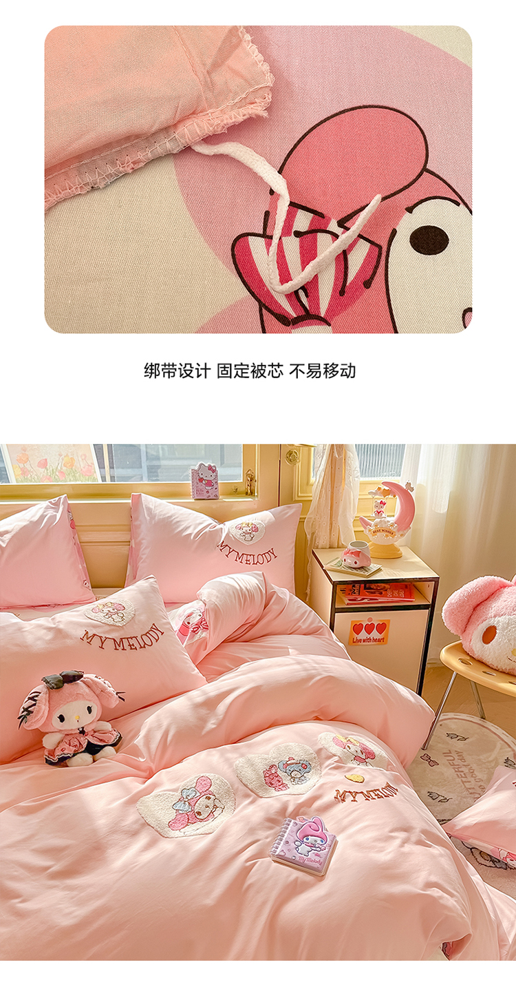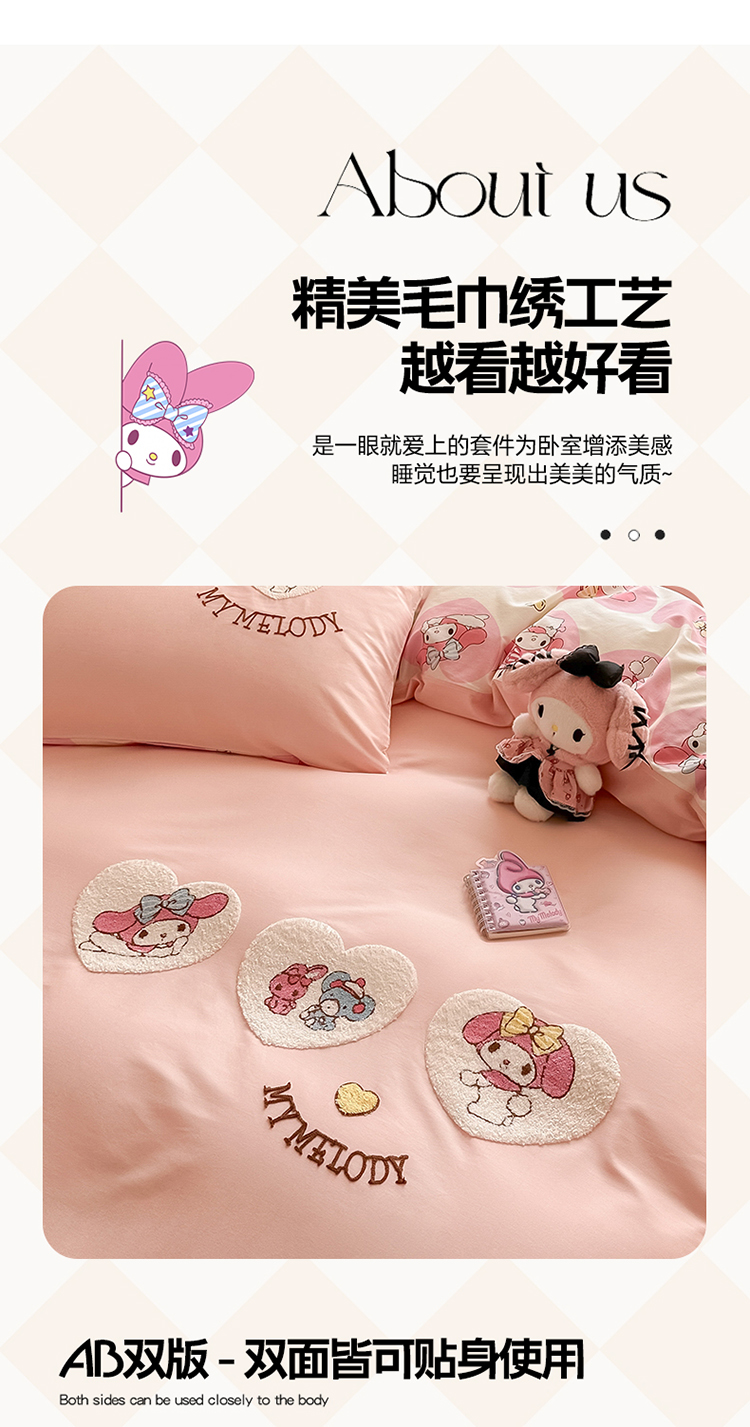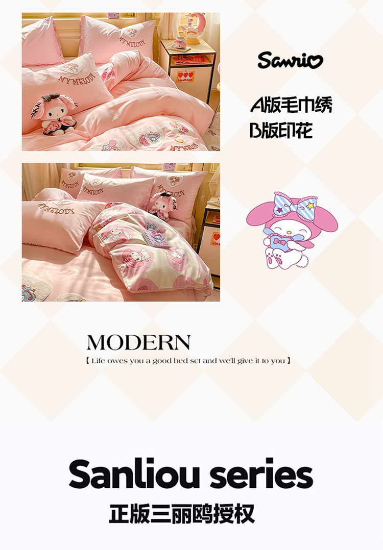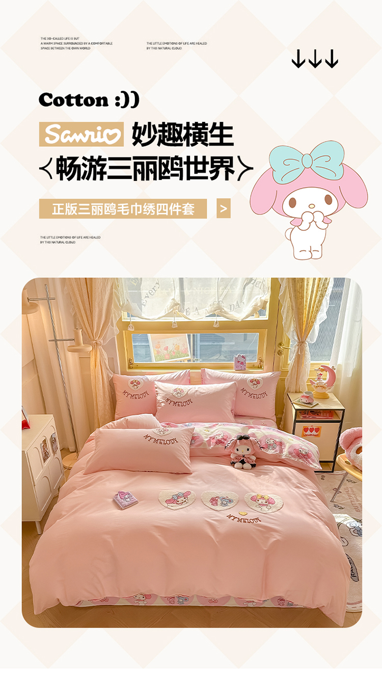 当前位置: 91家纺网 > 商品网购 > 床品套件 > 四件套 > 毛巾绣四件套 > 沐辰家居 2024新款毛巾绣正版授权三丽鸥系列 绣花款-甜心美乐蒂-浅粉