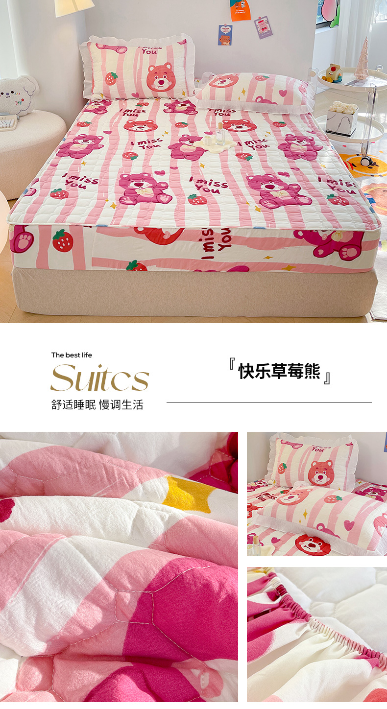• 91家纺网 家纺一手货源 找家纺 默忆 2025新款水洗棉双层纱印花夹棉床笠  快乐草莓熊