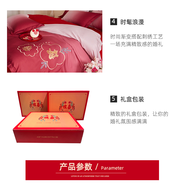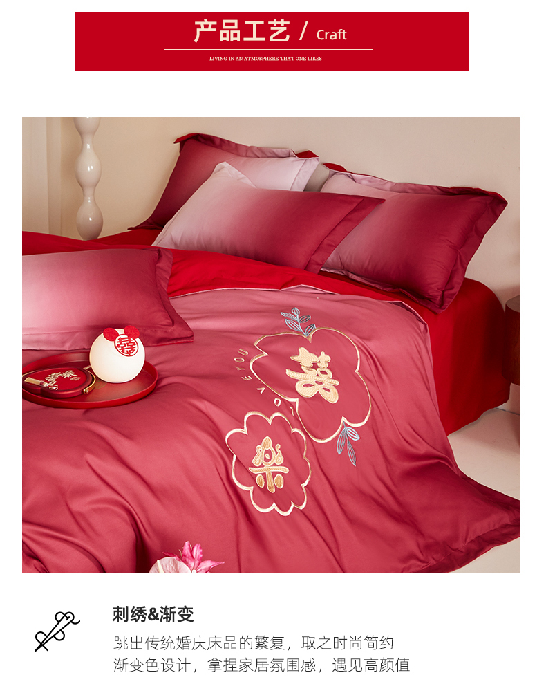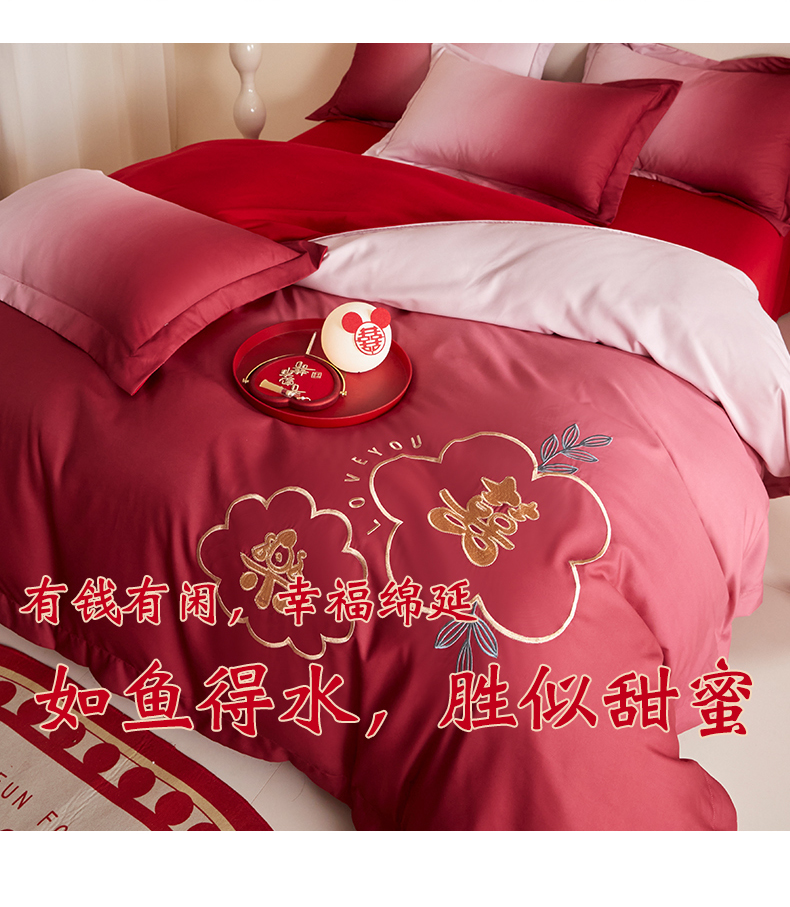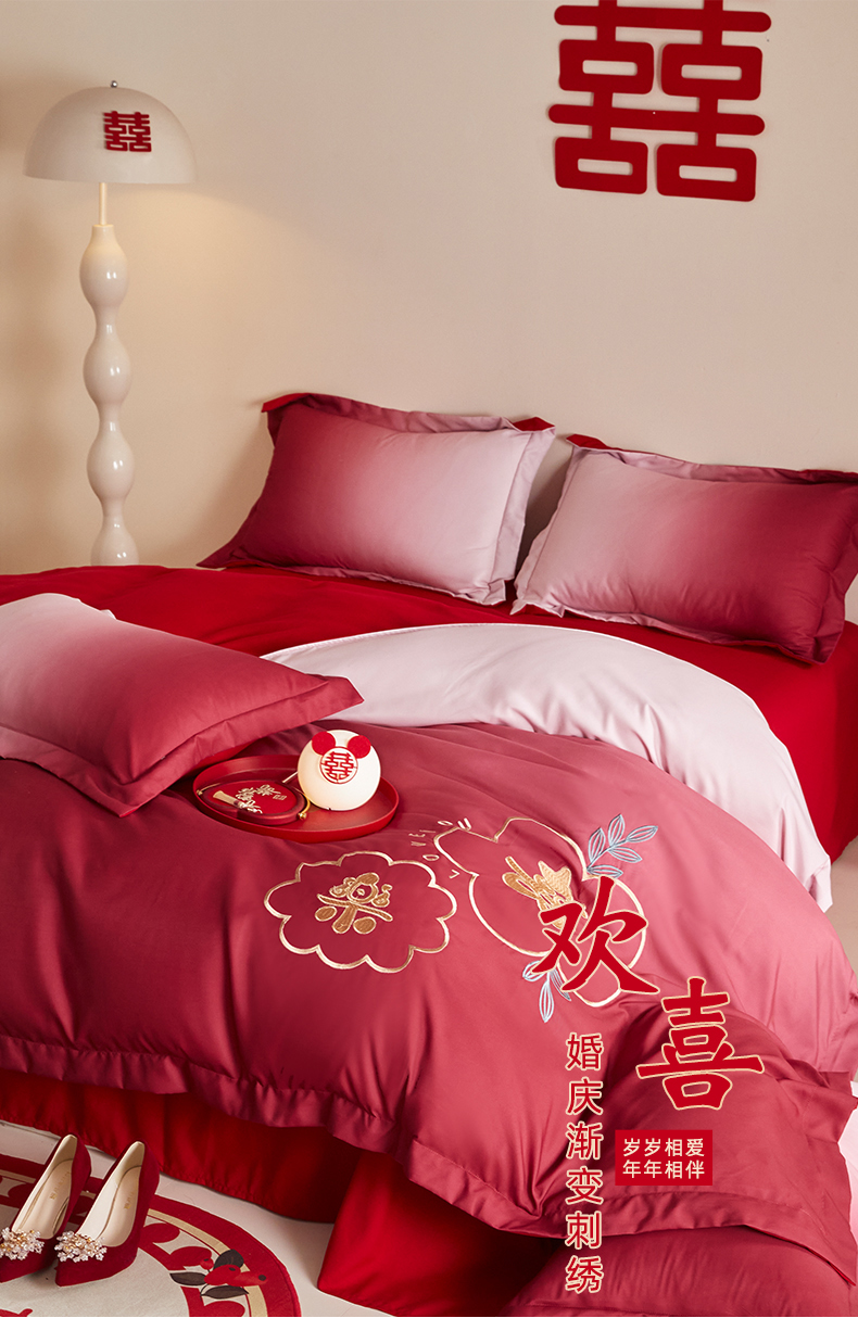 当前位置: 91家纺网 > 商品网购 > 床品套件 > 四件套 > 婚庆四件套 > 玉雅家纺 2025新款磨毛时尚浮雕花边款床裙婚庆四件套 渐变款-爱的约定