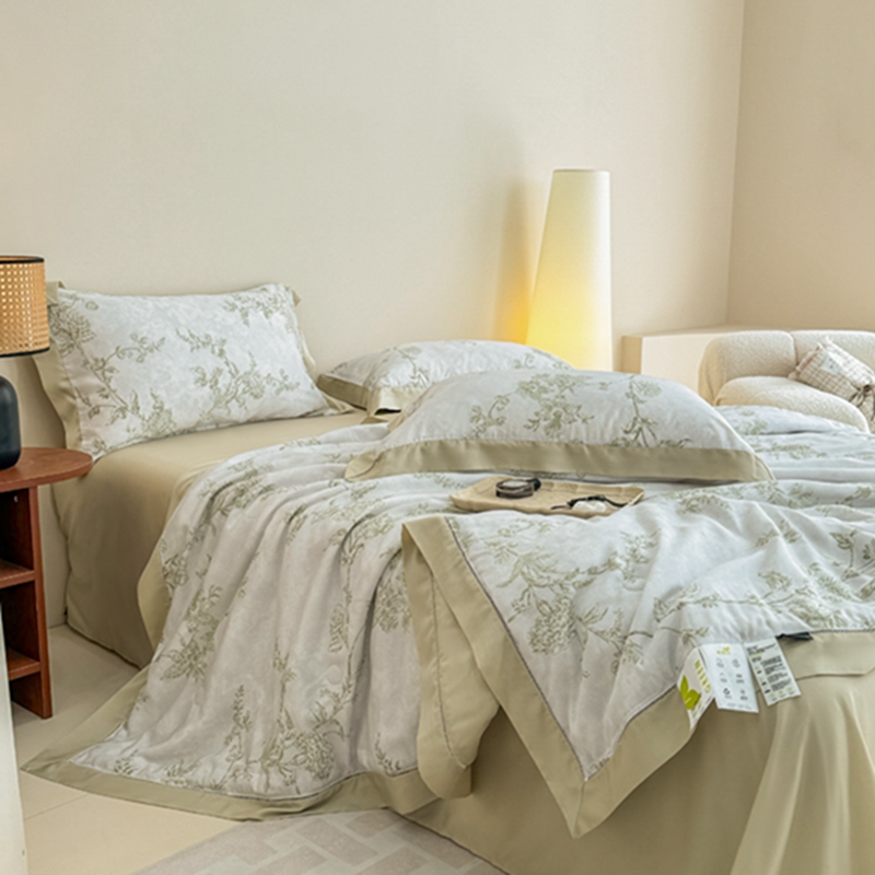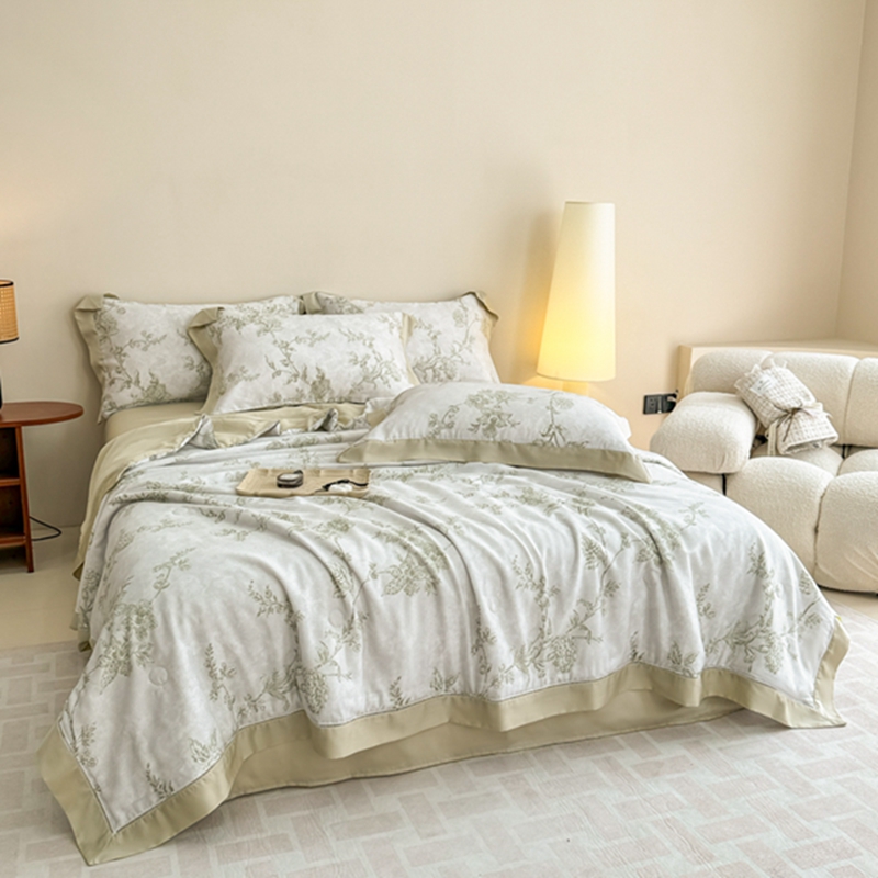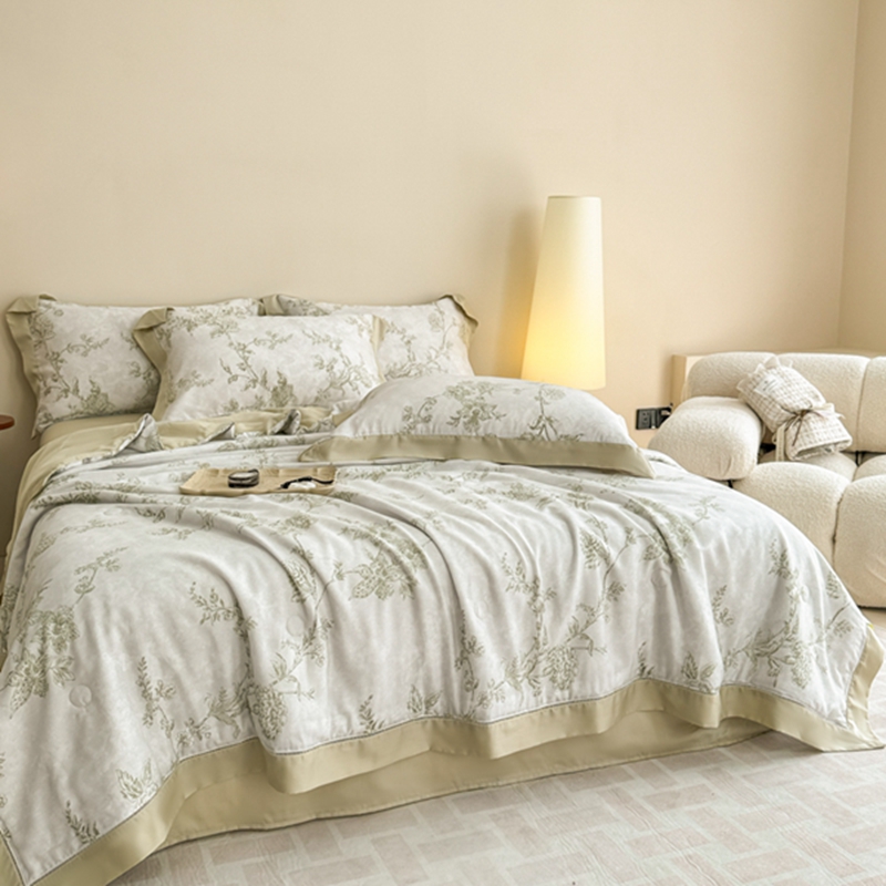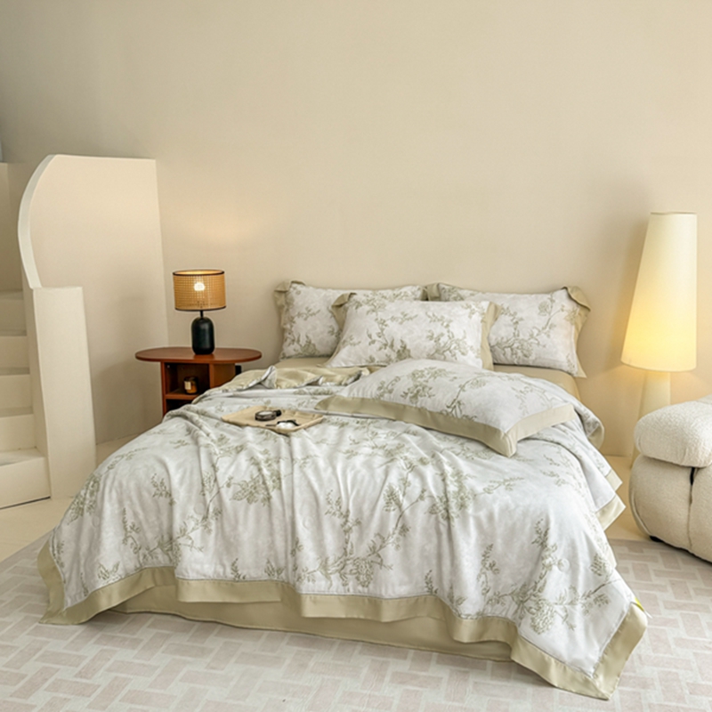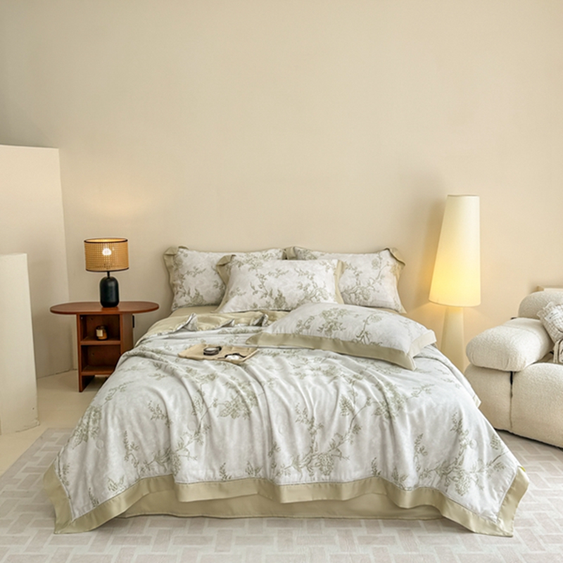 商品名称:若未2025新款法式莱赛尔天丝印花镂空夏被和夏被四件套 美人蕉(绿)