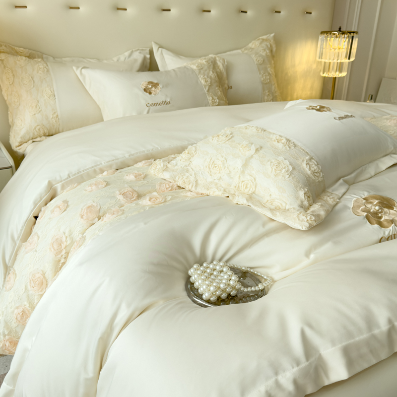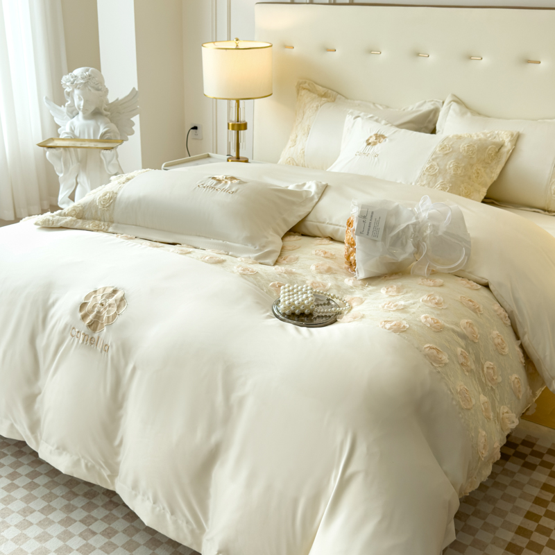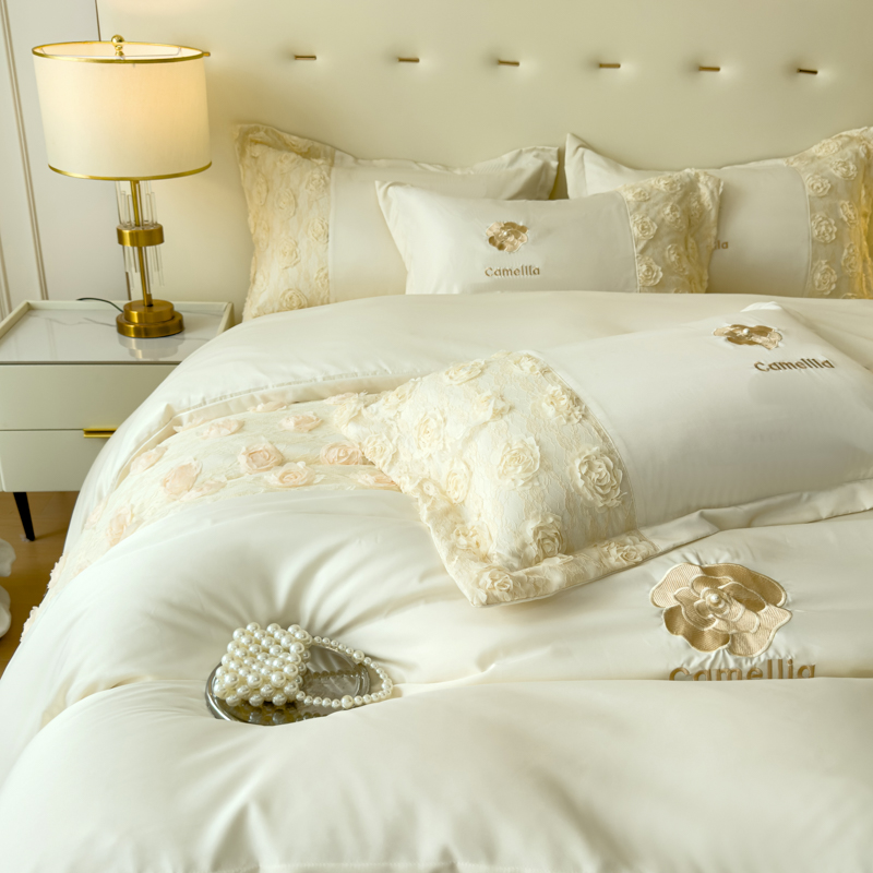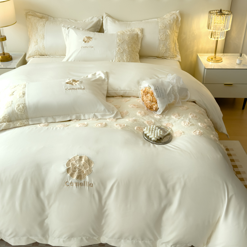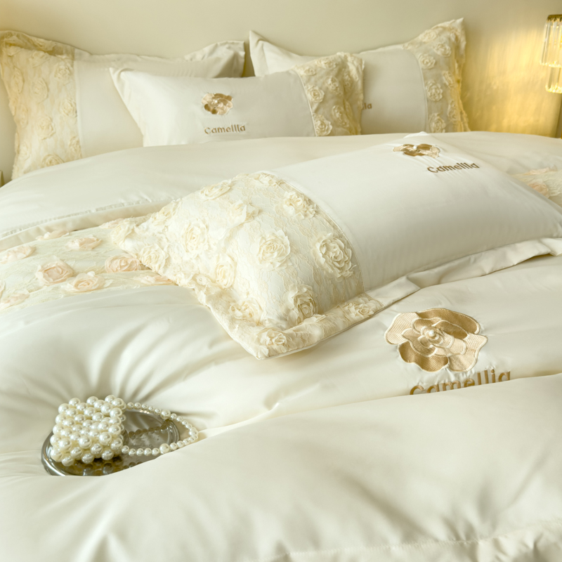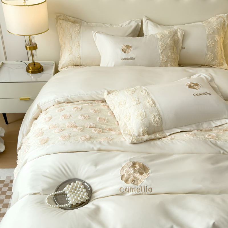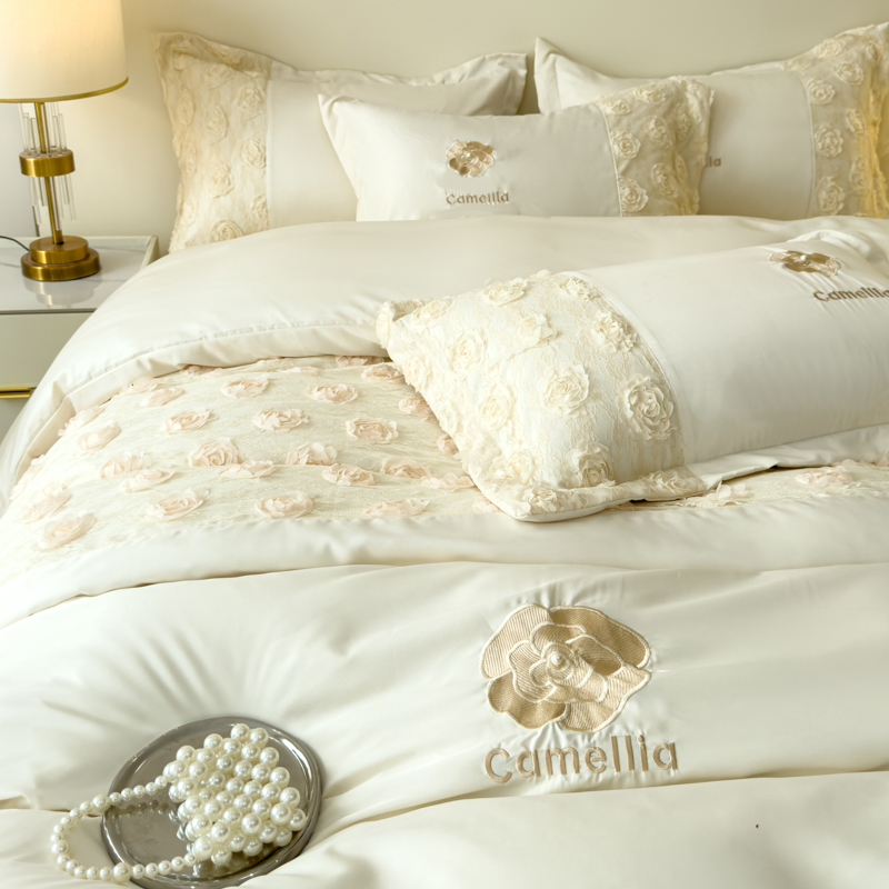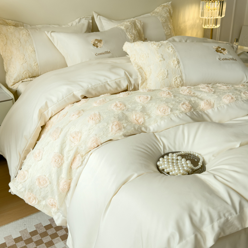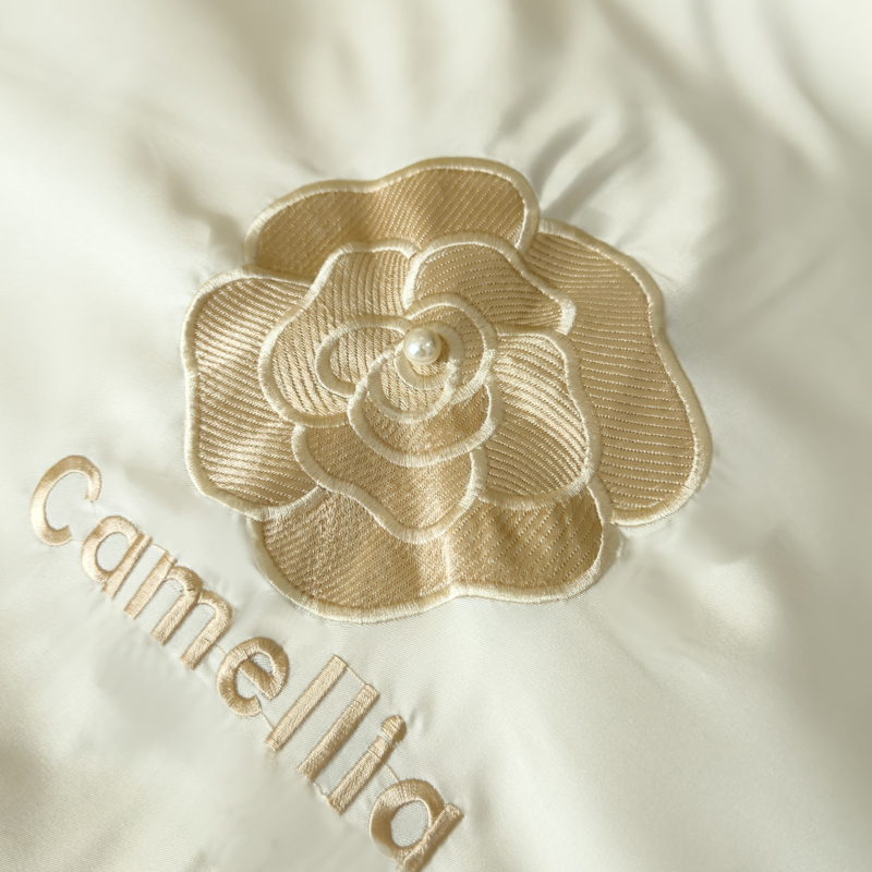 商品名称:红嘴企鹅 2025新款水洗冰丝山茶花系列四件套 山茶花奶白