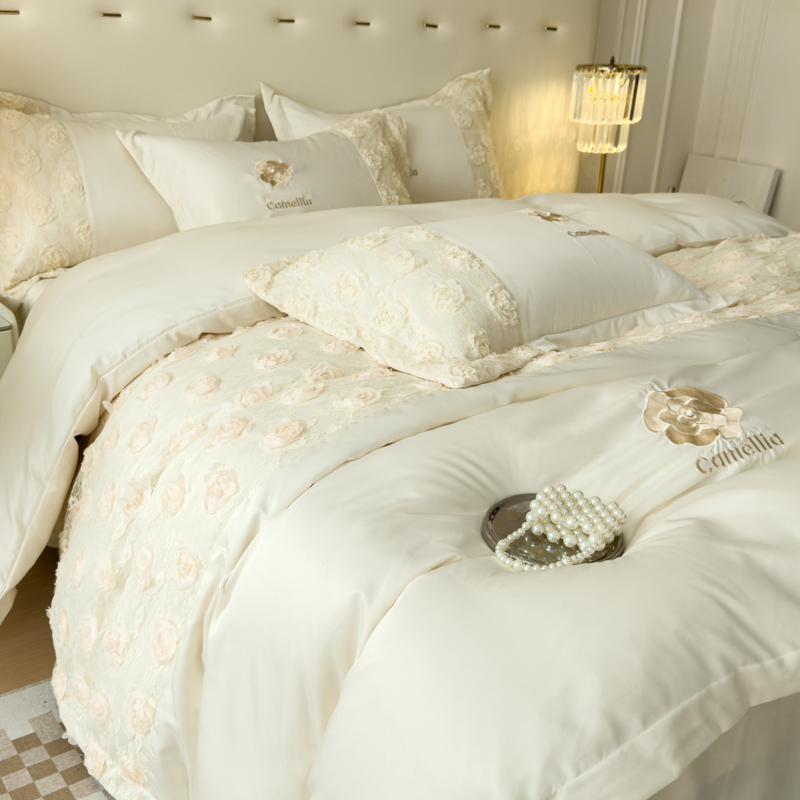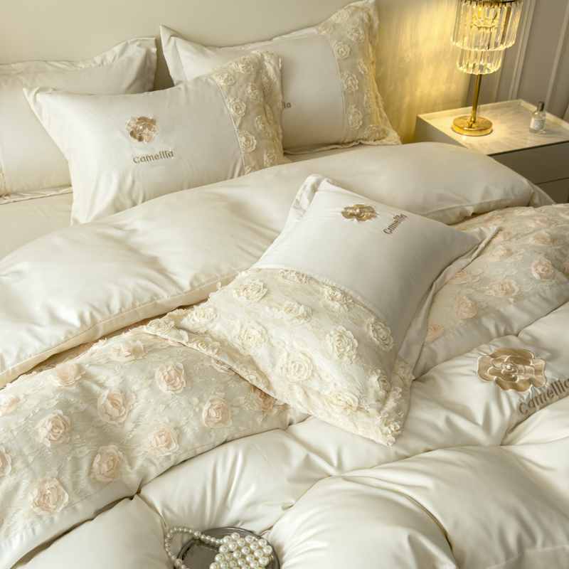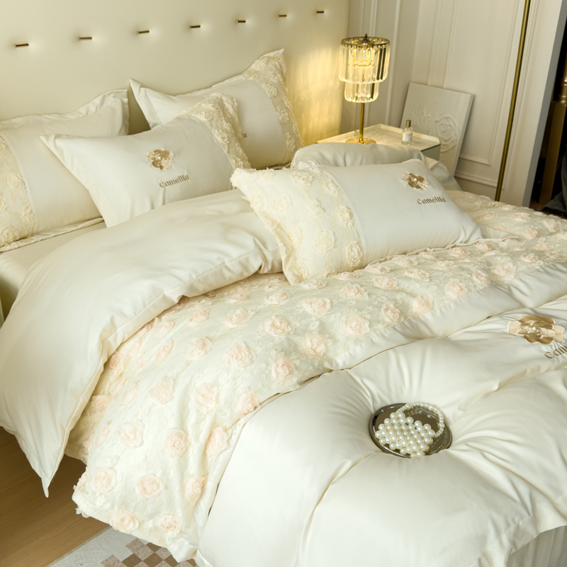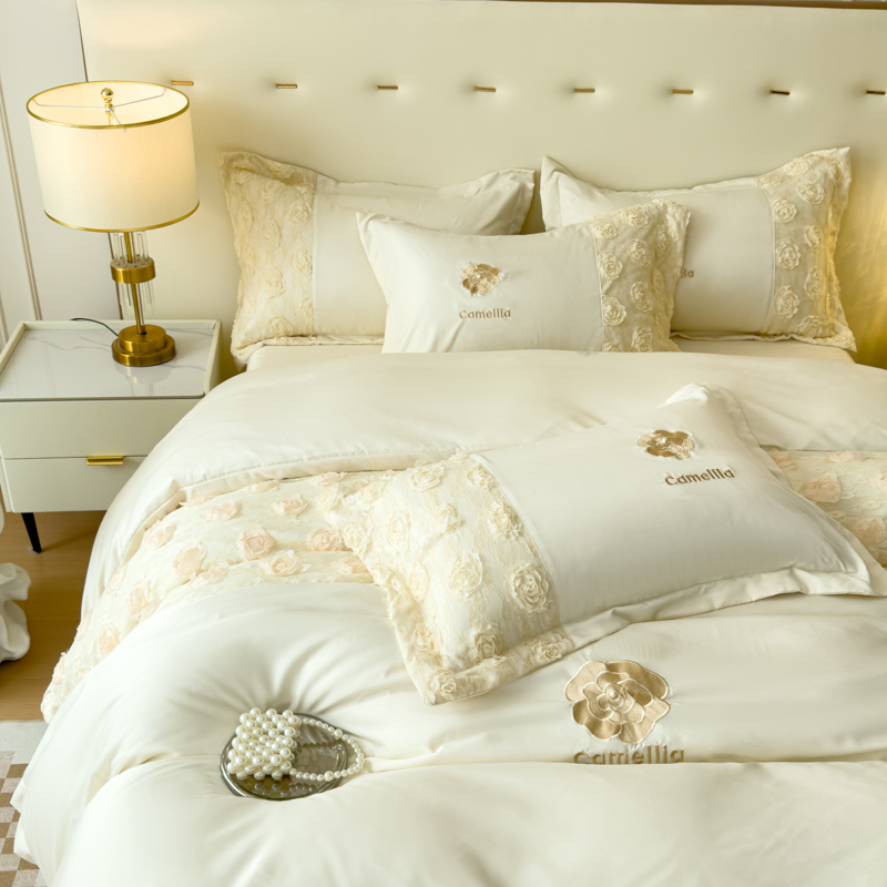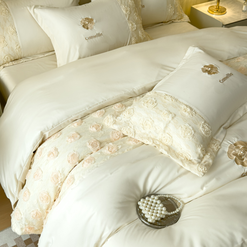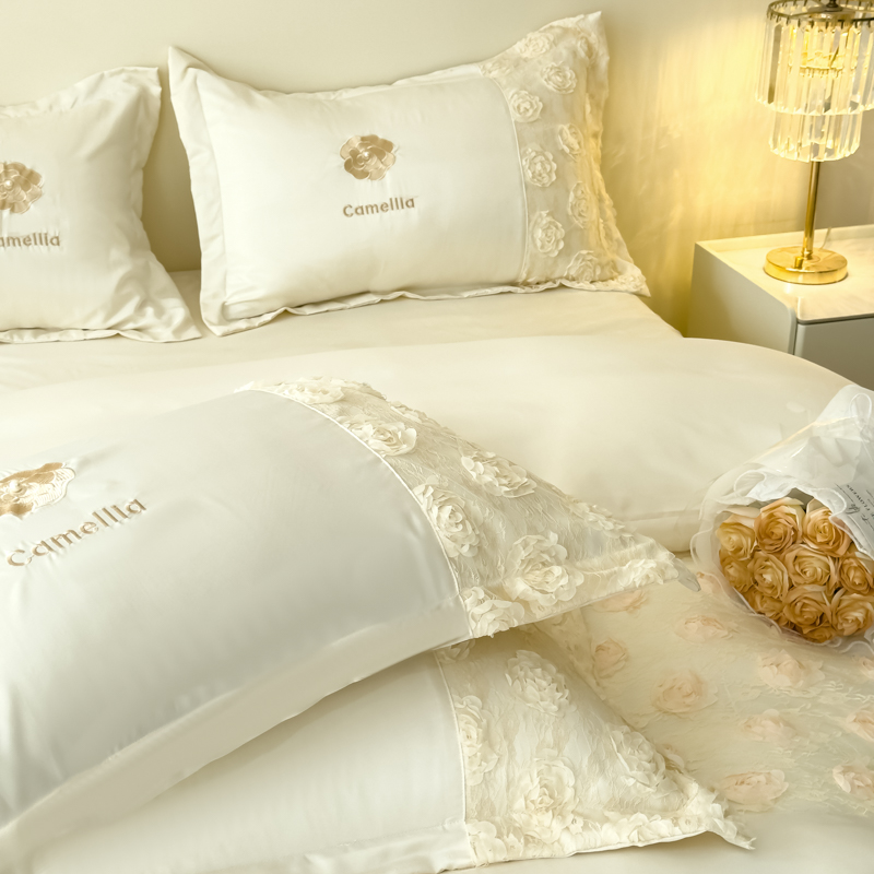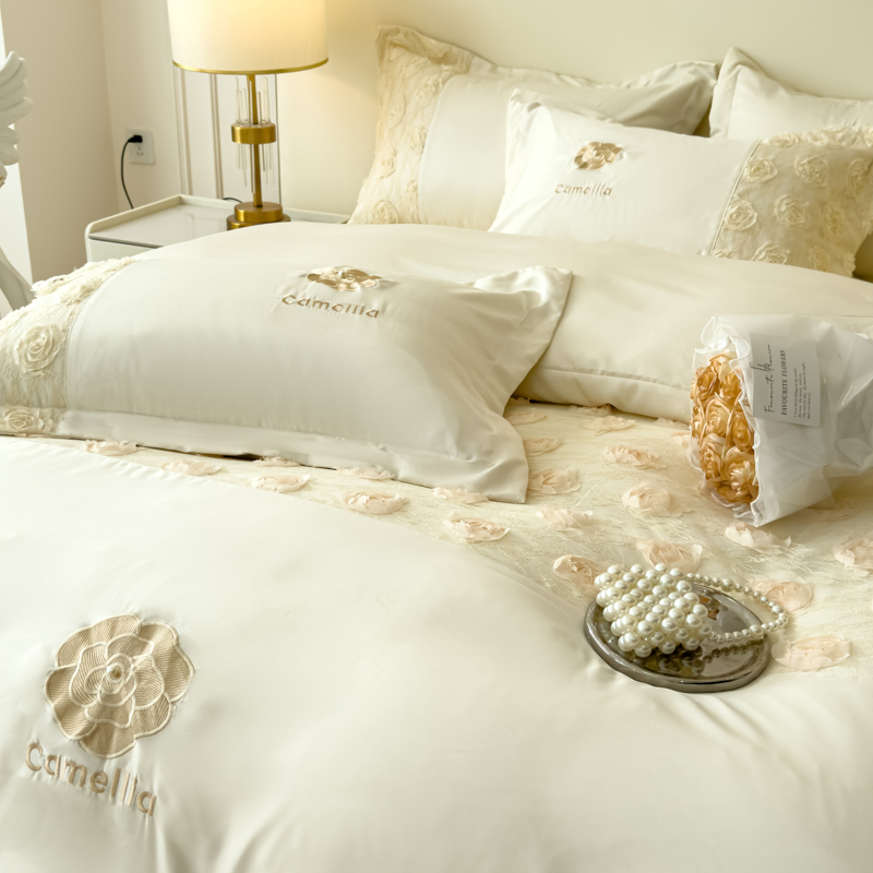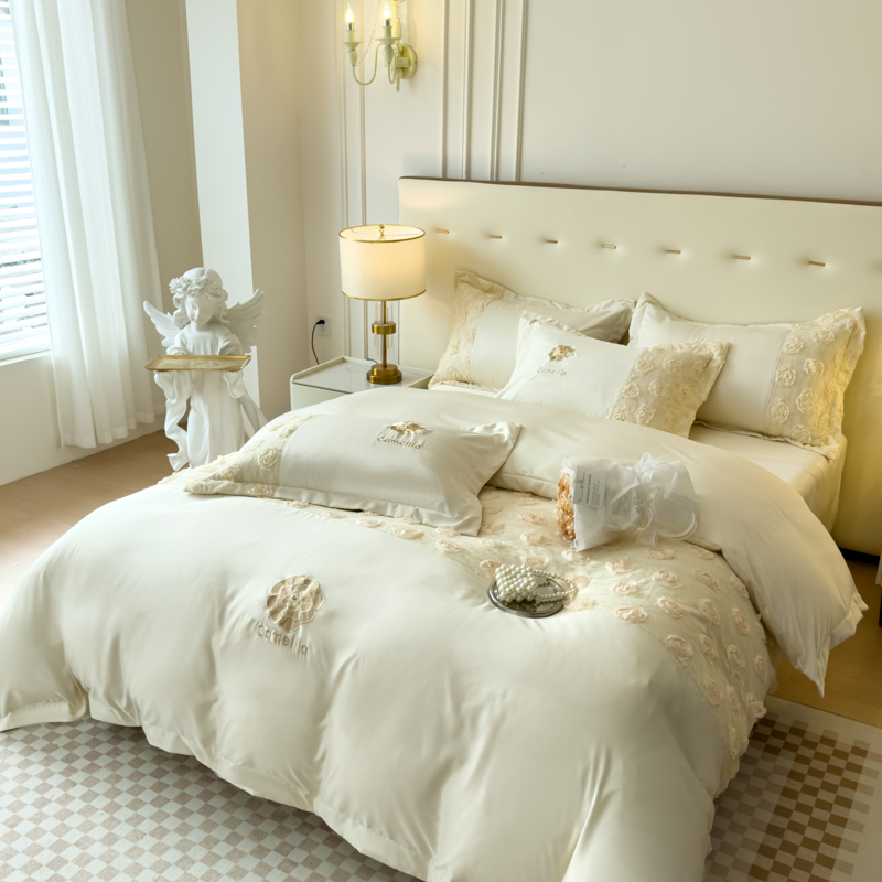 商品名称:红嘴企鹅 2025新款水洗冰丝山茶花系列四件套 山茶花奶白