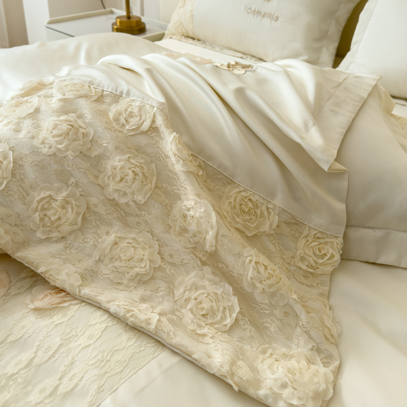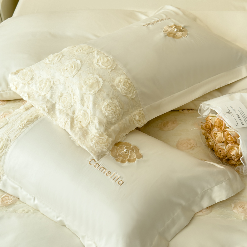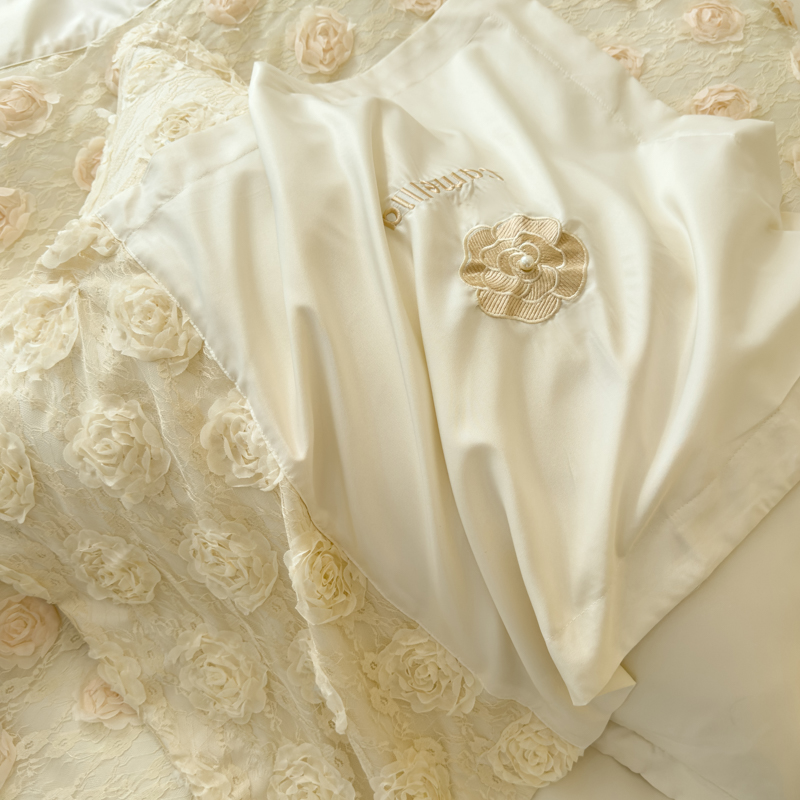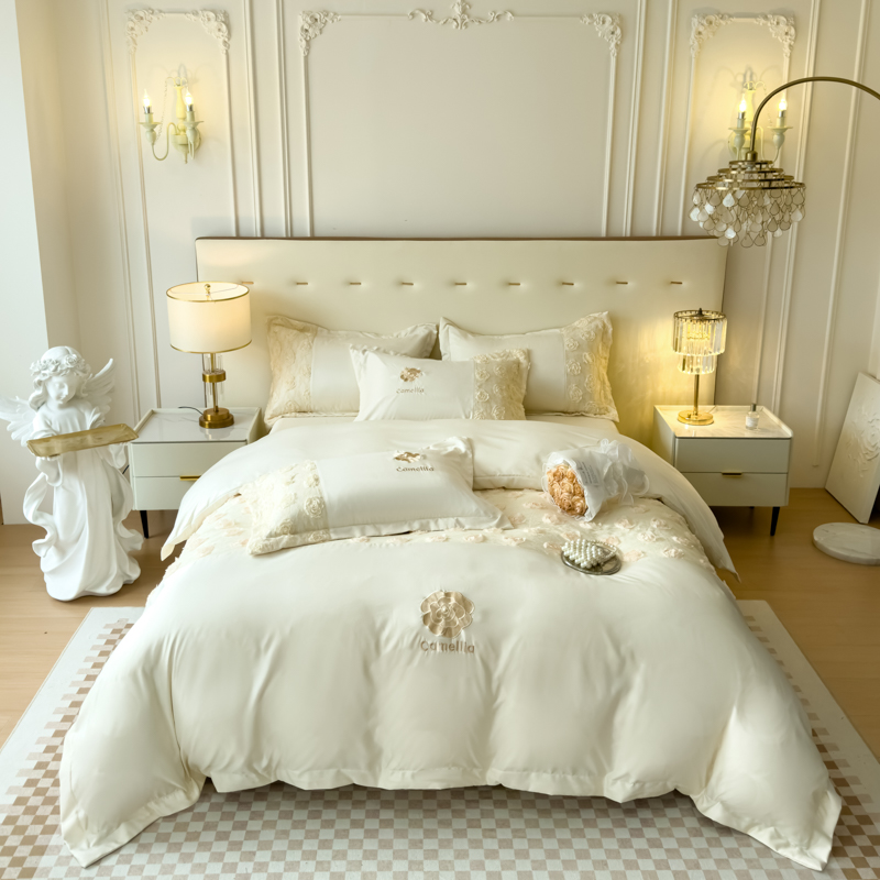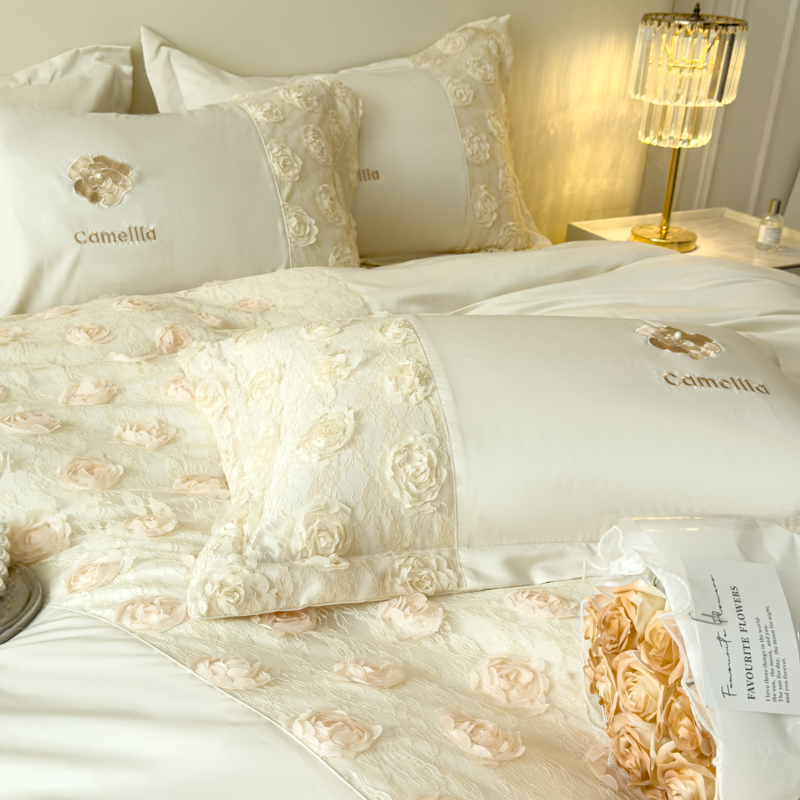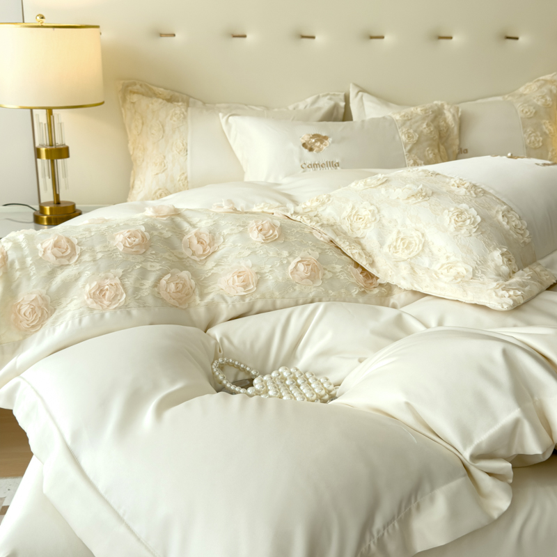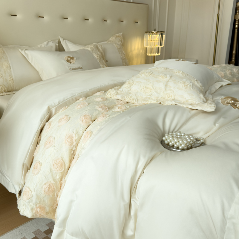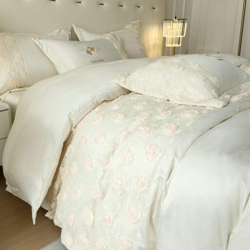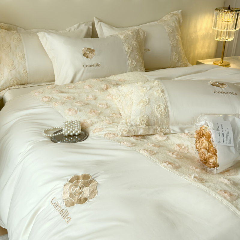 商品名称:红嘴企鹅 2025新款水洗冰丝山茶花系列四件套 山茶花奶白