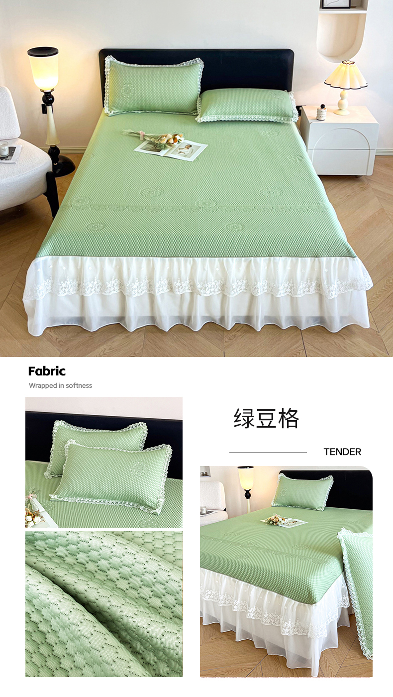 商品名称:吉祥家纺 2024新款华夫格冰豆豆凉感床裙套件 绿豆格