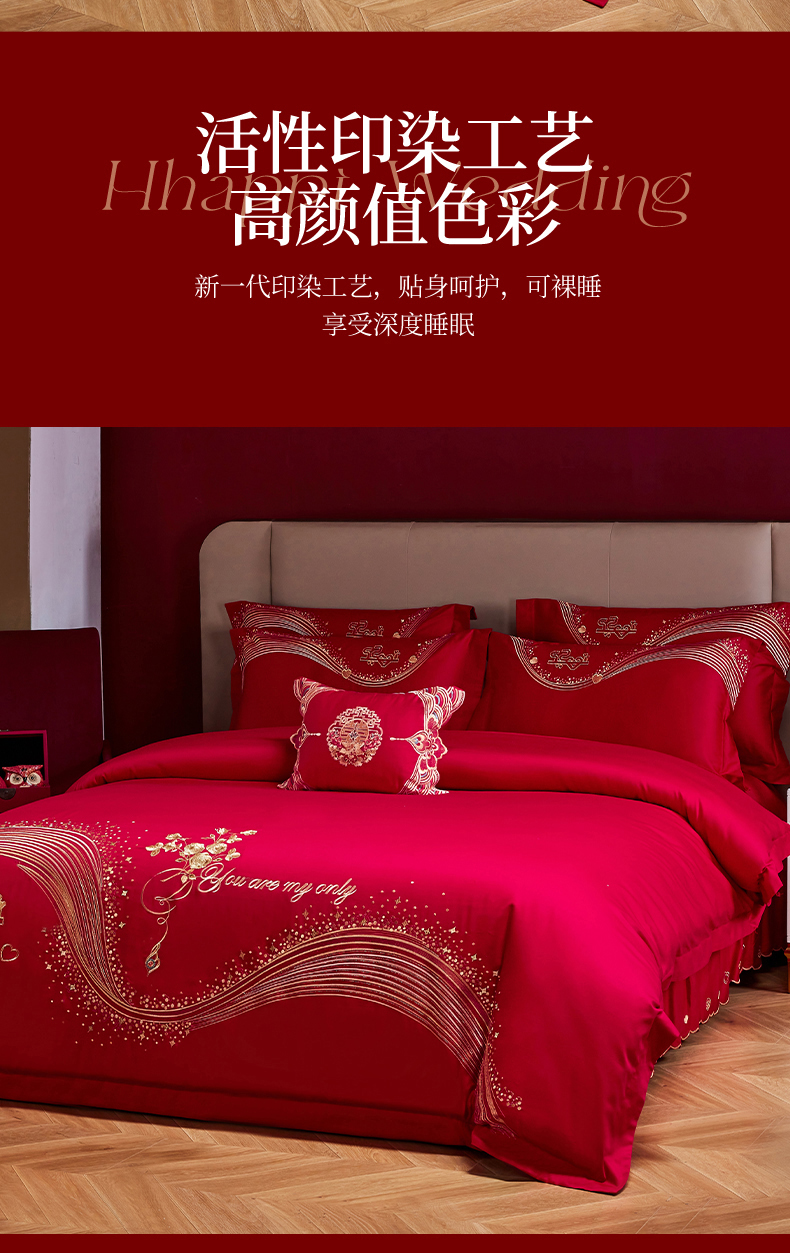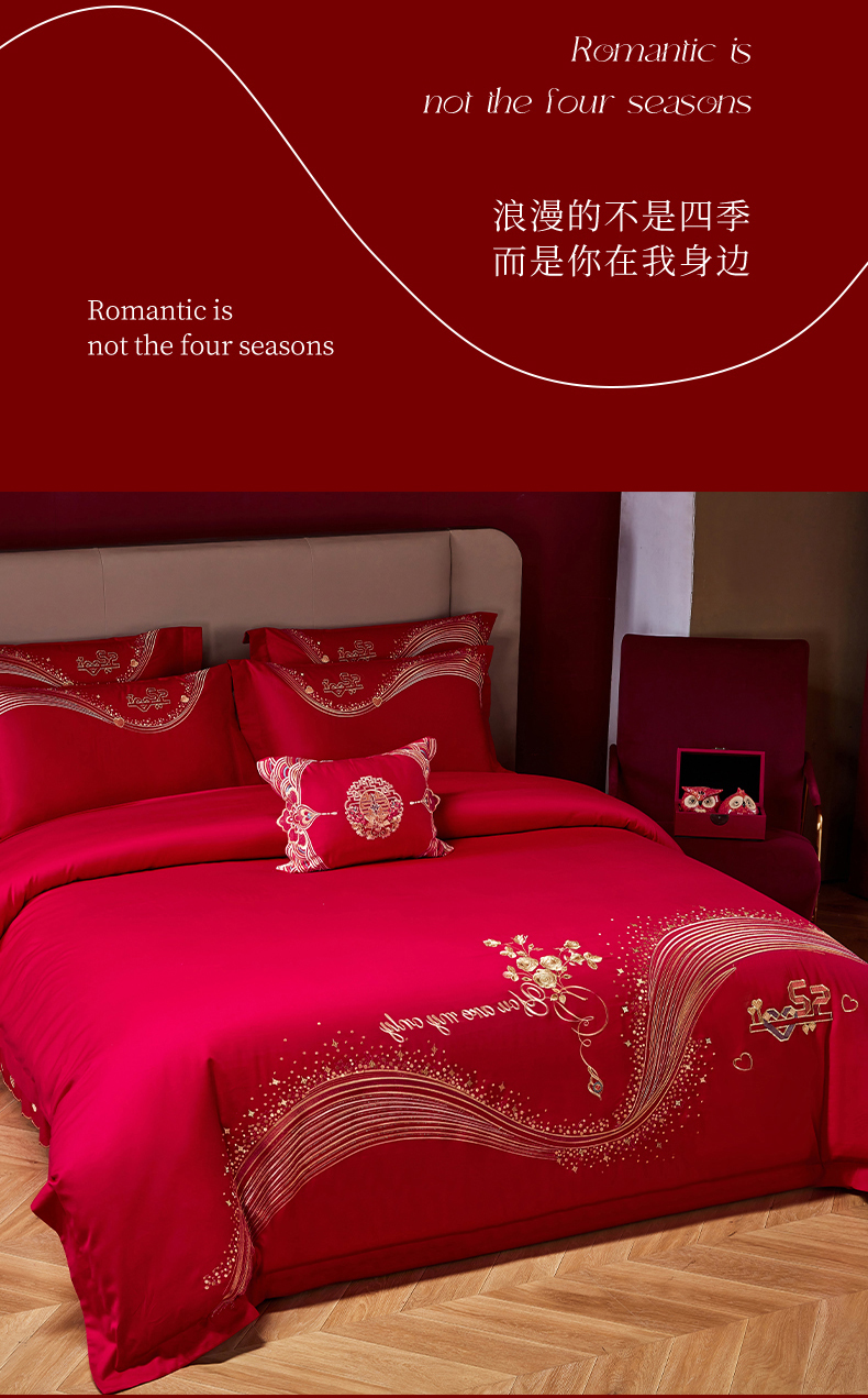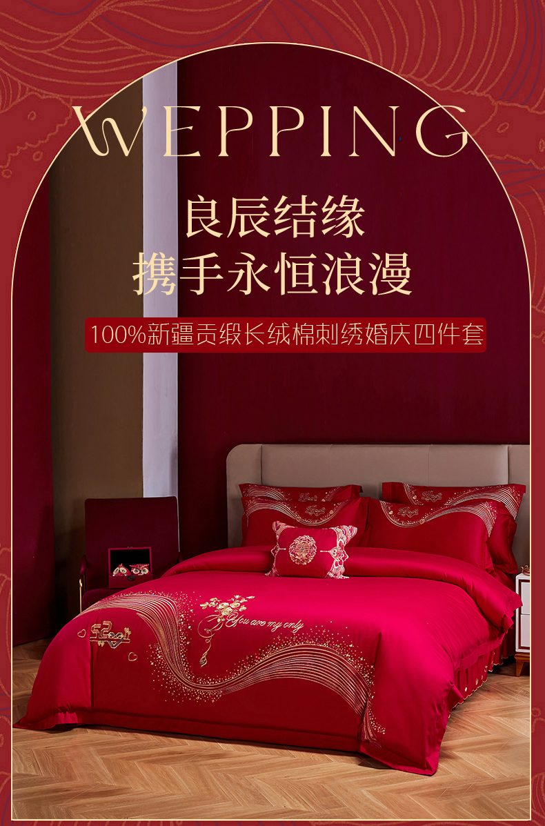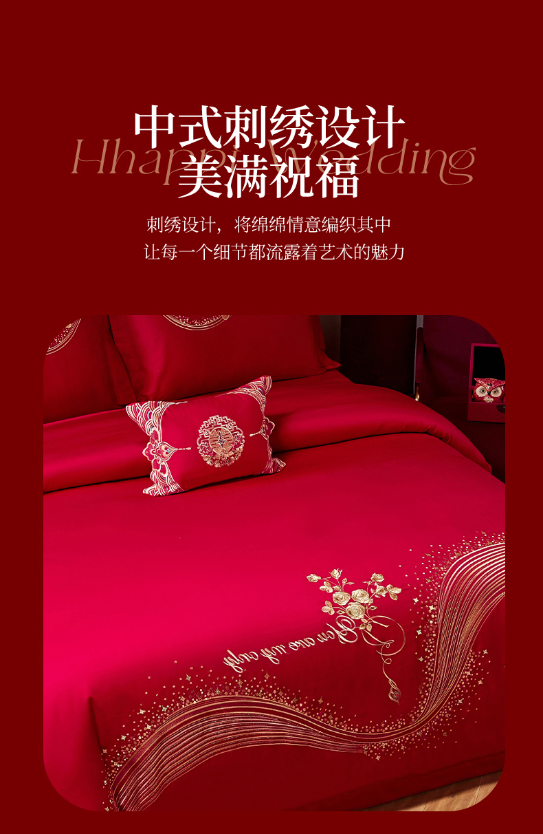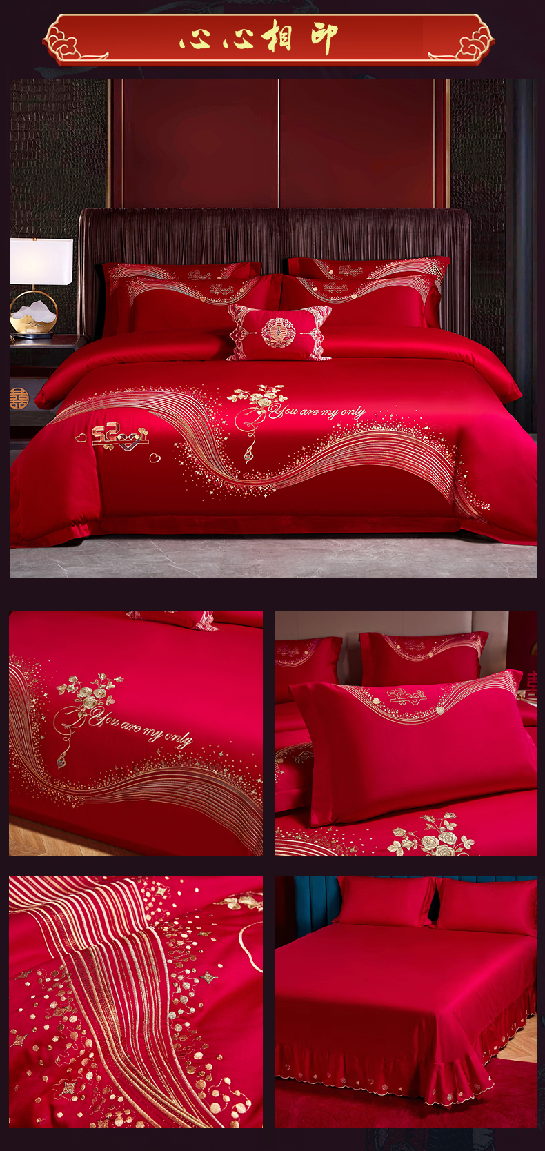 商品名称:晶缦家纺 2024纯棉全棉60支贡缎长绒棉刺绣花婚庆四件套--绣花贴边床单款 心心相印