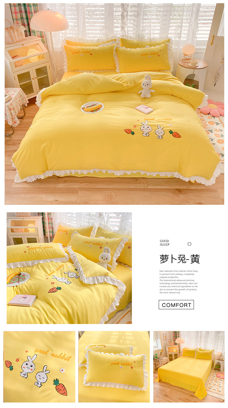 商品名称:秋艳家纺 2024新款韩式花边毛巾绣四件套 萝卜兔-黄