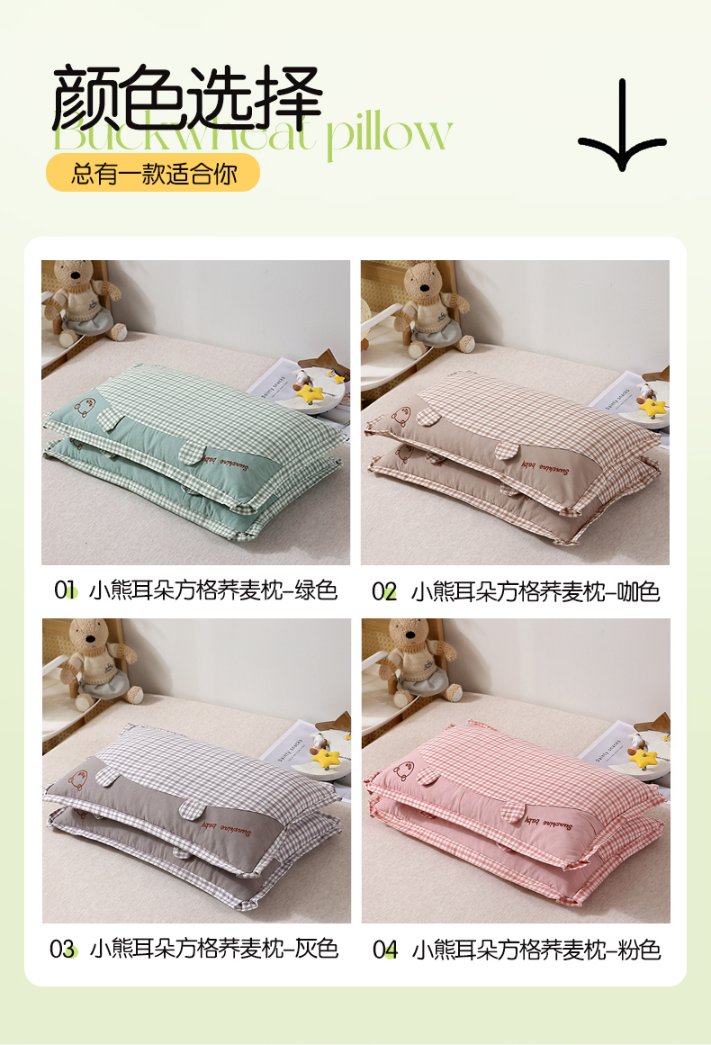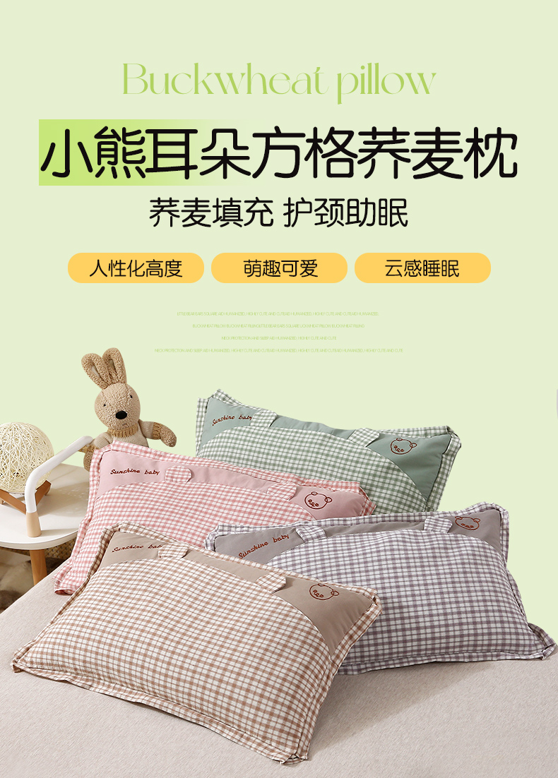 当前位置: 91家纺网 > 商品网购 > 枕头/枕芯/保健枕/颈椎枕 > 普通枕芯 > 梦叶草 2024新款全棉水洗棉儿童枕头纯荞麦枕芯小熊格子30×50cm荞麦枕 小熊耳朵方格荞麦枕-绿色30*50/只