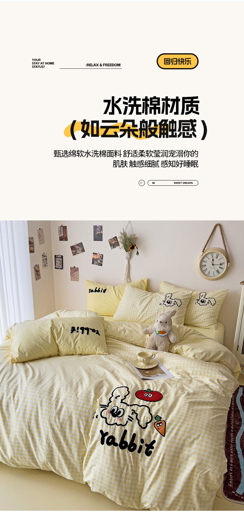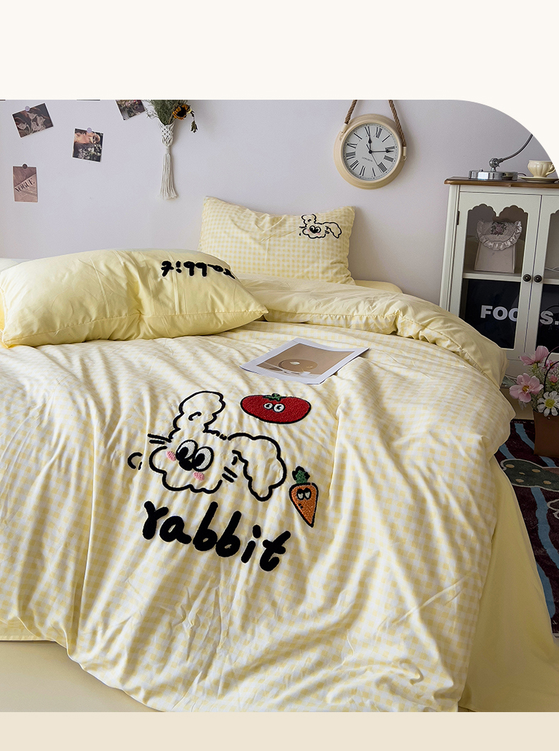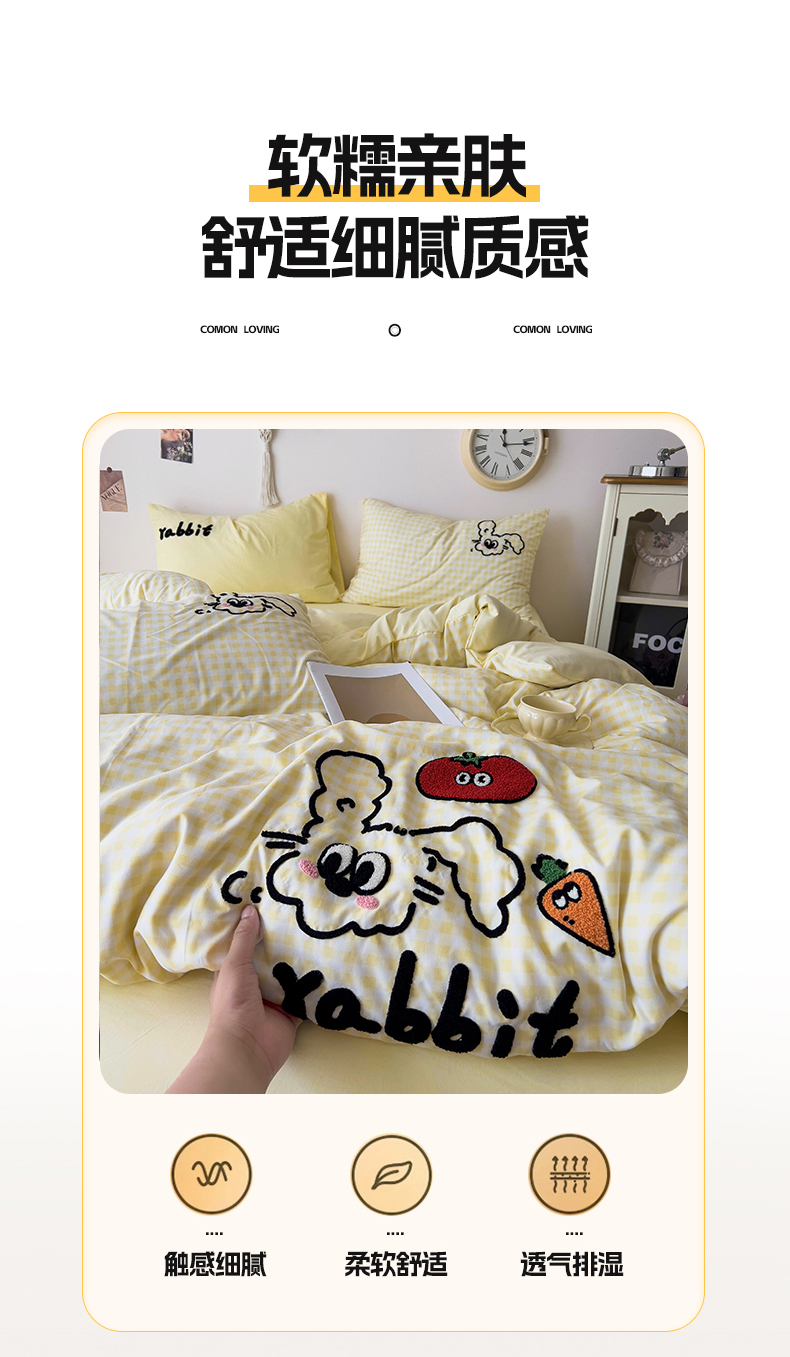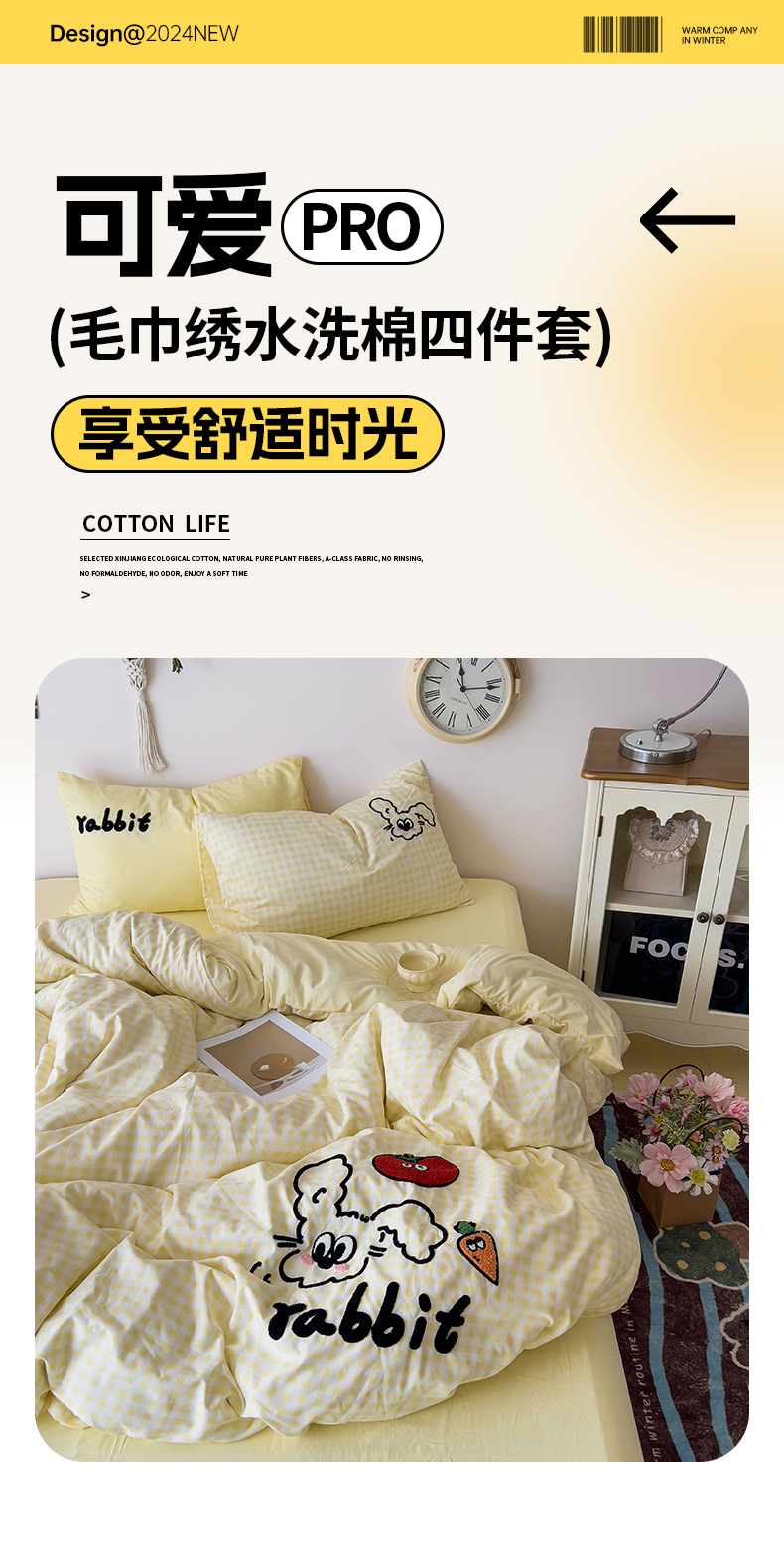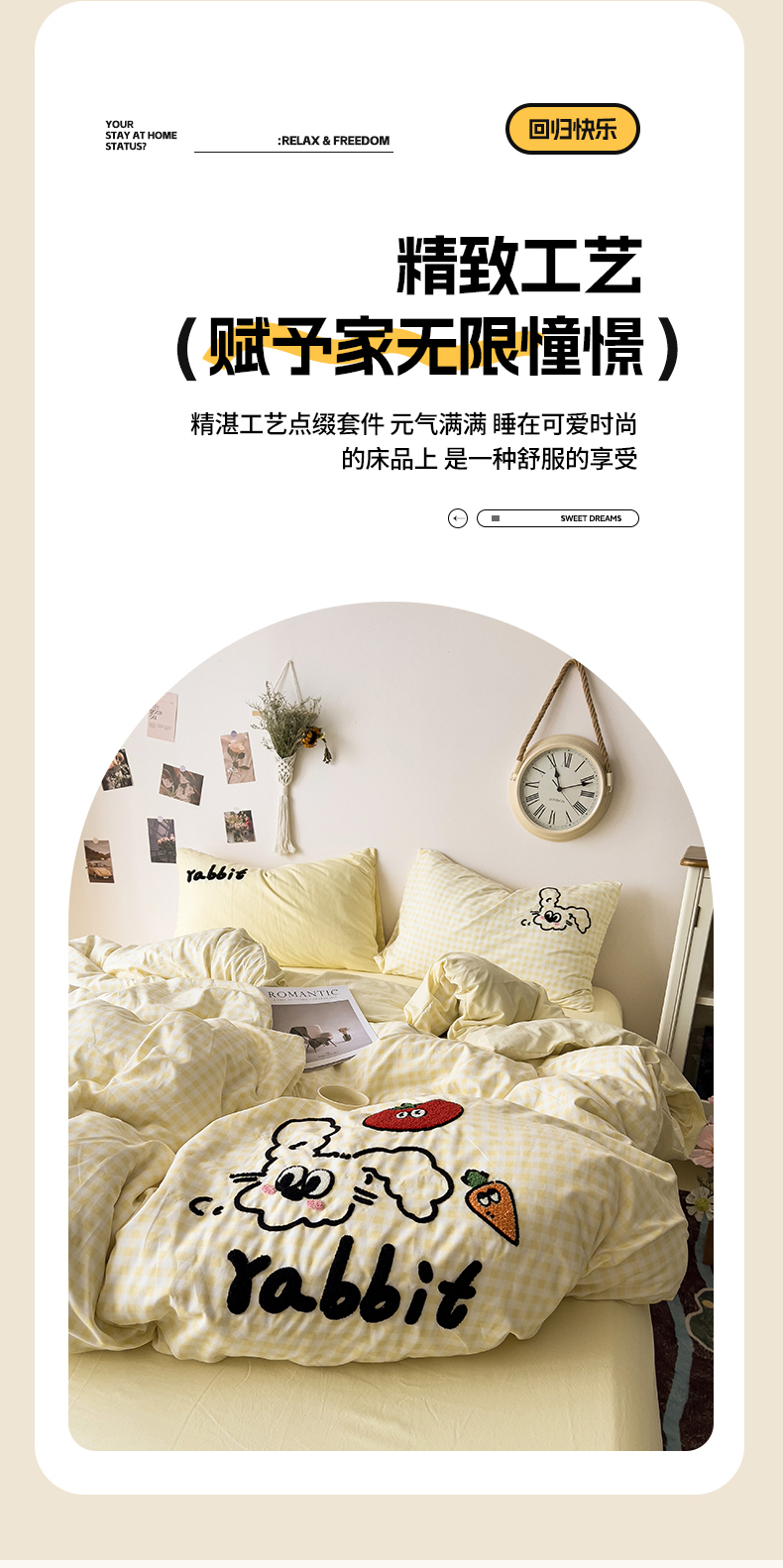 当前位置: 91家纺网 > 商品网购 > 床品套件 > 四件套 > 水洗棉四件套 > 尤米 2024新款可爱萝卜兔水洗棉毛巾绣四件套 萝卜兔-嫩黄