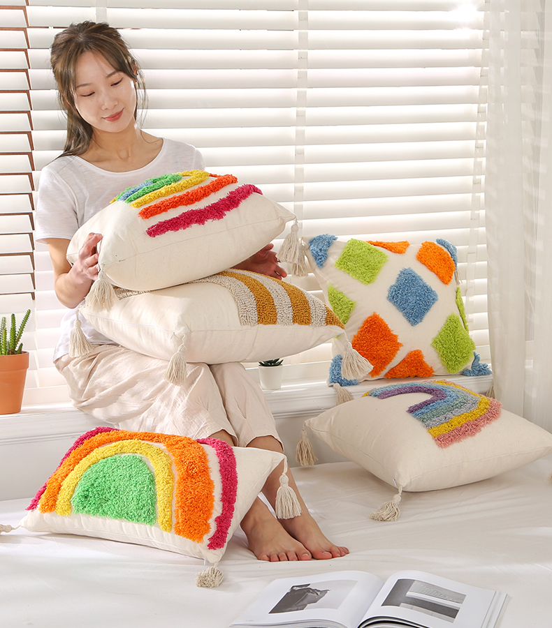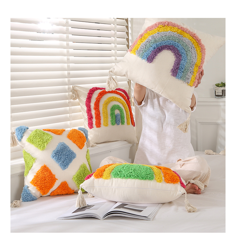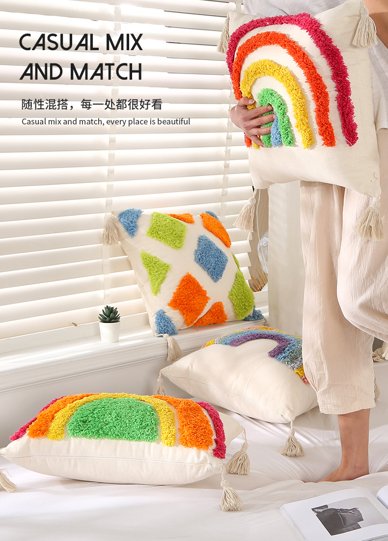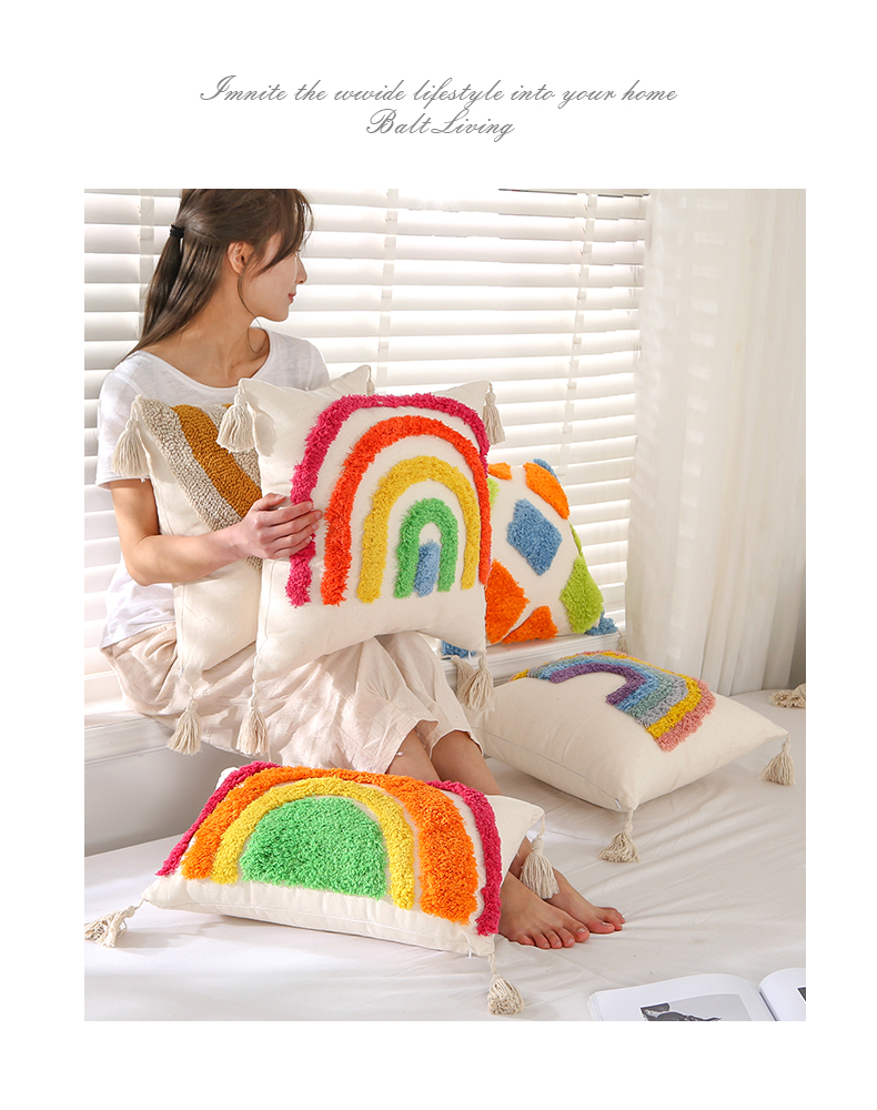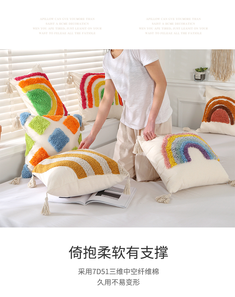 囍莱家纺 2024新款簇绒流苏彩虹抱枕 彩虹-长彩