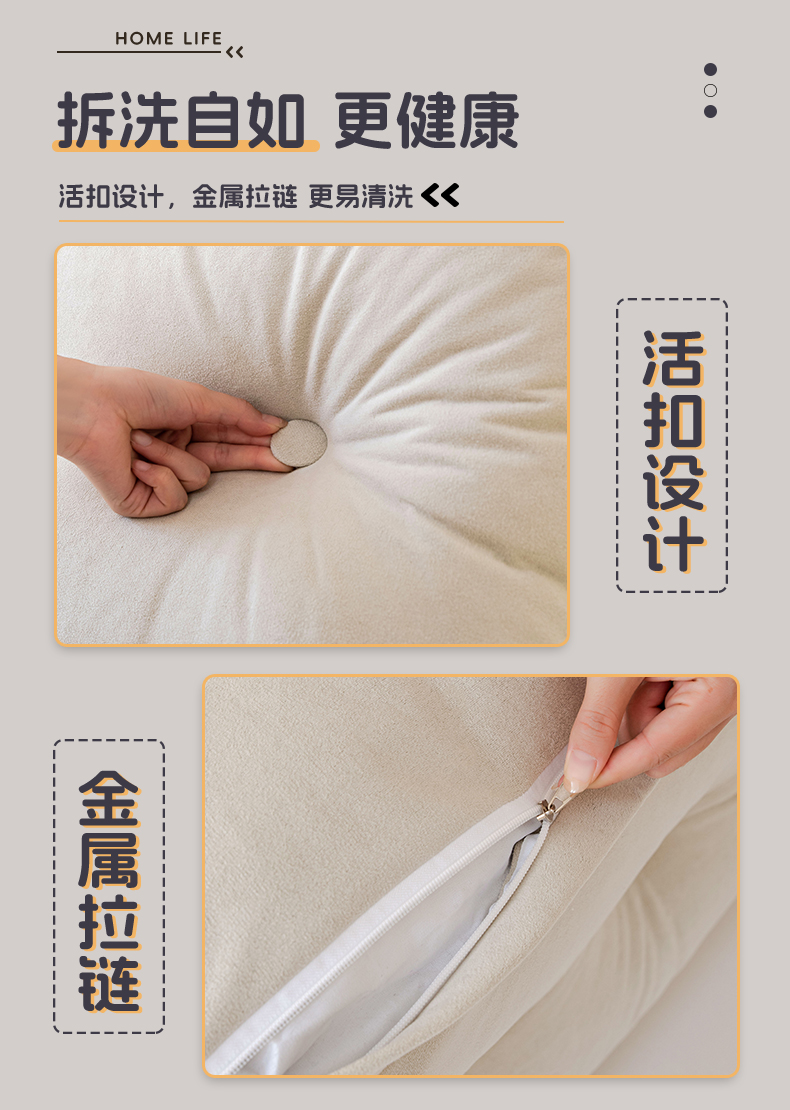 (总)碧尔家居 2025新款简约猫长条机械钉扣水洗棉床头靠枕,米黄,浅蓝,银灰