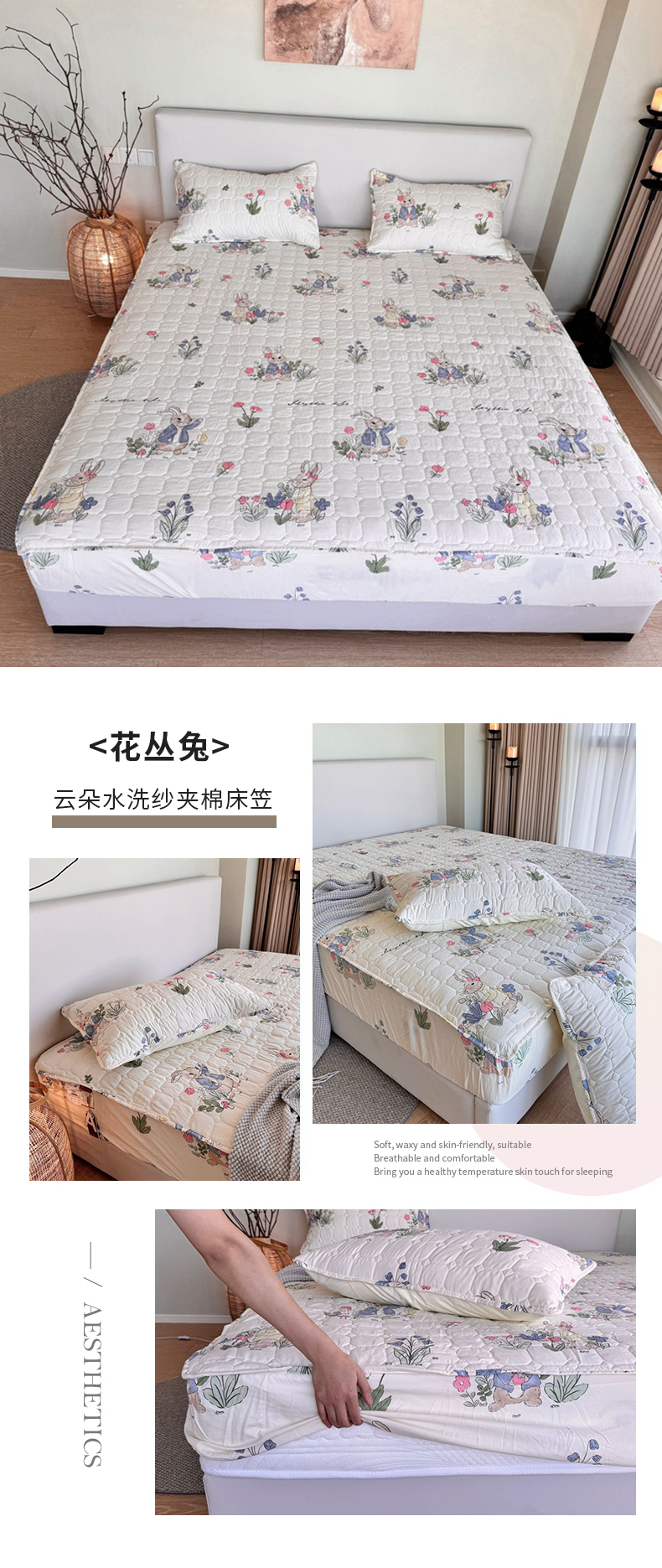 商品名称:兜米家居 2024新款云朵水洗纱夹棉单品床笠 花丛兔