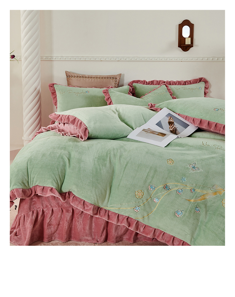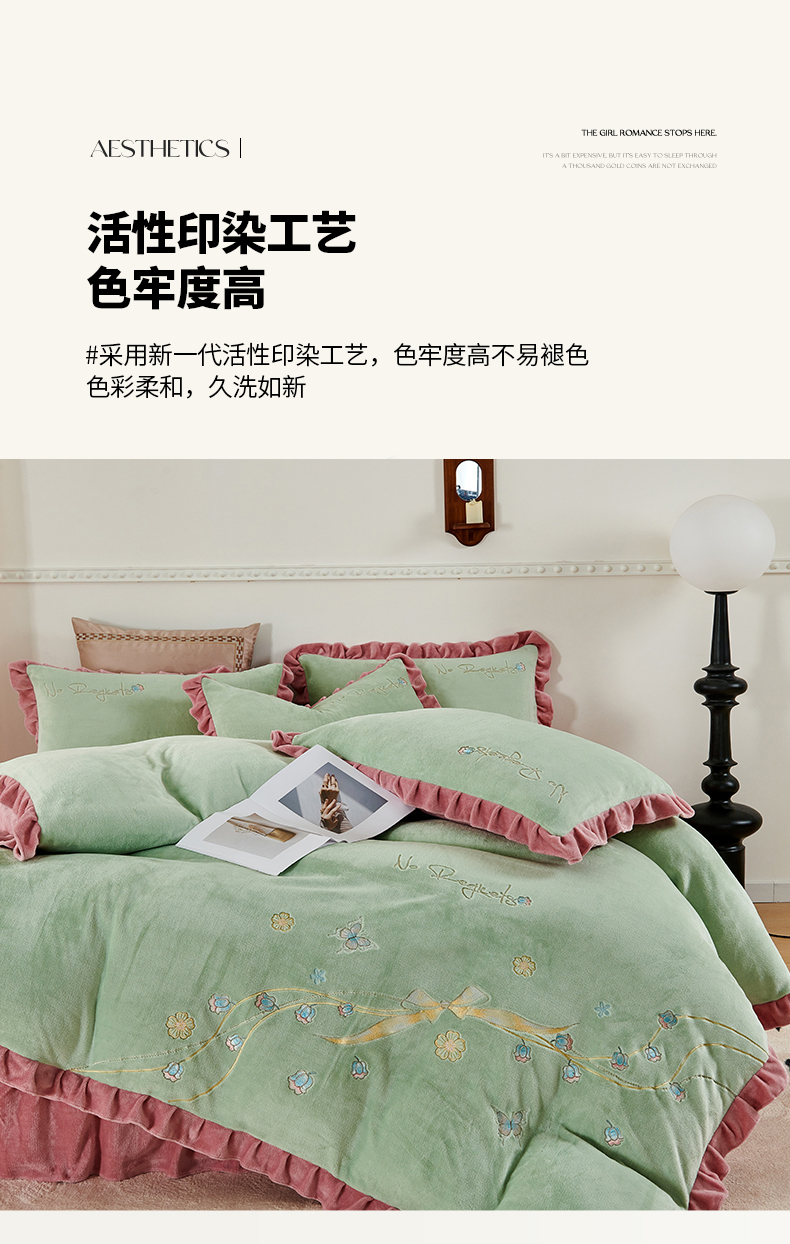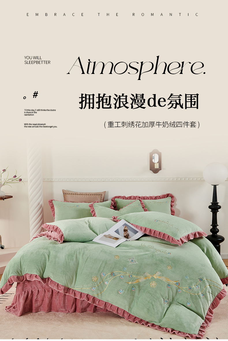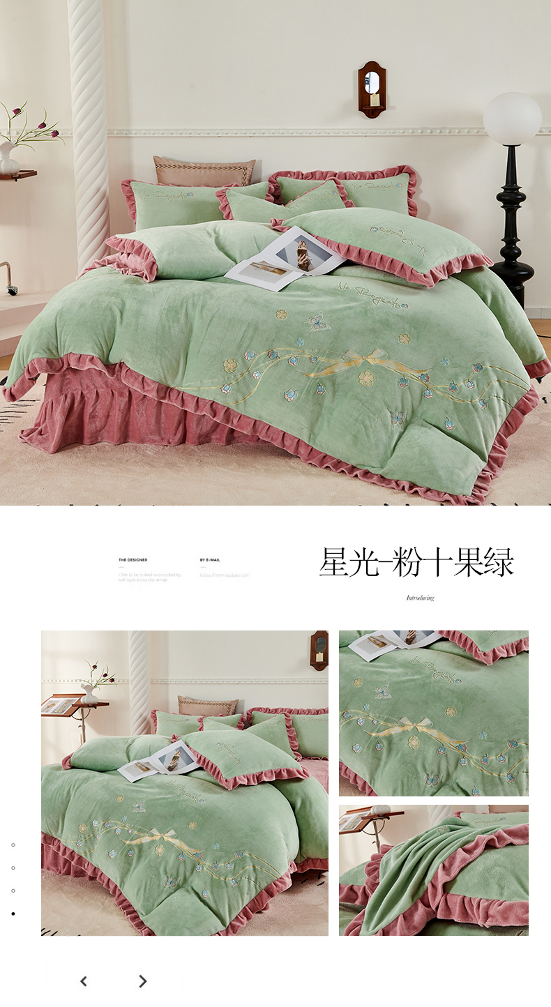 商品名称:慕克斯 2024新款重工绣花牛奶绒四件套星光 星光-粉十果绿