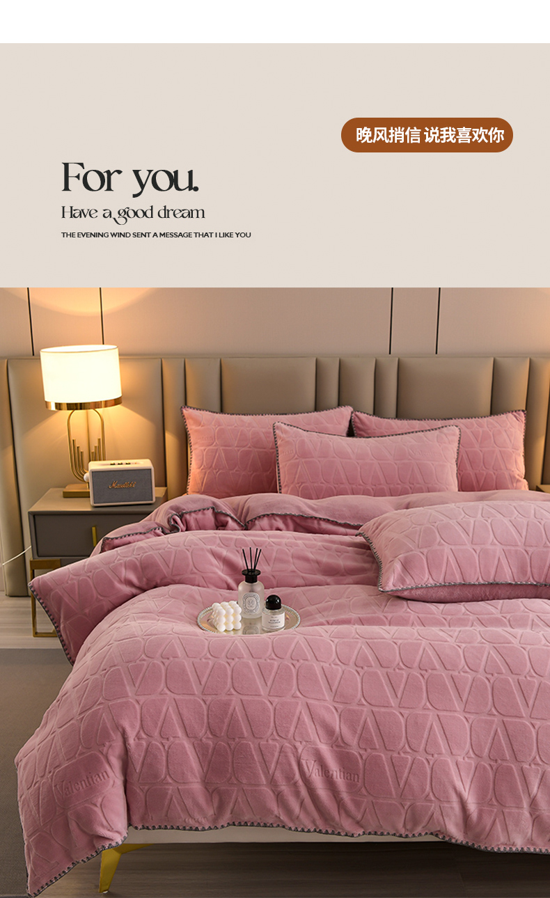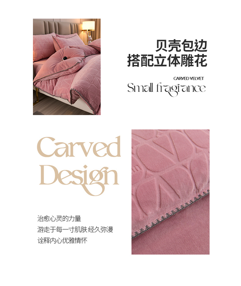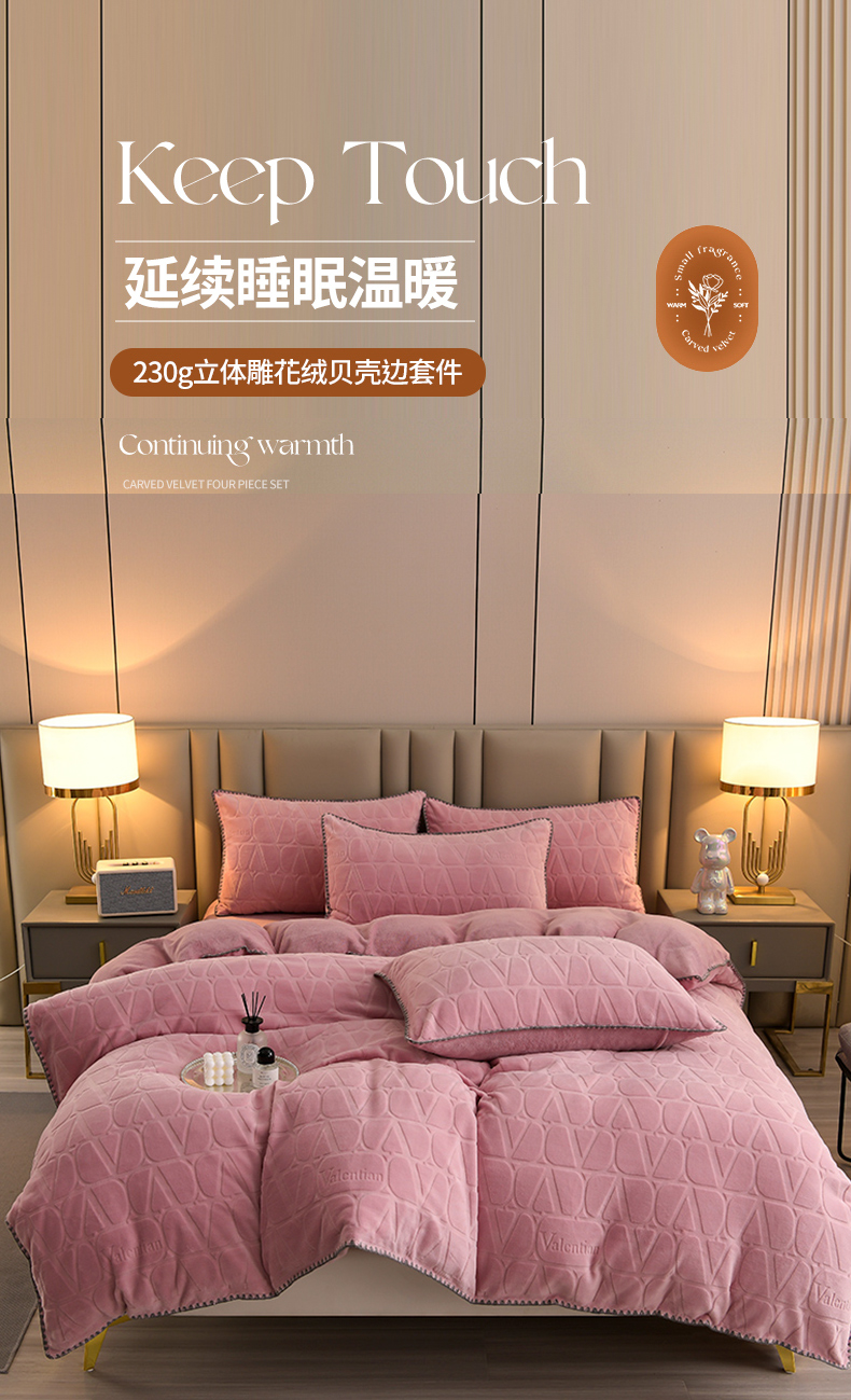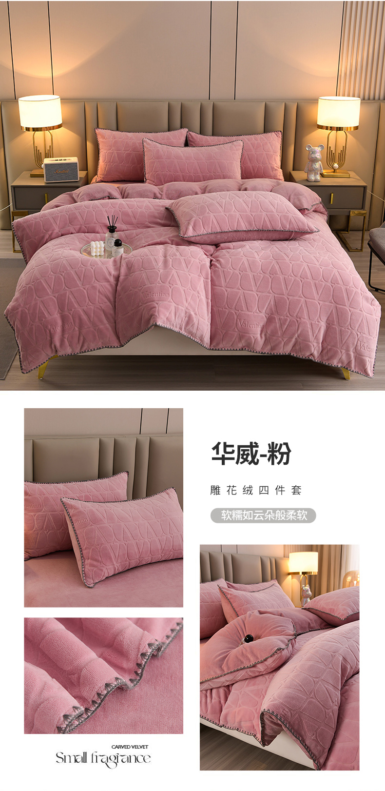 当前位置: 91家纺网 > 商品网购 > 床品套件 > 四件套 > 雕花绒四件套 > 菡宝 2024新款贝壳边雕花绒四件套 华威-粉