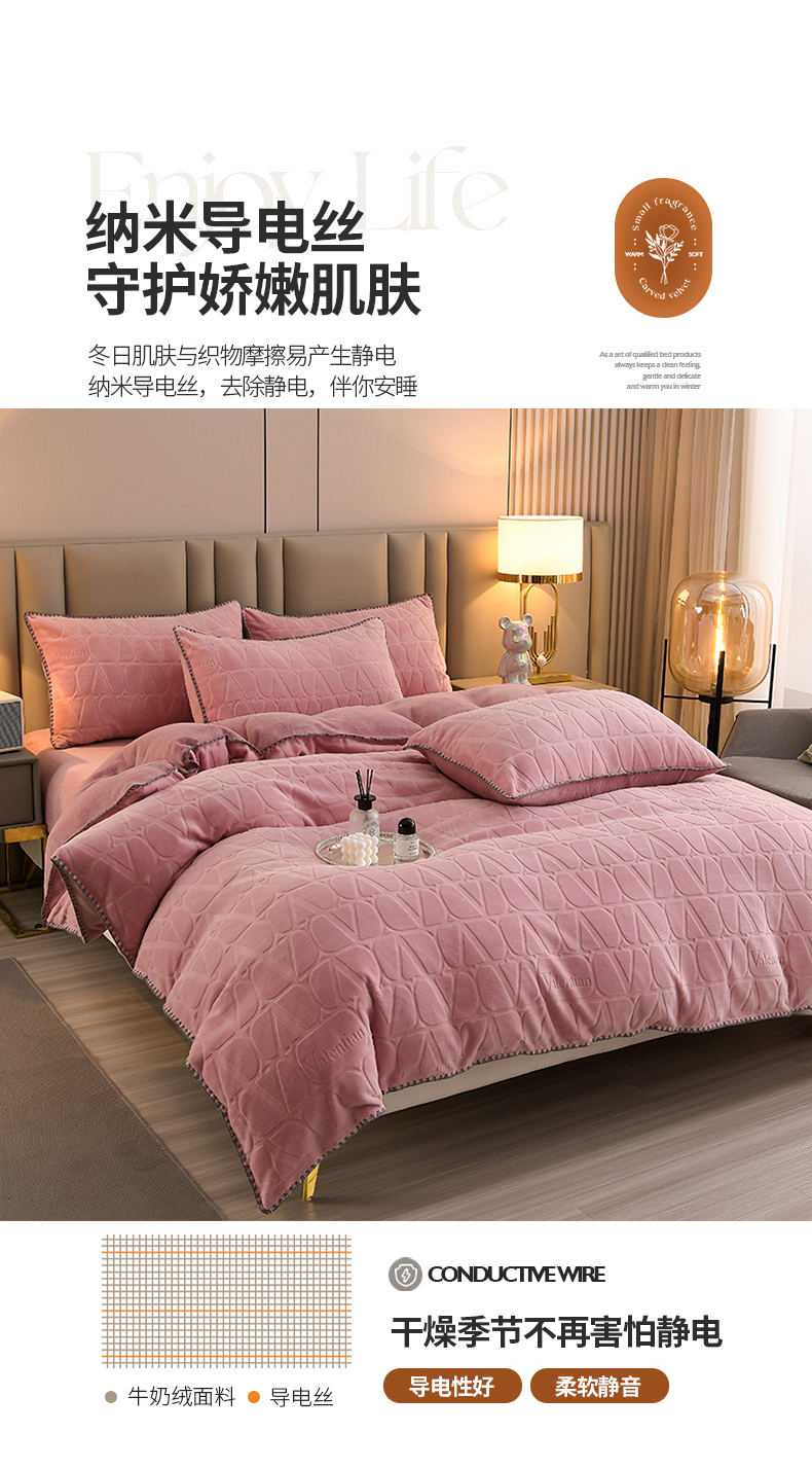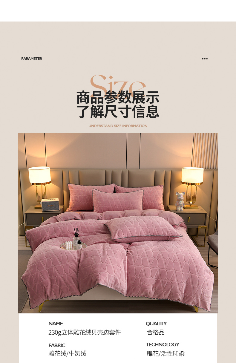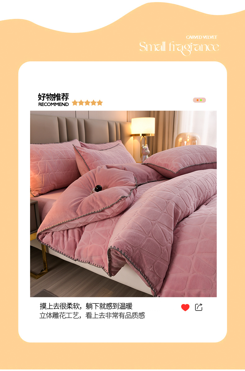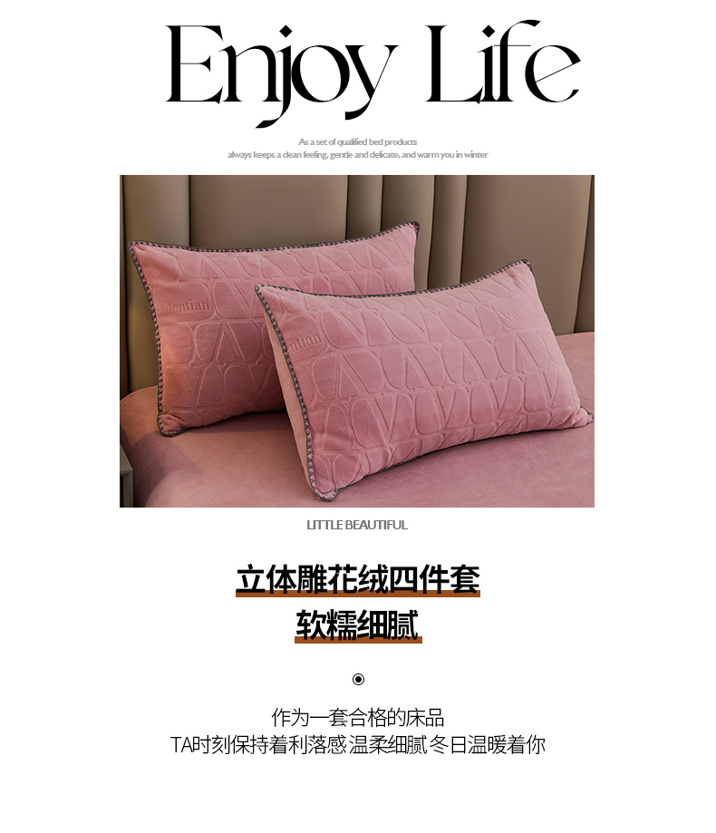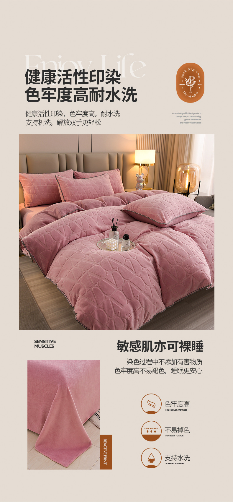 当前位置: 91家纺网 > 商品网购 > 床品套件 > 四件套 > 雕花绒四件套 > 菡宝 2024新款贝壳边雕花绒四件套 华威-粉