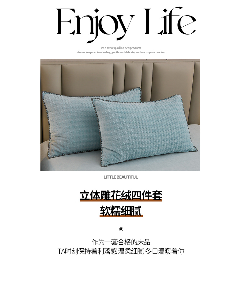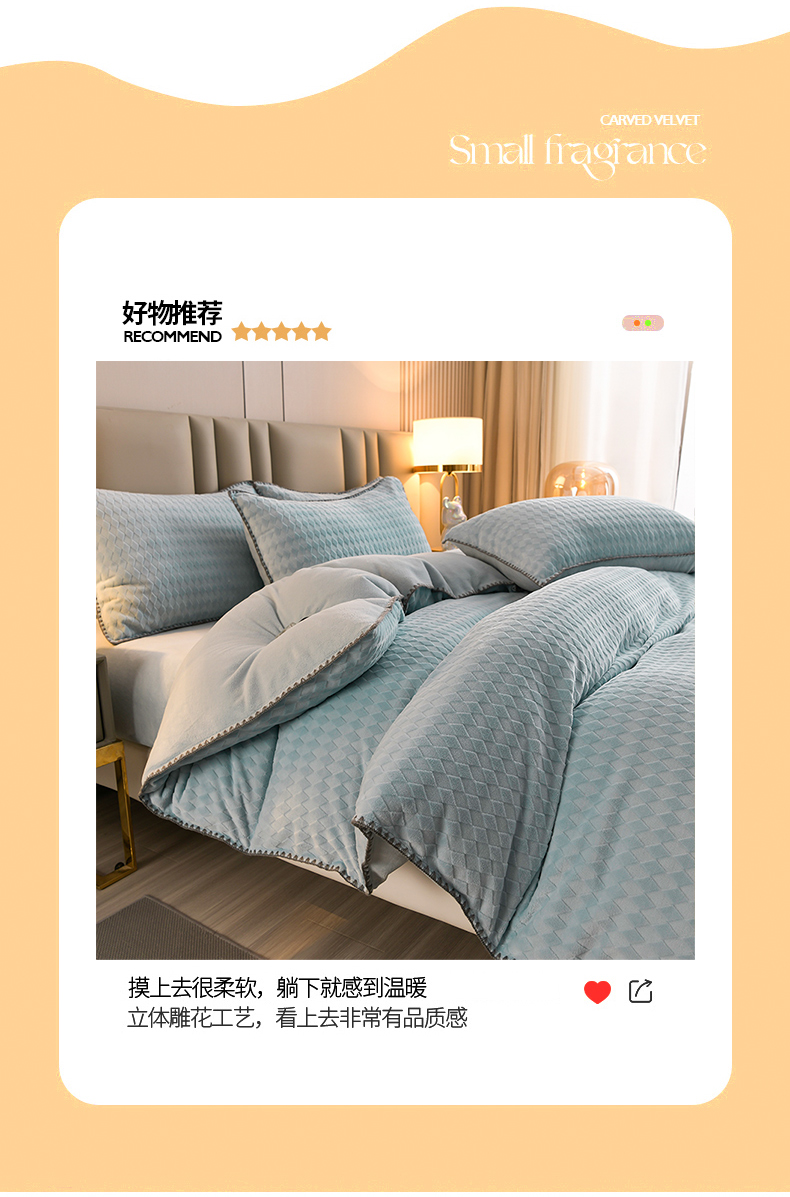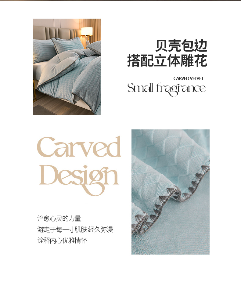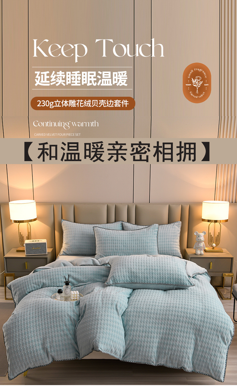 当前位置: 91家纺网 > 商品网购 > 床品套件 > 四件套 > 雕花绒四件套 > 菡宝 2024新款贝壳边雕花绒四件套 菱形格-雾蓝