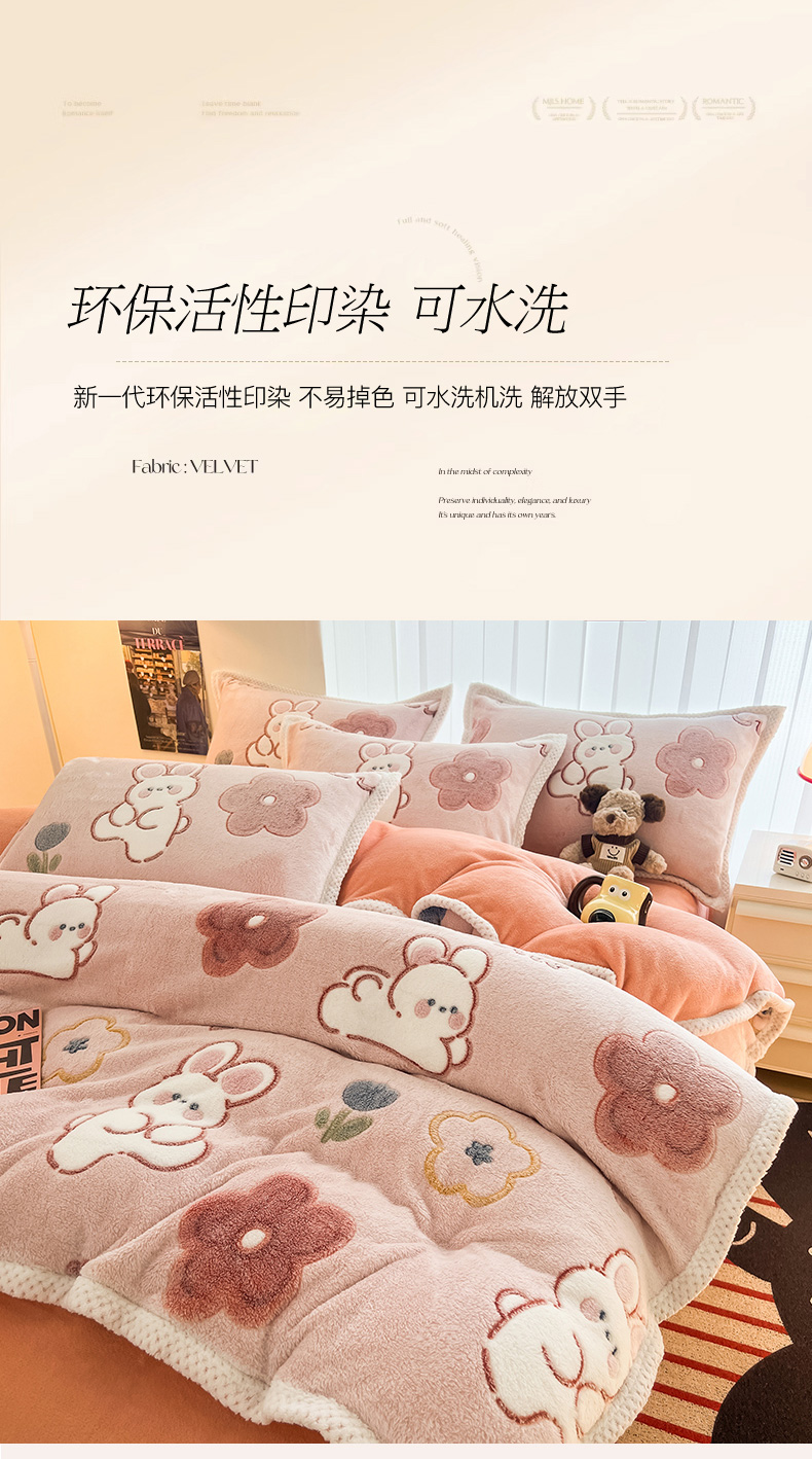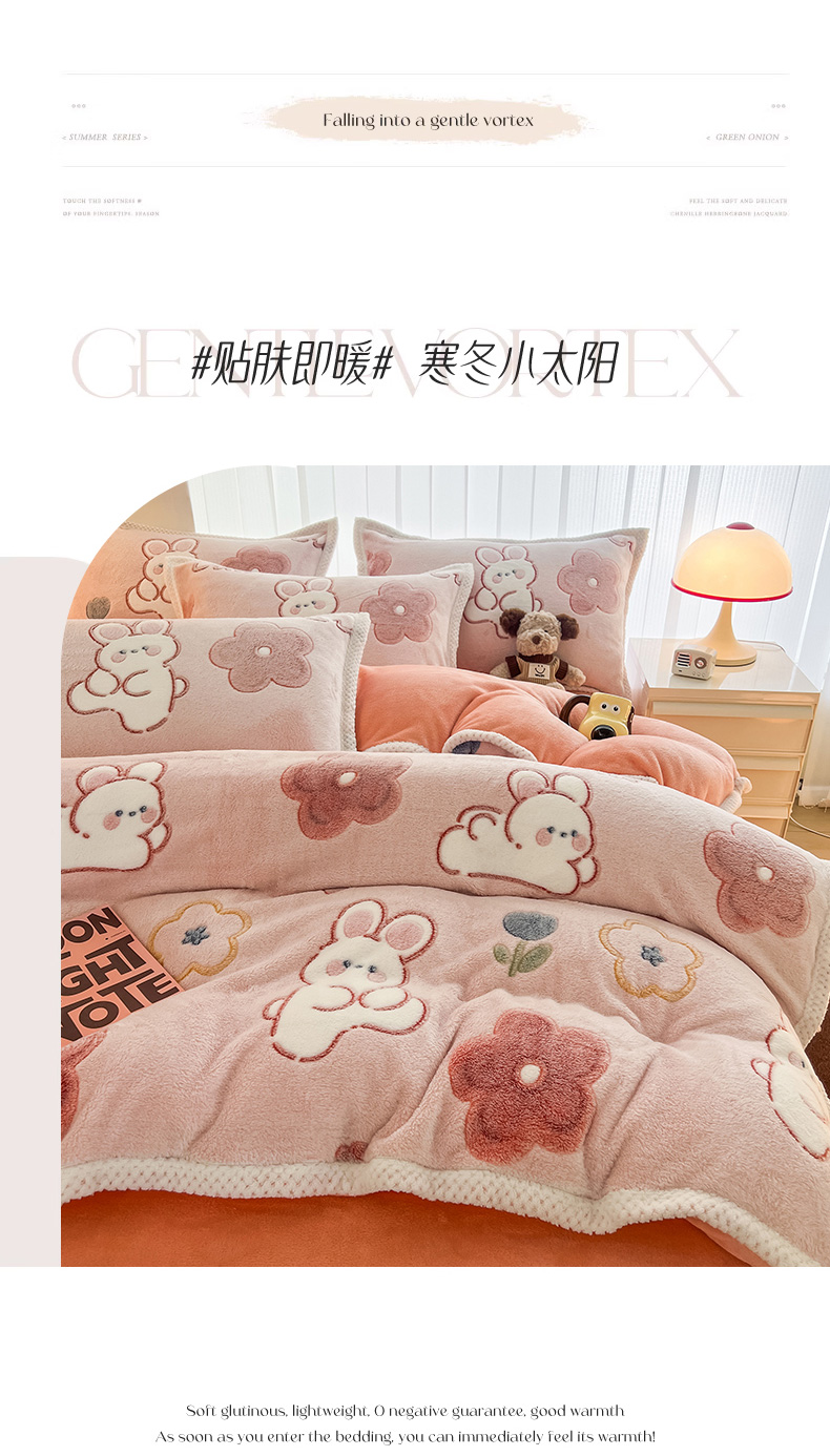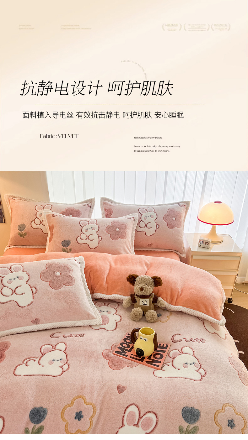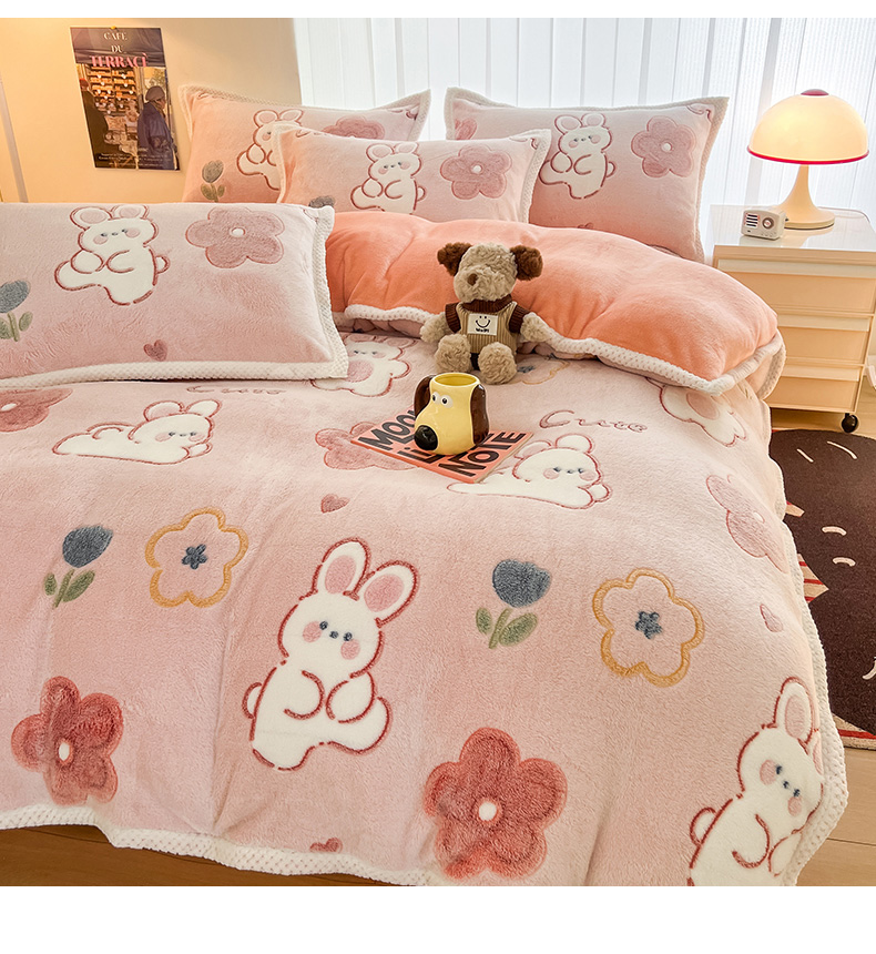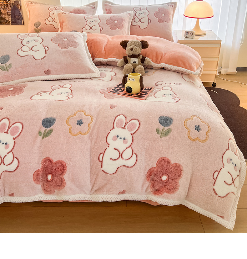 当前位置: 91家纺网 > 商品网购 > 床品套件 > 四件套 > 其它四件套 > 倾慕家纺 2024新款加厚保暖6D立体雪花绒系列-四件套 活泼小兔