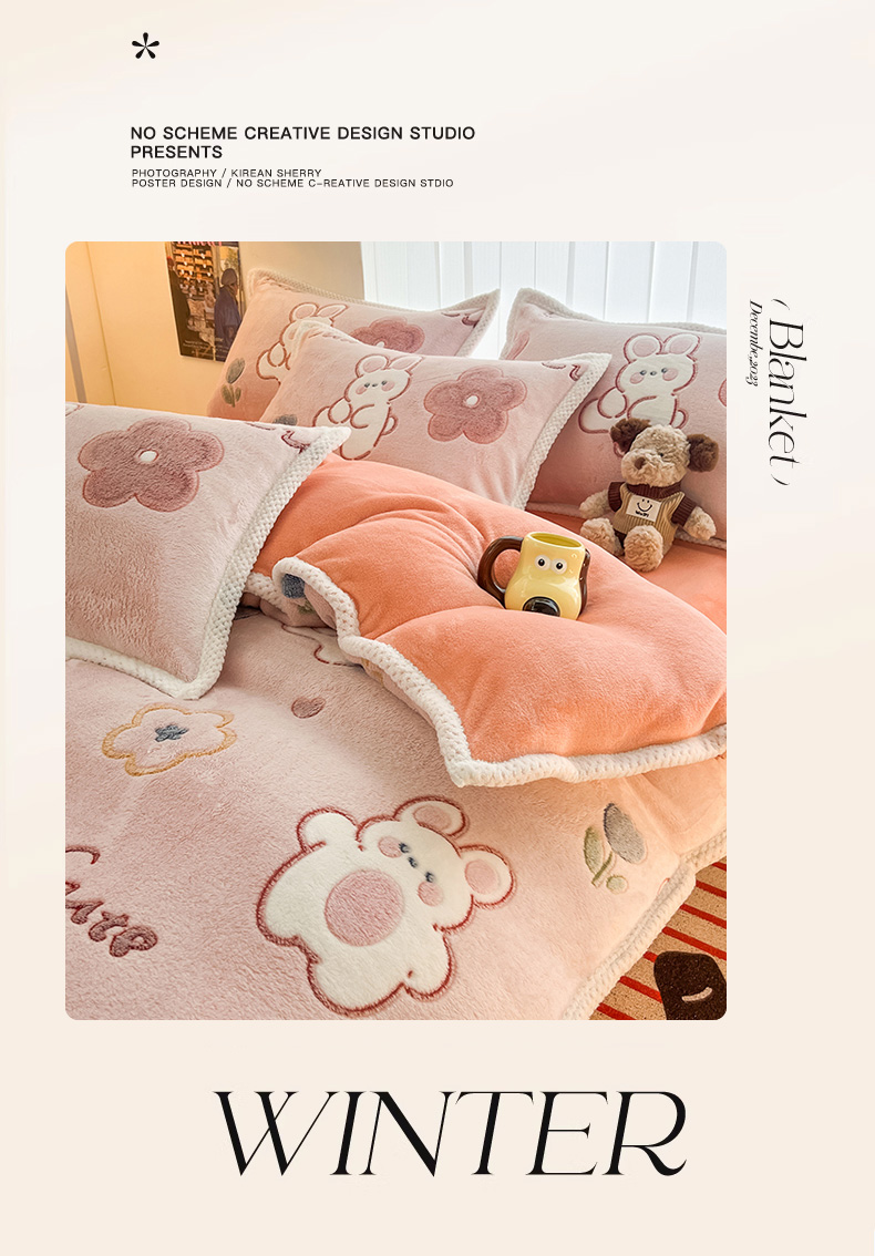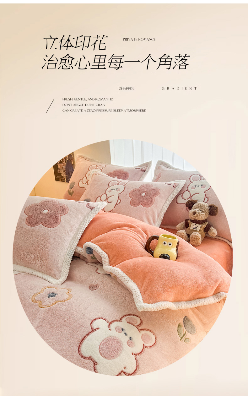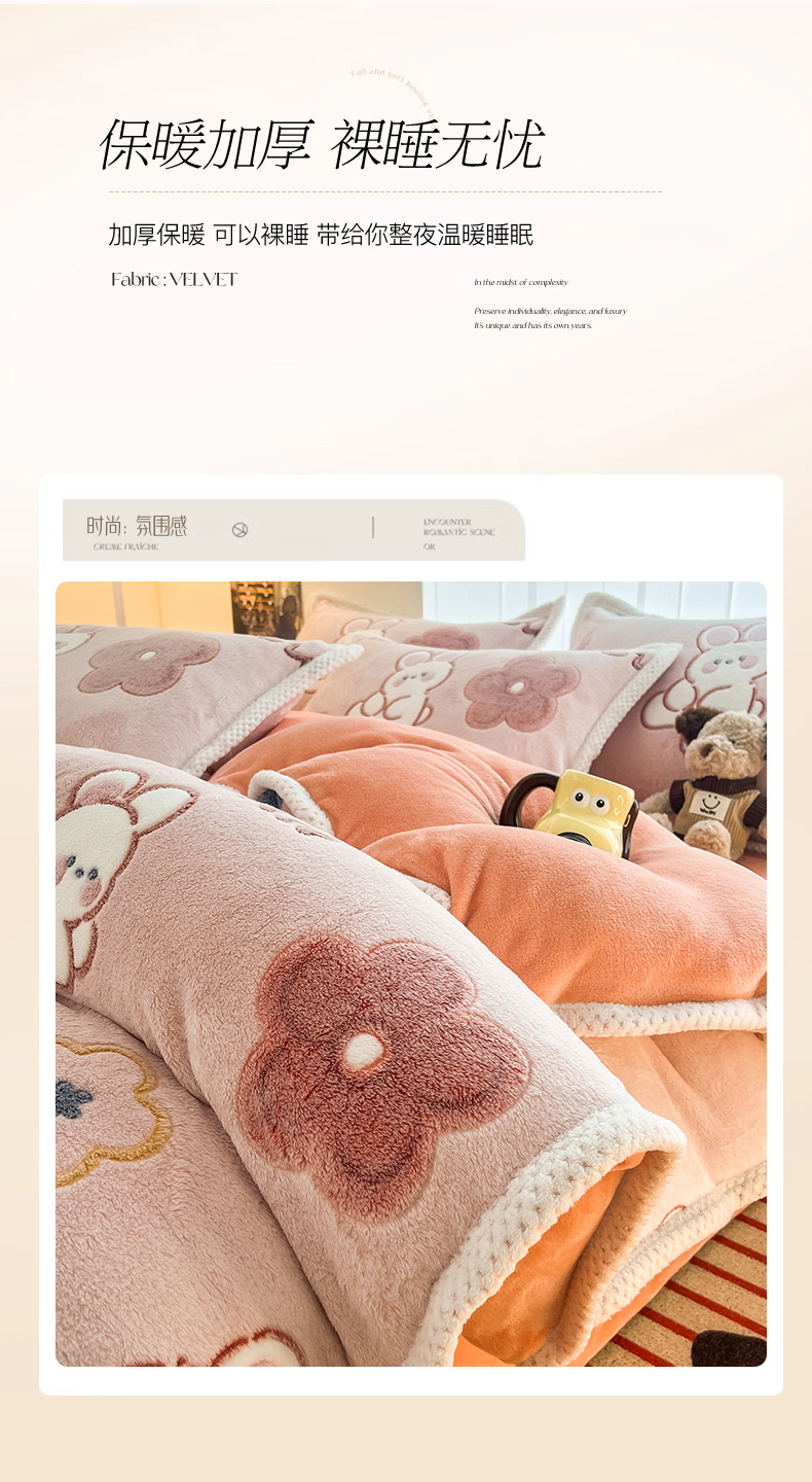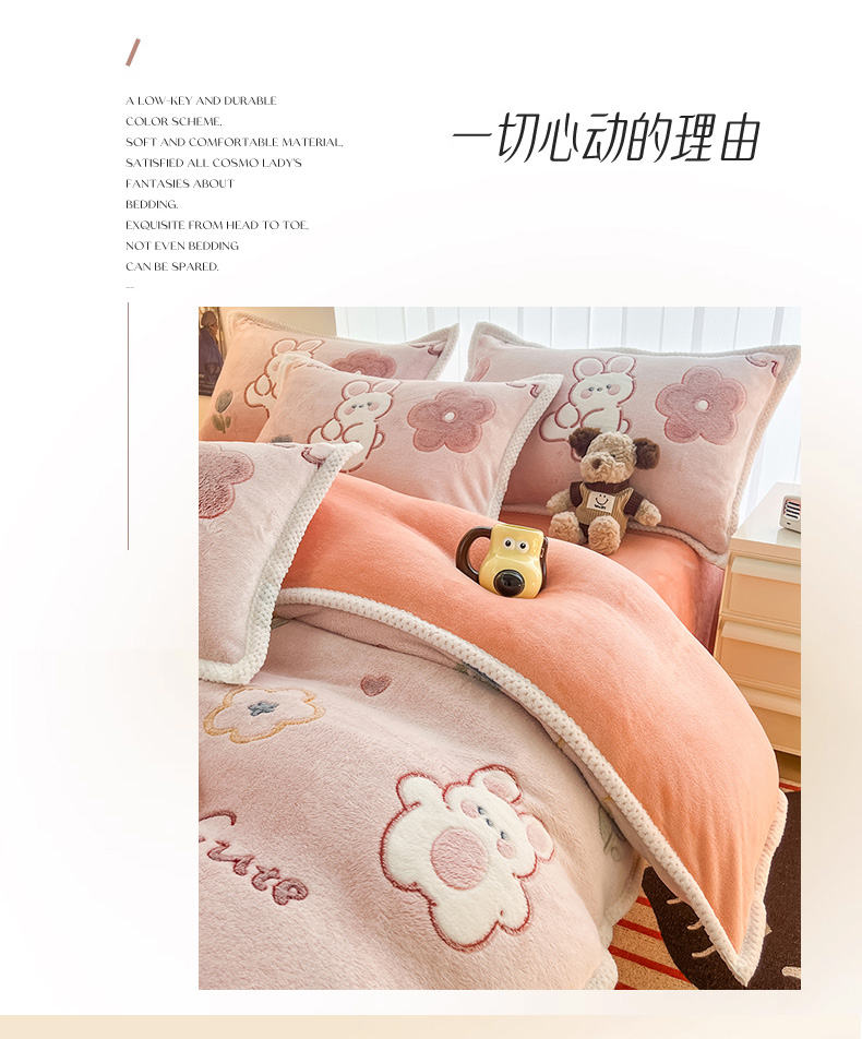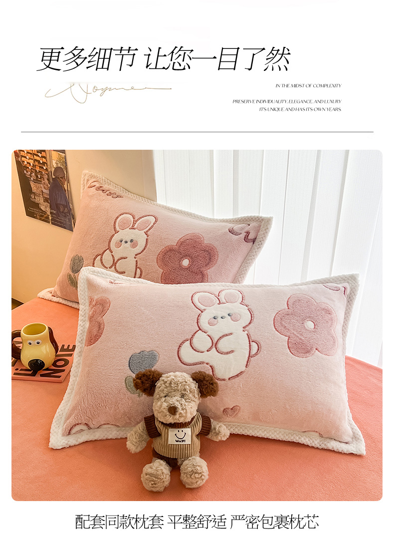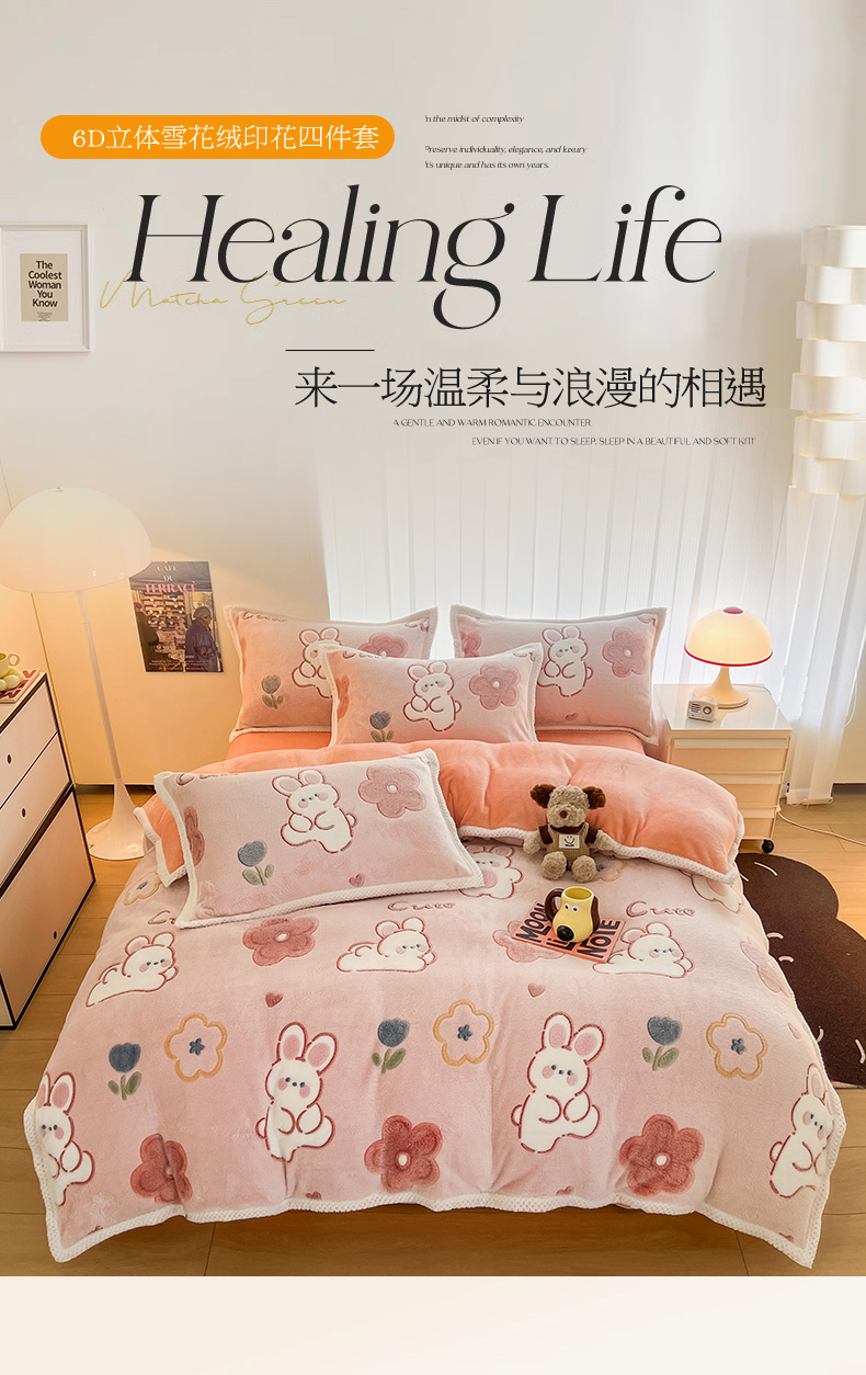 当前位置: 91家纺网 > 商品网购 > 床品套件 > 四件套 > 其它四件套 > 倾慕家纺 2024新款加厚保暖6D立体雪花绒系列-四件套 活泼小兔