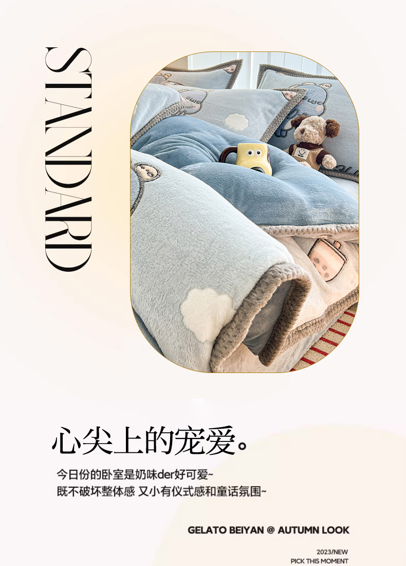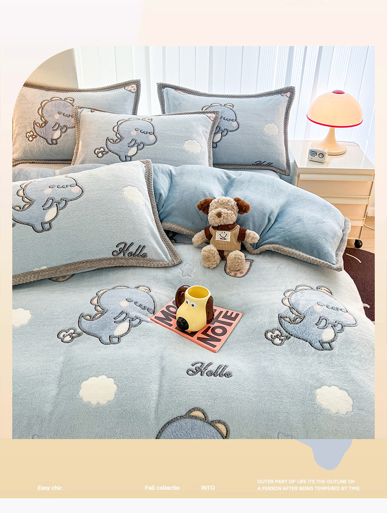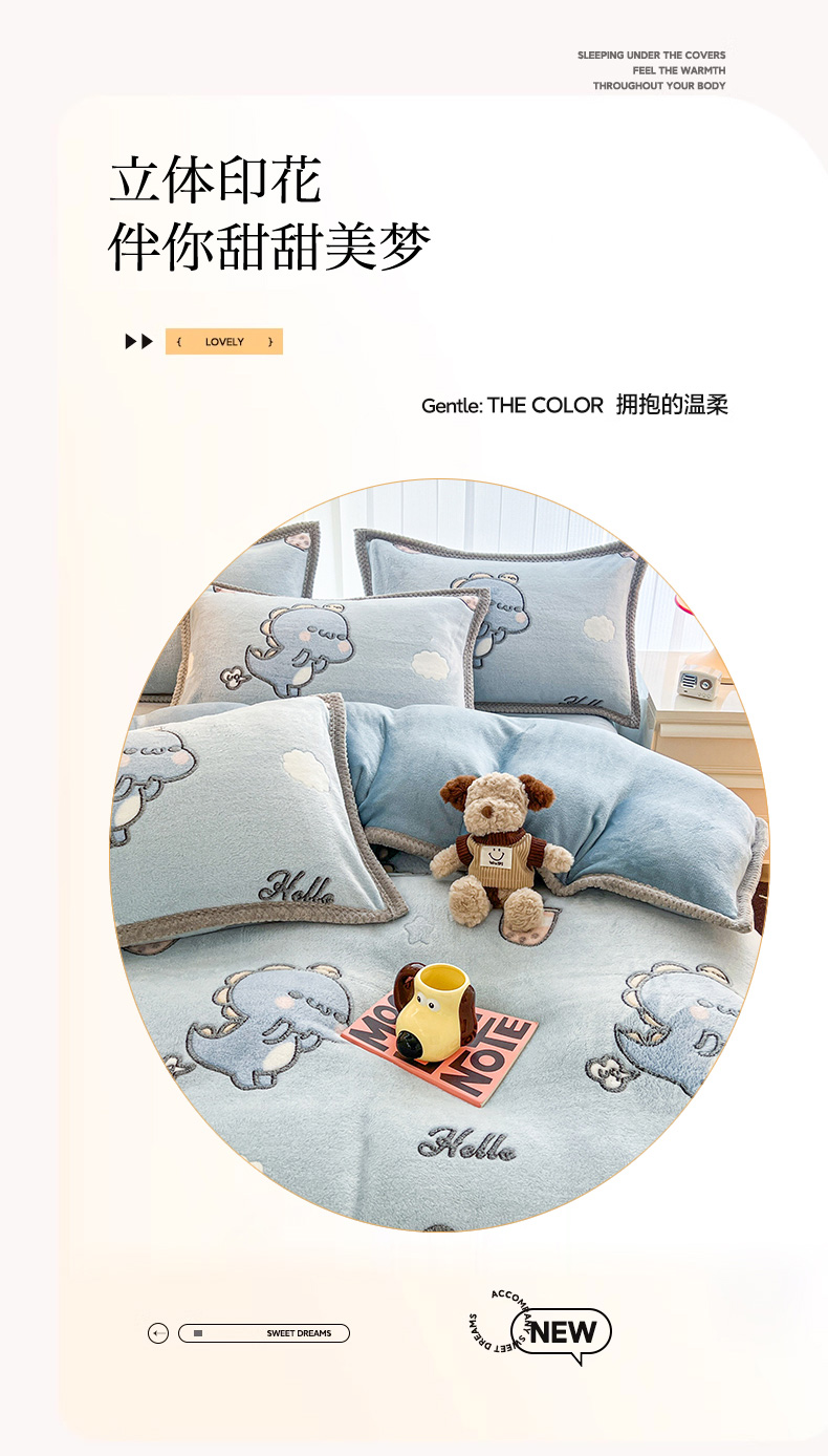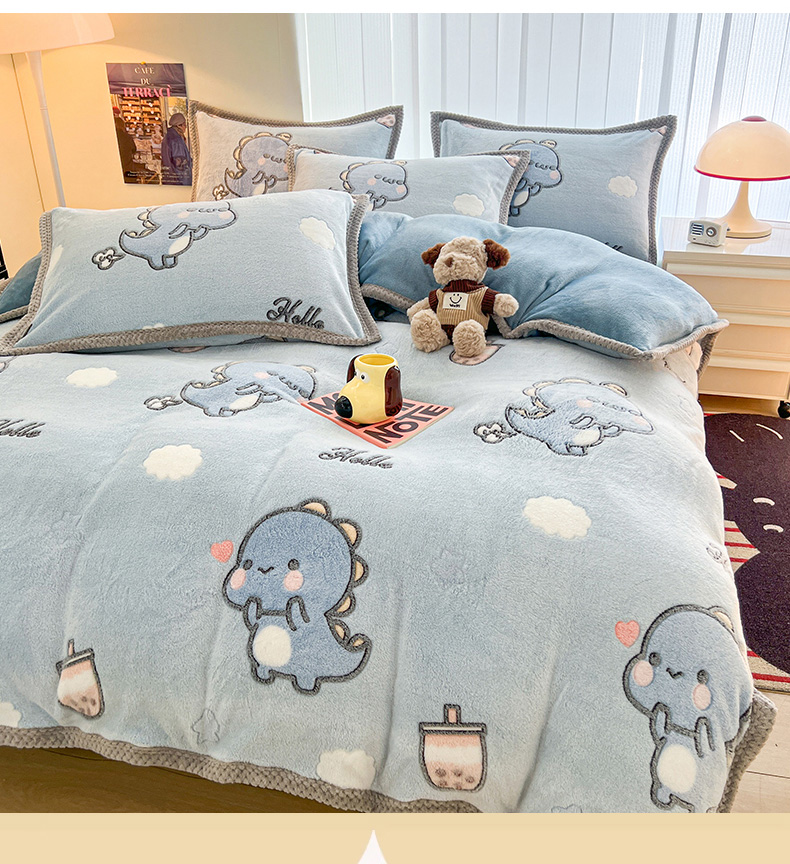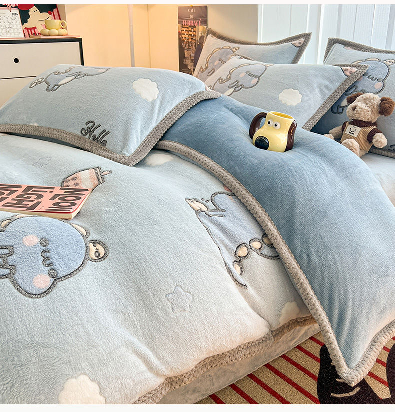 (总)倾慕家纺 2025新款卡通毛巾绣加厚保暖牛奶绒四件套,爱心女孩,咖啡小狗,猫咪熊兔,迷你小车,圣诞树熊,音乐企鹅