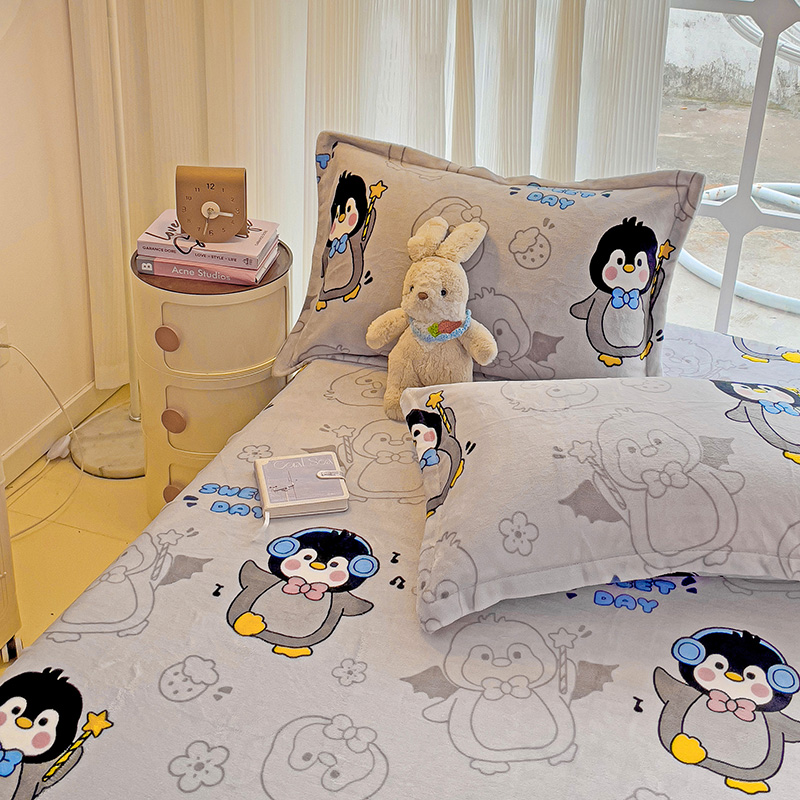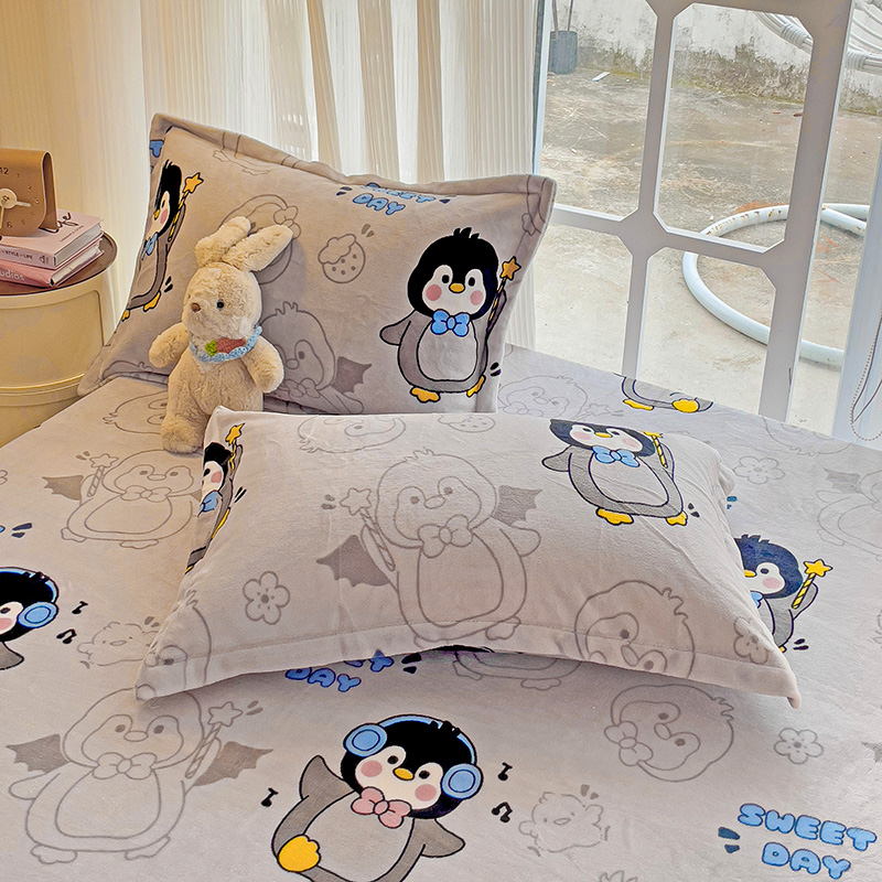 • 91家纺网 家纺一手货源 找家纺 名兮 2024卡通时尚风高克重牛奶绒床笠 企鹅宝宝
