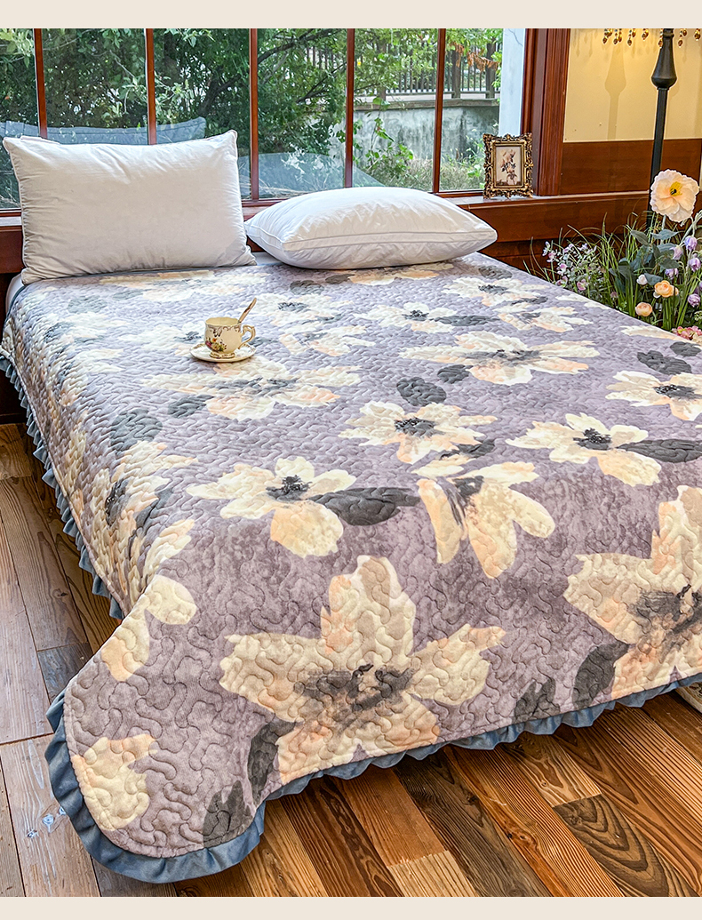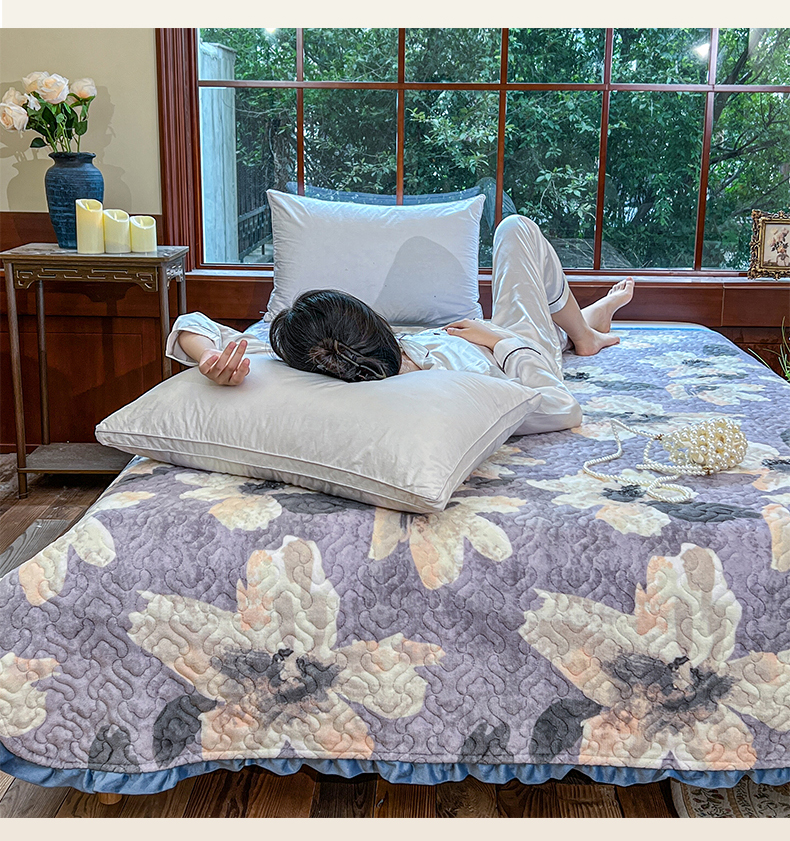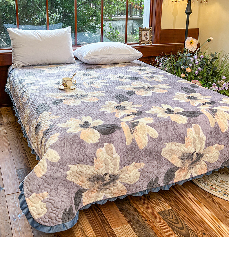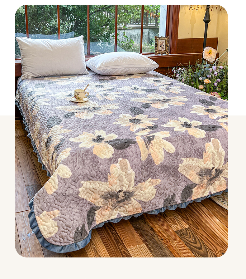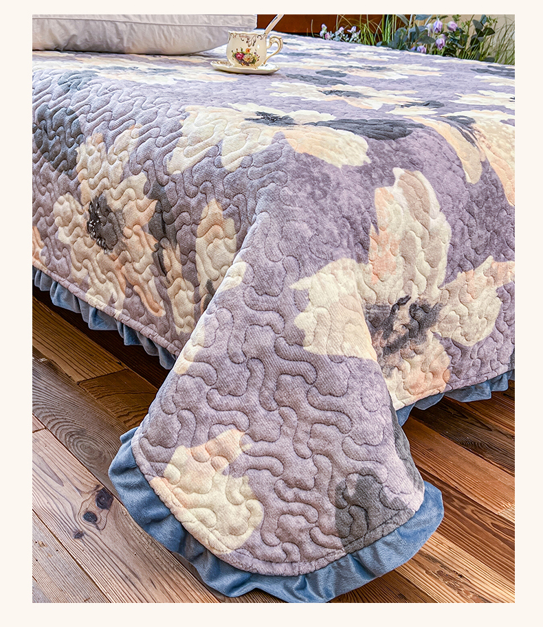 悦织湾家纺 2025新款印花牛奶绒花边夹棉床盖 紫韵花开