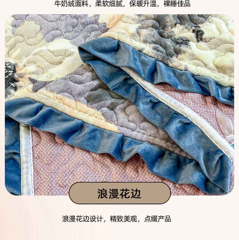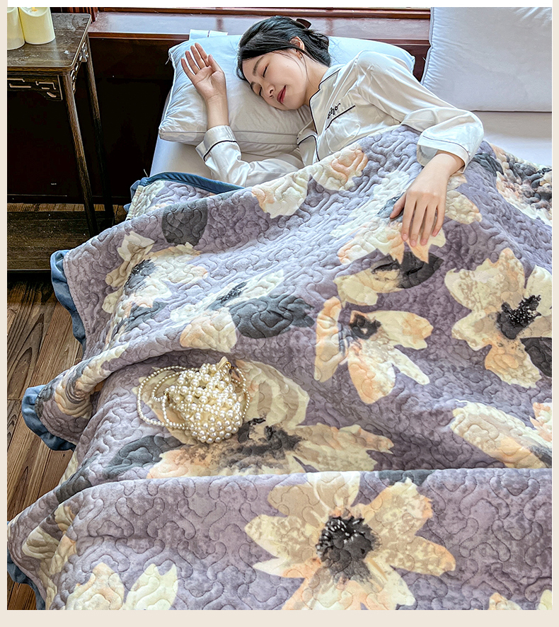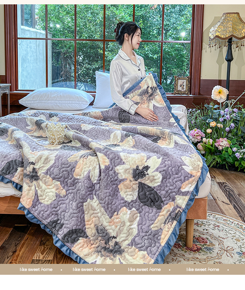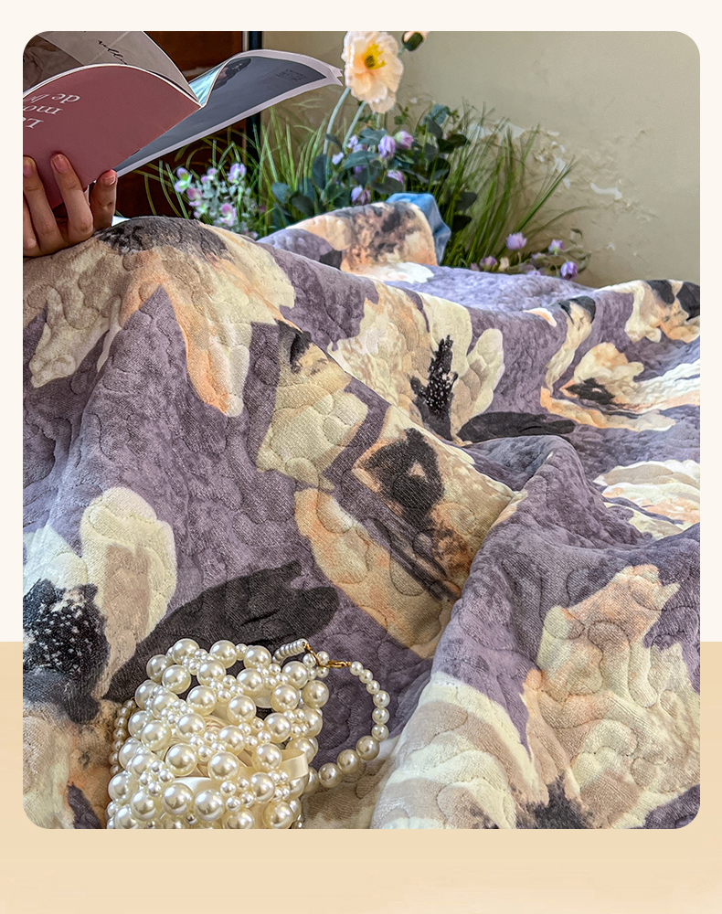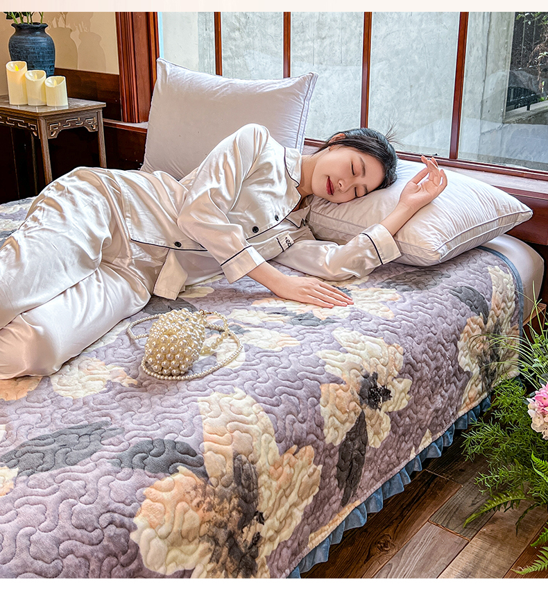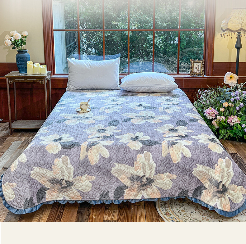 悦织湾家纺 2025新款印花牛奶绒花边夹棉床盖 紫韵花开