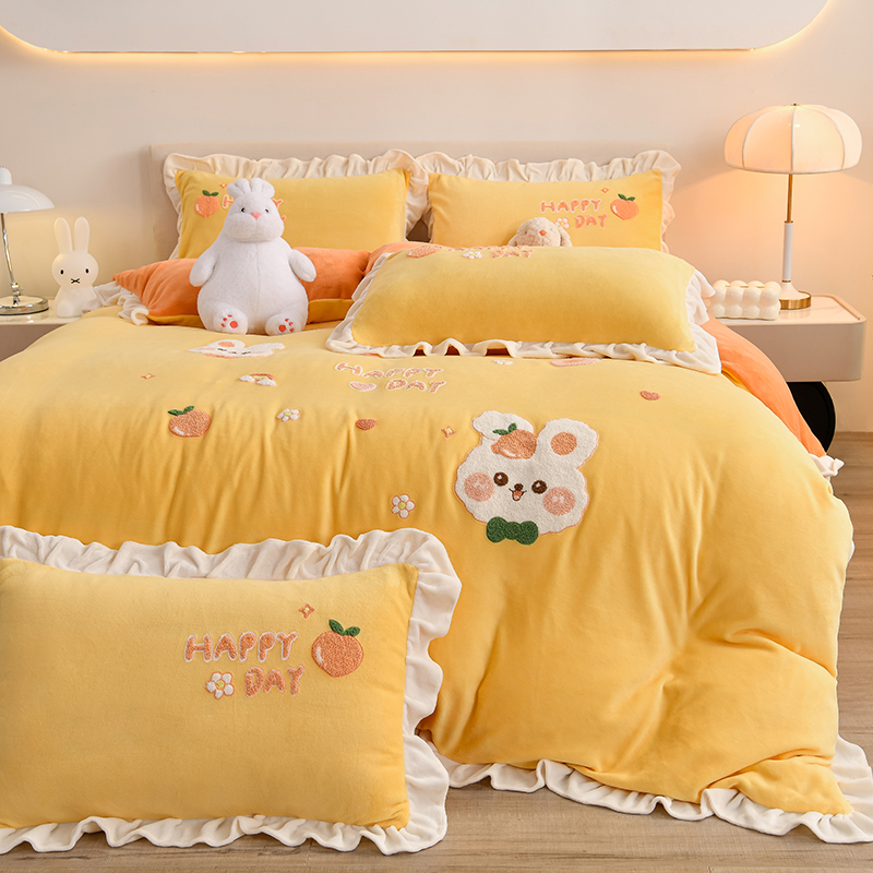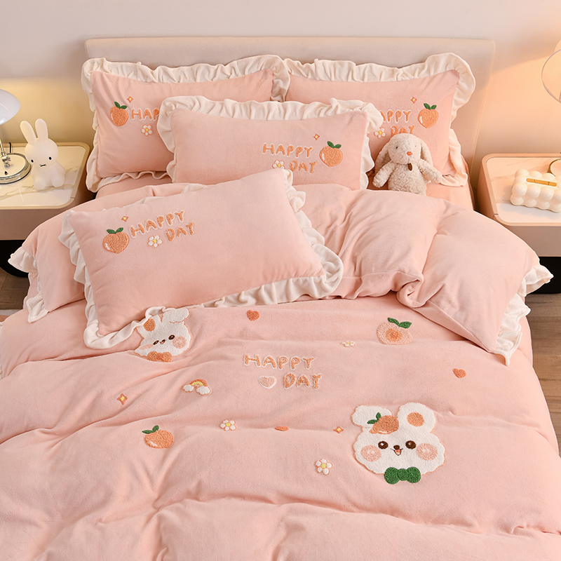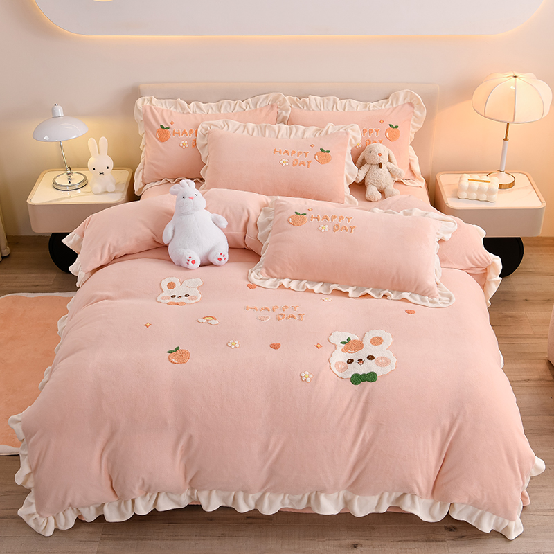 当前位置: 91家纺网 > 商品网购 > 床品套件 > 四件套 > 牛奶绒四件套 > 一左一右 2024秋冬新款全消光高克重保暖加厚卡通花边毛巾绣花牛奶绒四件套(提供买家秀) 可爱兔兔-奶白
