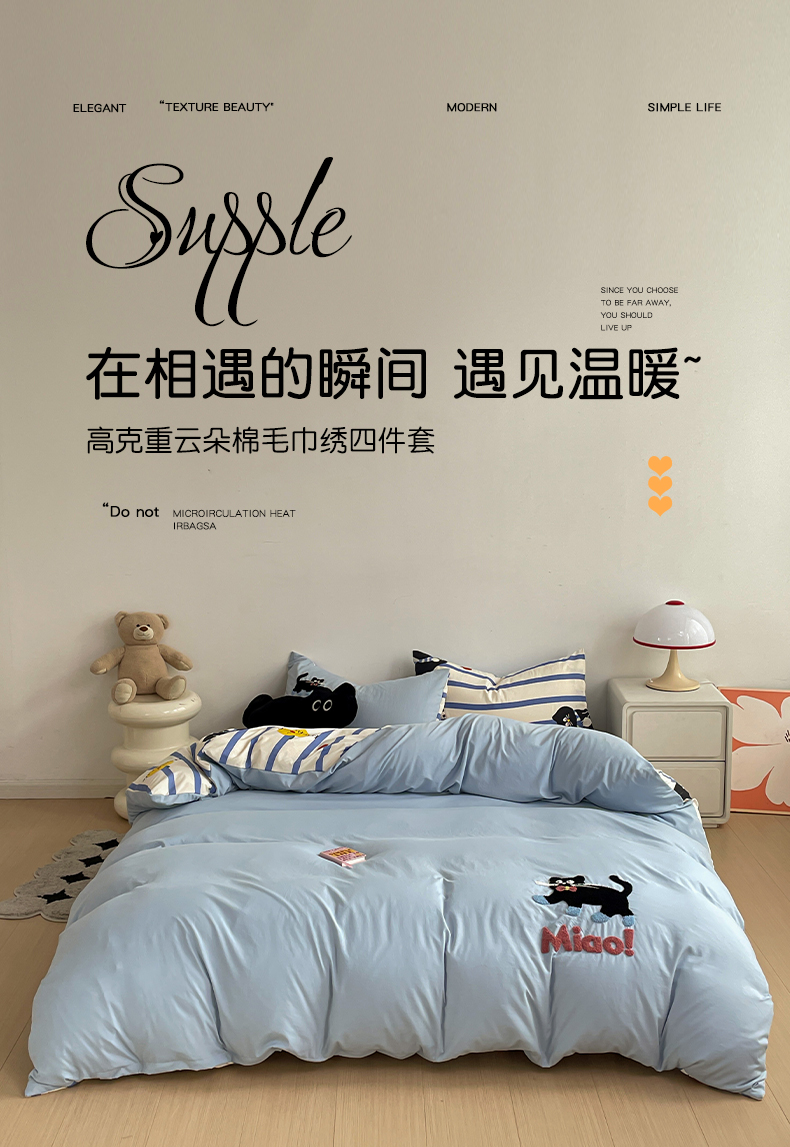 一霖家纺 2024新款高克重云朵棉毛巾绣印+绣小清新系列四件套 哈基米
