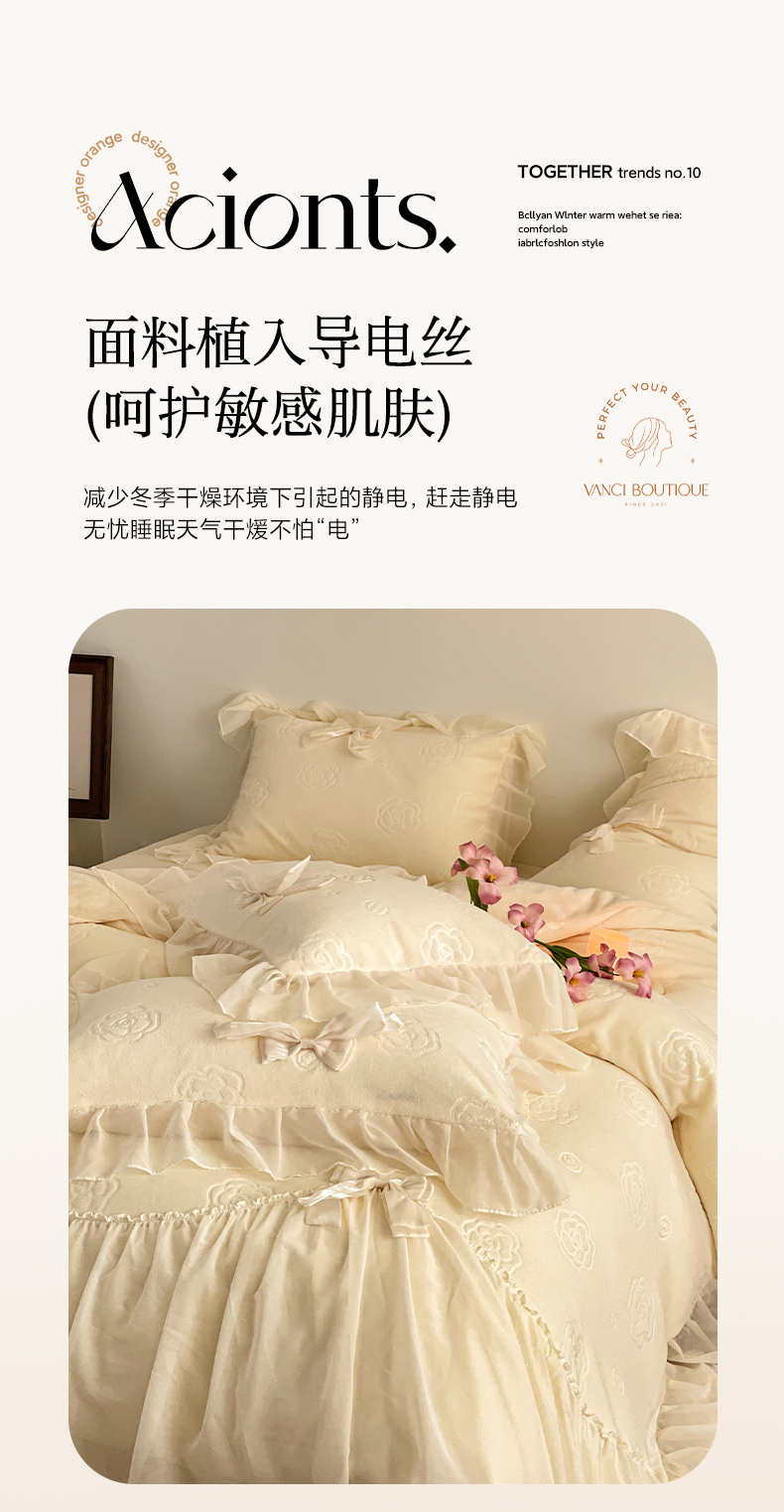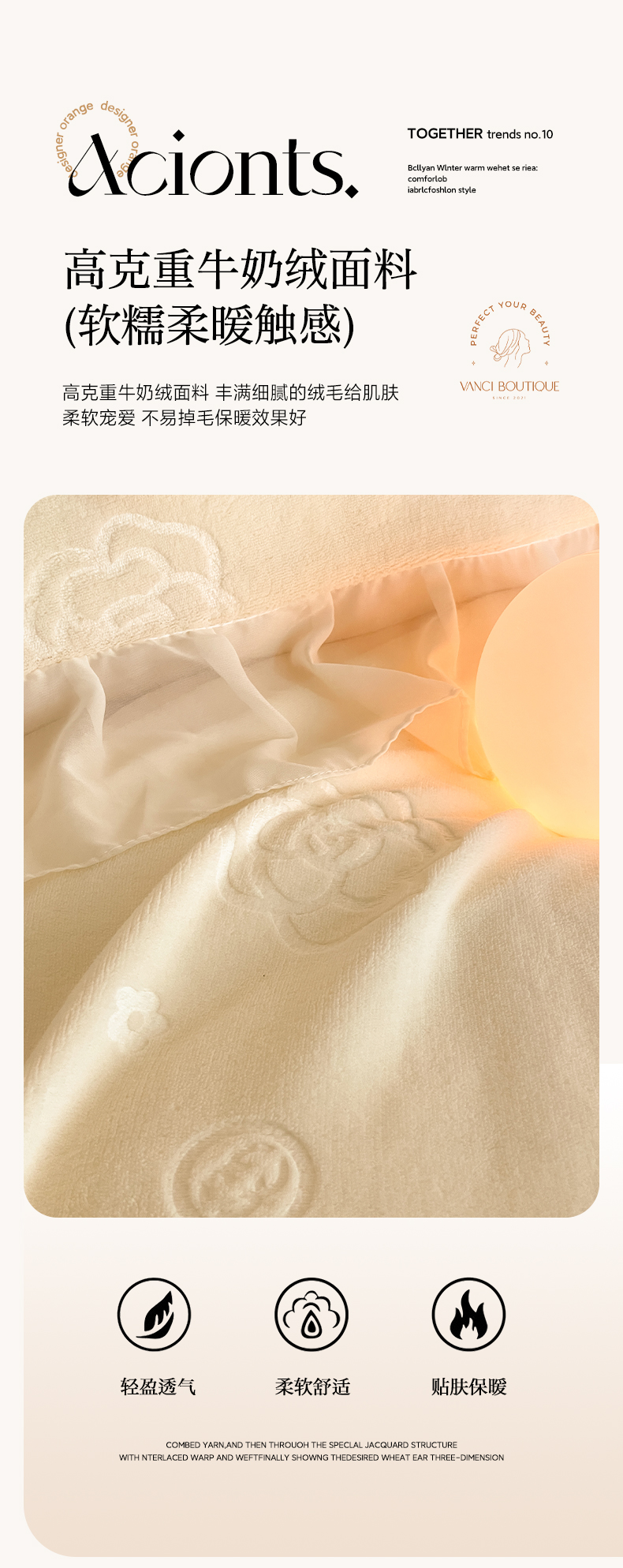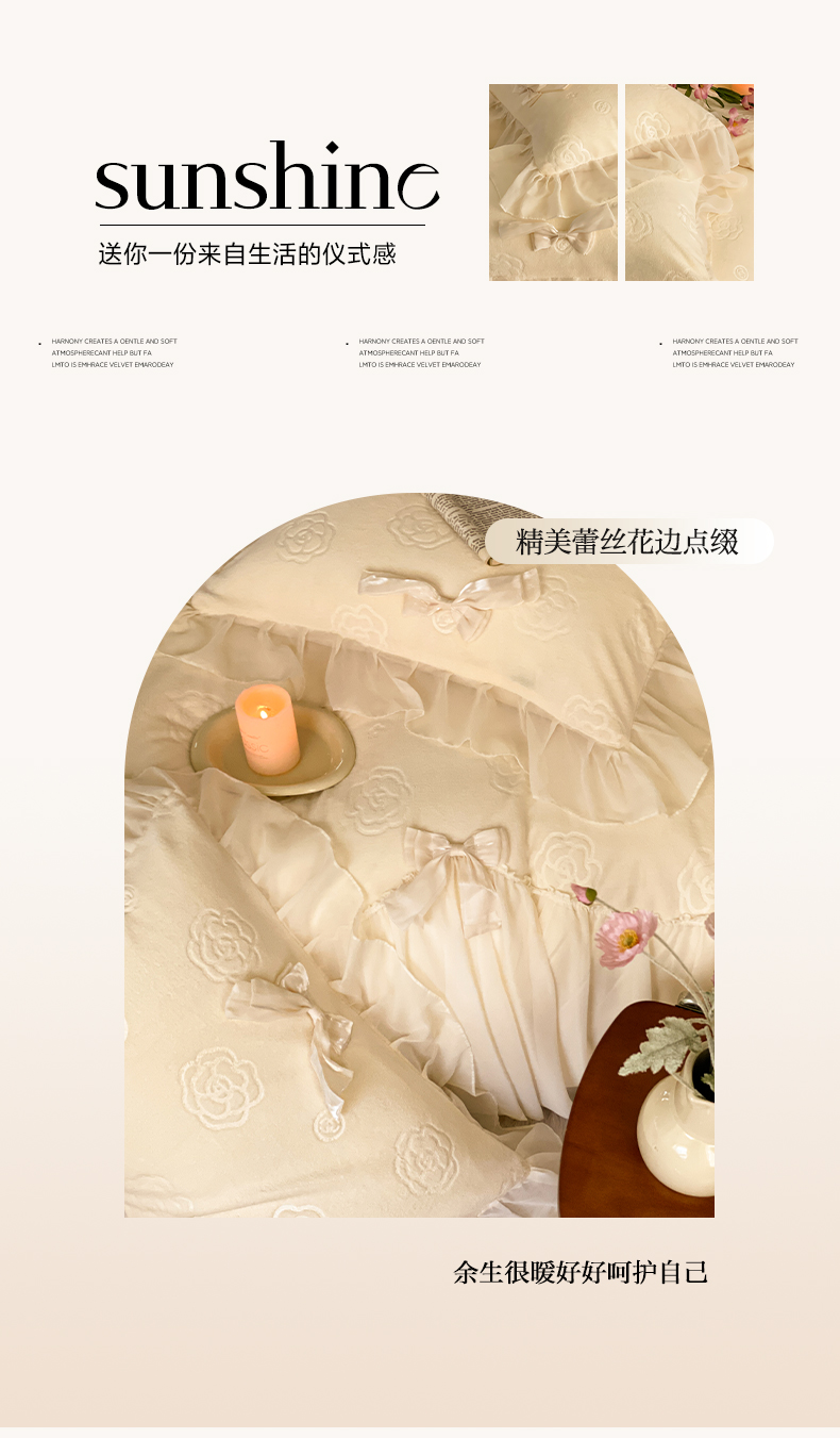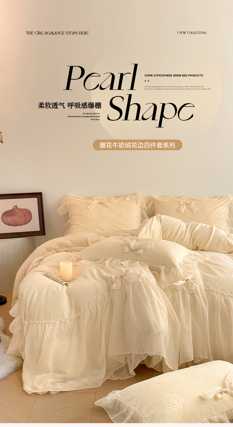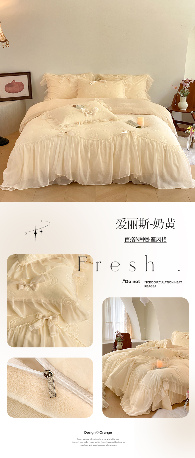 当前位置: 91家纺网 > 商品网购 > 床品套件 > 四件套 > 牛奶绒四件套 > 逸尚阁 2024新款雕花牛奶绒花边四件套-爱丽斯 爱丽斯-奶黄
