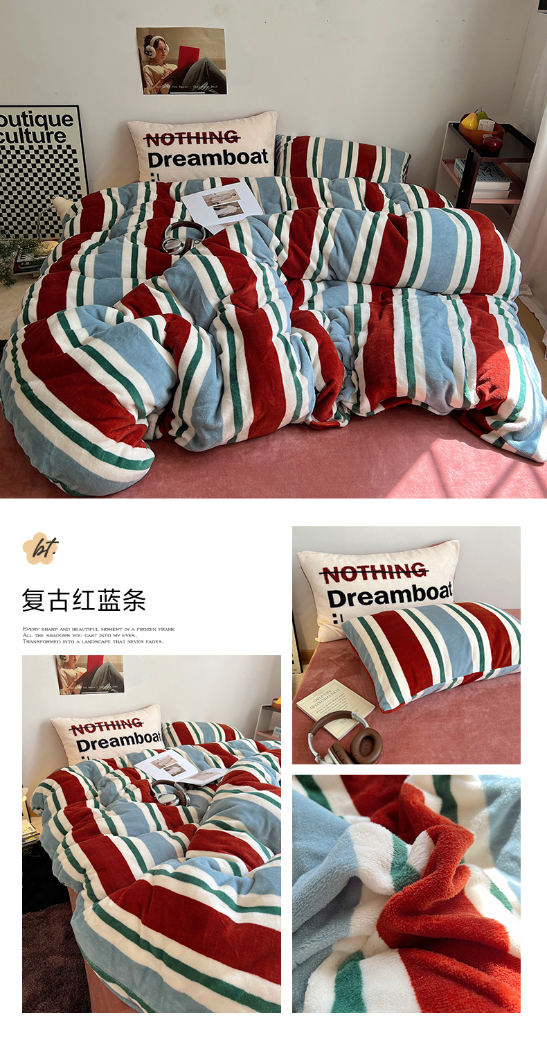 商品名称:桃喜 2024新款牛奶绒条纹系列四件套 复古红蓝条(绒)