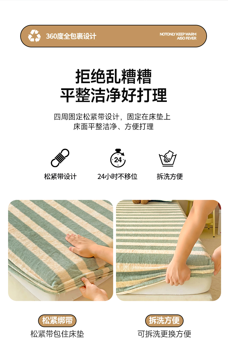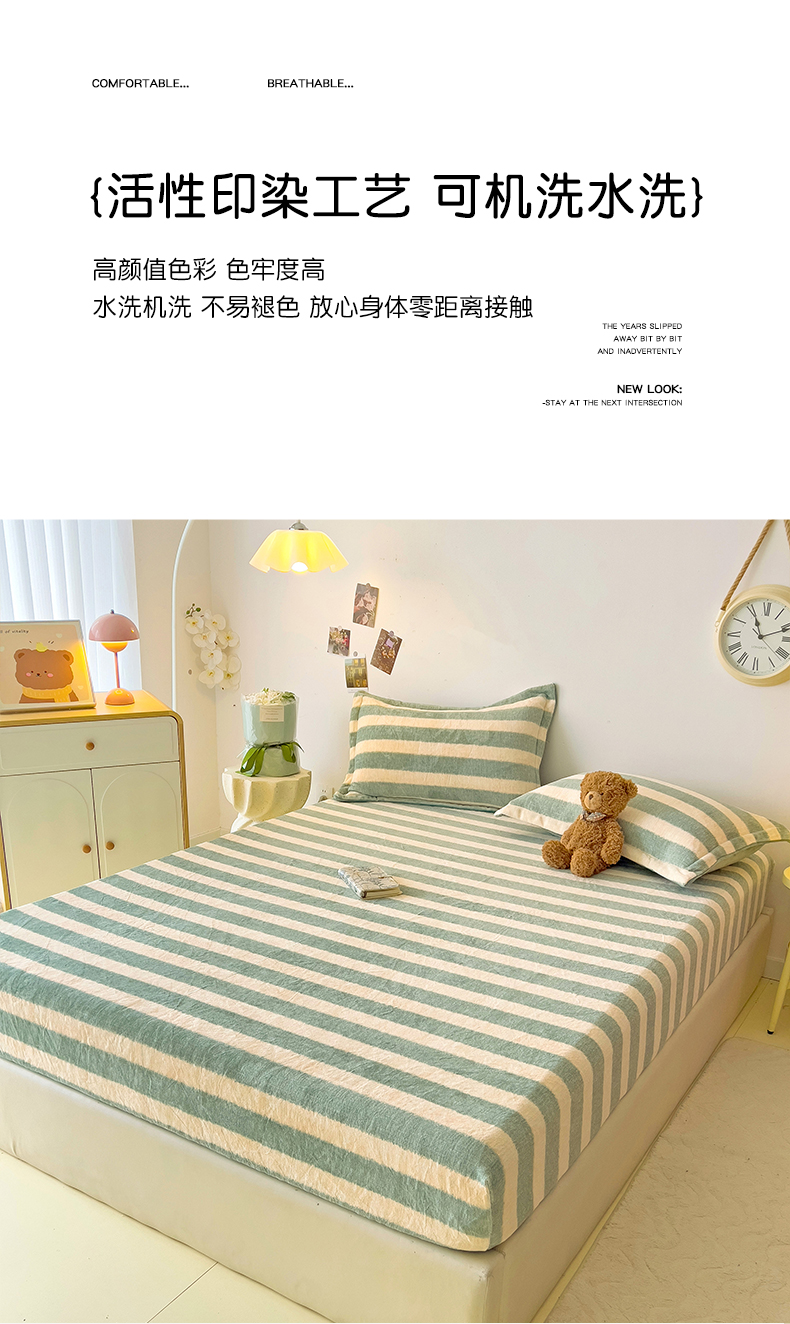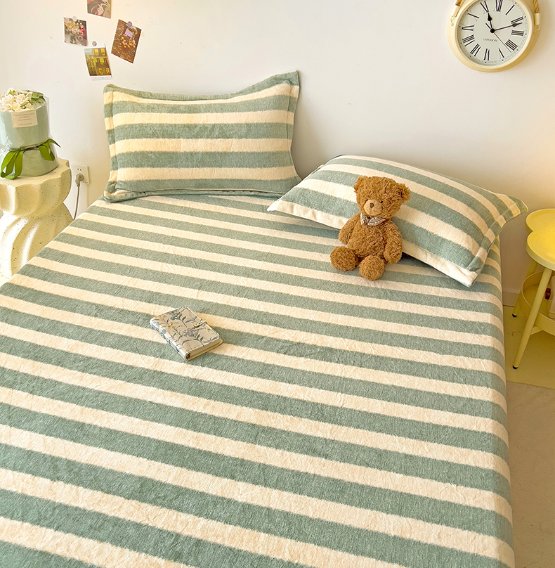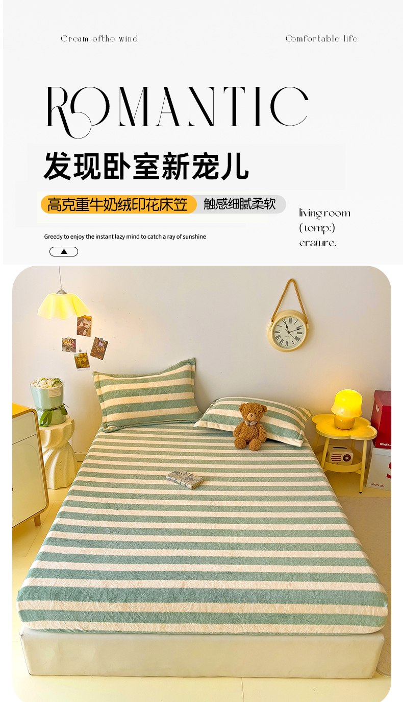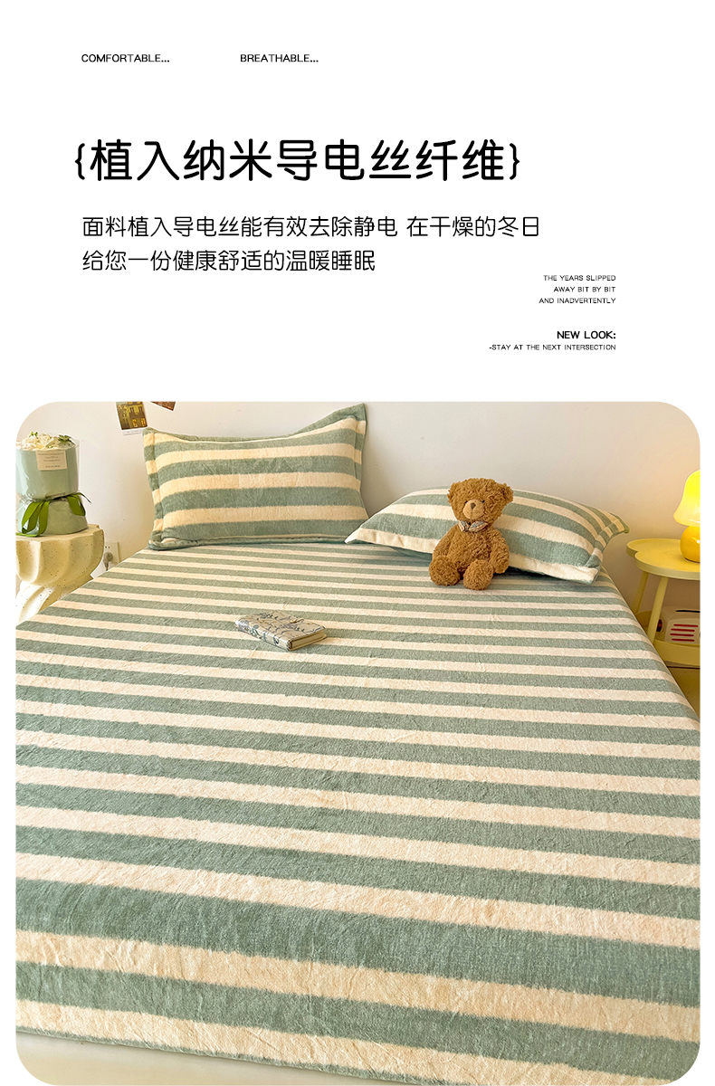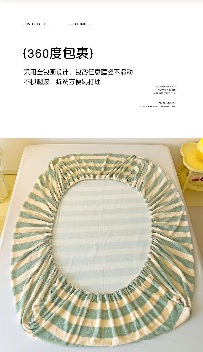大柏树 2025新款A类高克重亲肤舒适牛奶绒印花四件套-单床笠可定制 竖条肌理-绿