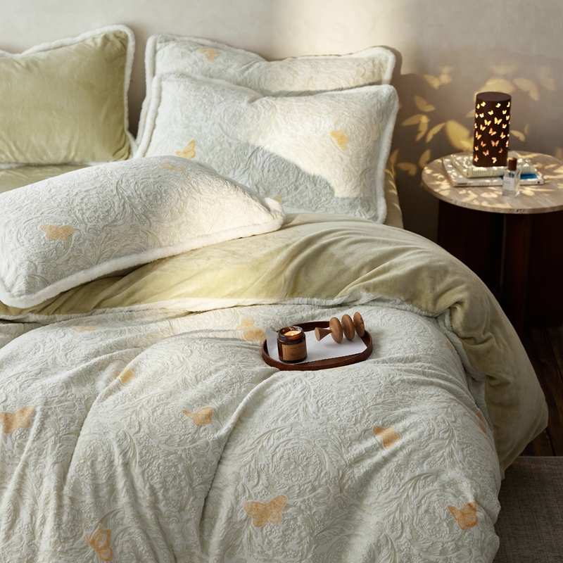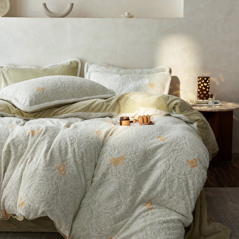 商品名称:初拾 2024新款250g牛奶绒雕花法式四件套—艾米丽(场景一) 艾米丽-柠绿