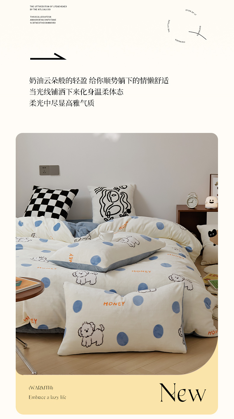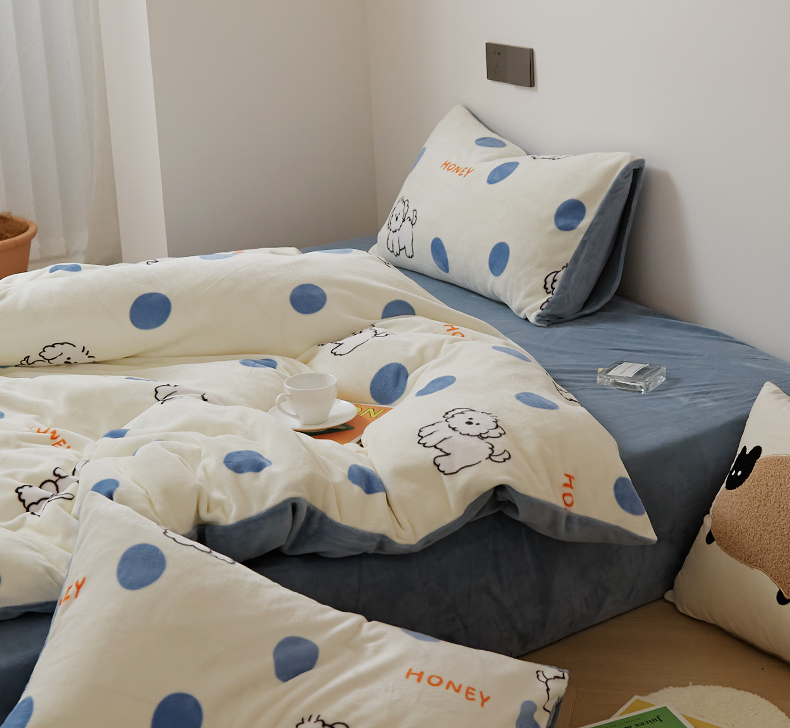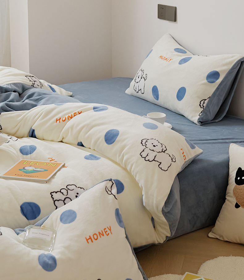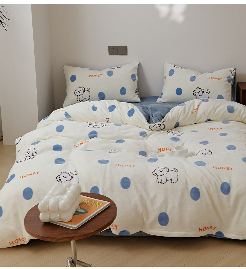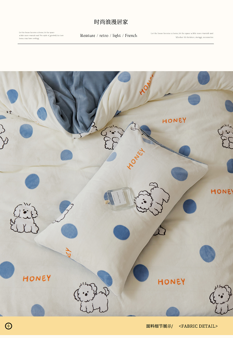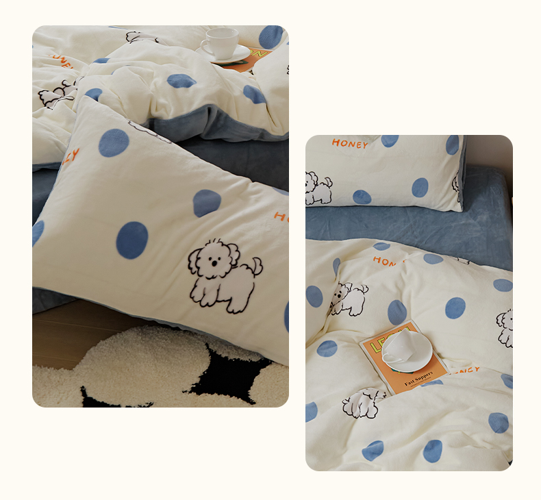 当前位置: 91家纺网 > 商品网购 > 床品套件 > 四件套 > 牛奶绒四件套 > 时光里 2024新款230克牛奶绒印花四件套 波比狗