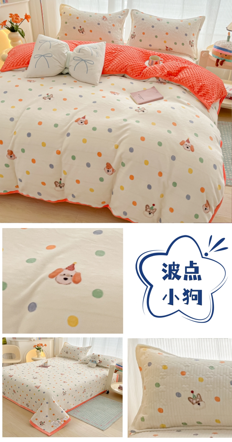 • 91家纺网 家纺一手货源 找家纺 慕晨 2024新款高克重A类牛奶绒印花豆豆绒夹棉单床盖三件被套四件套 彩色波点狗