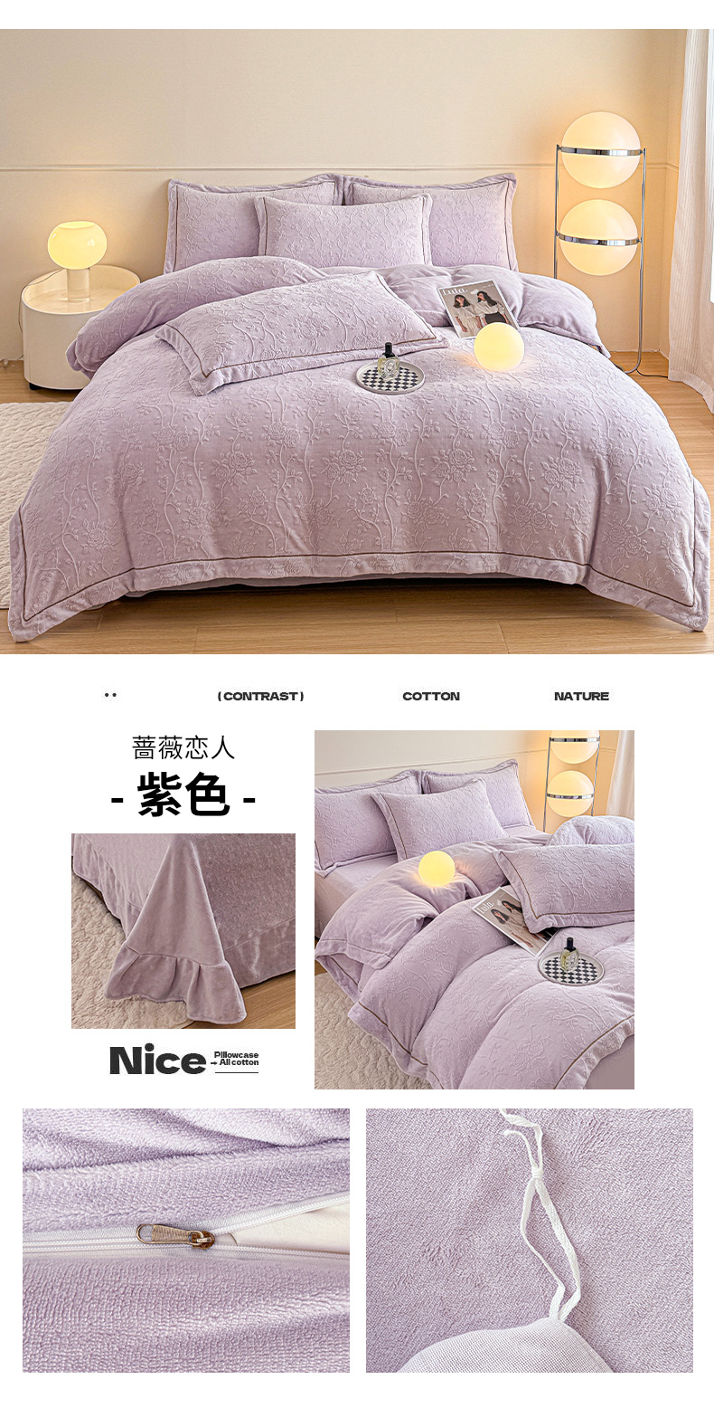 当前位置: 91家纺网 > 商品网购 > 床品套件 > 四件套 > 其它四件套 > (买家秀爆款不断货)A类母婴级牛奶绒雕花四件套珊瑚绒小香风牛奶绒四件套雪花绒四件套雕花绒四件套压线款 蔷薇恋人-紫色