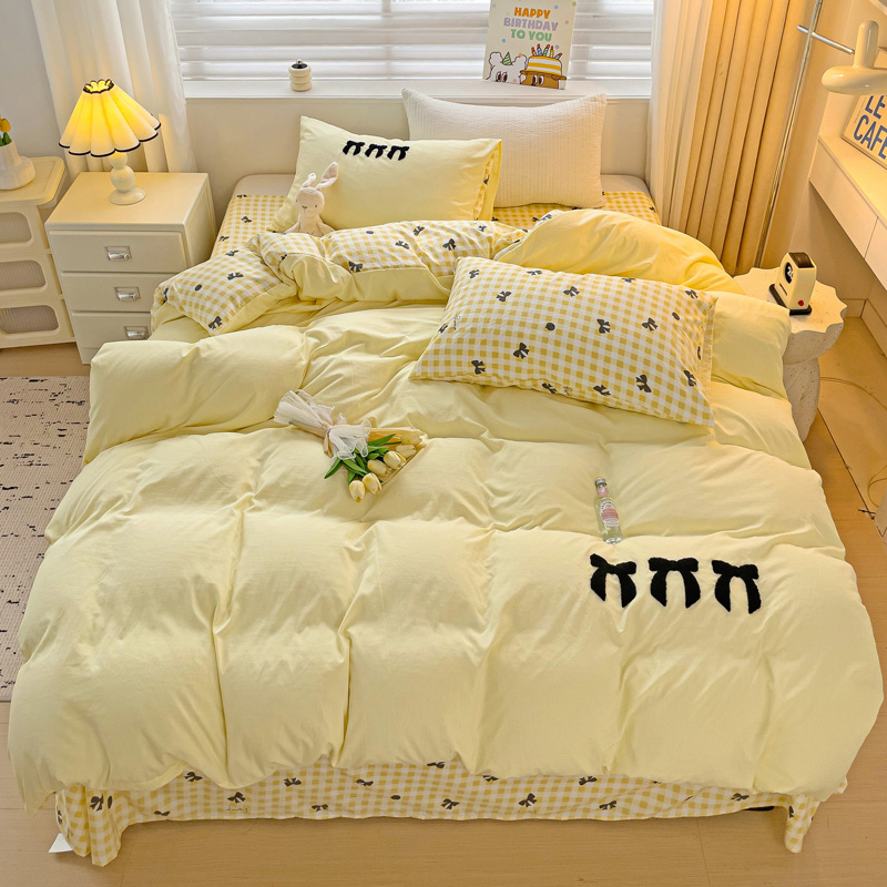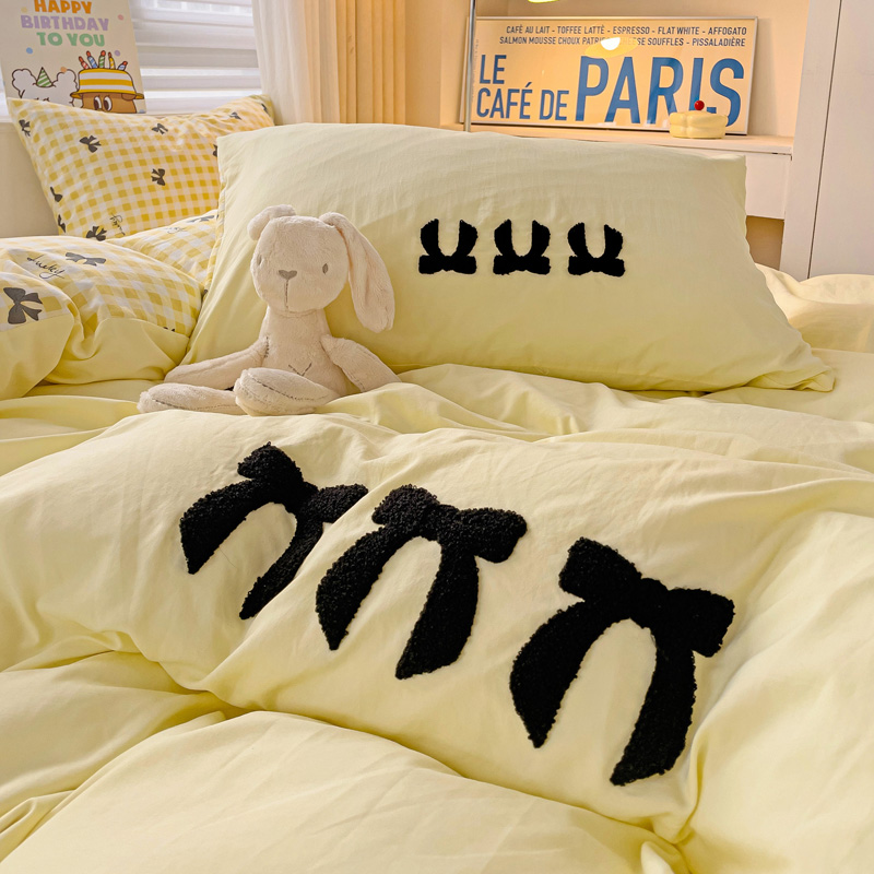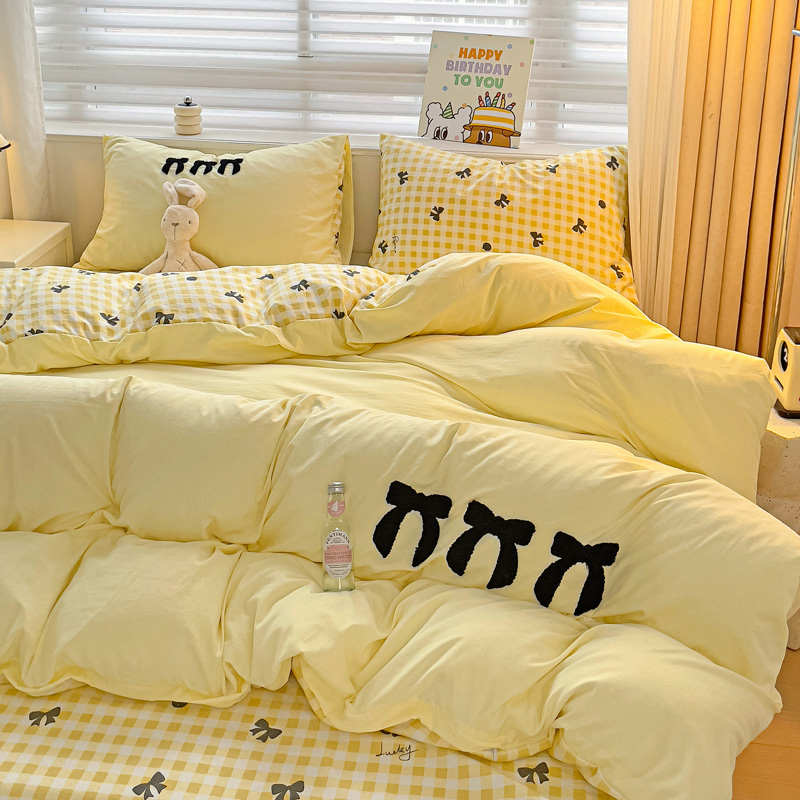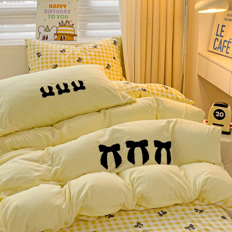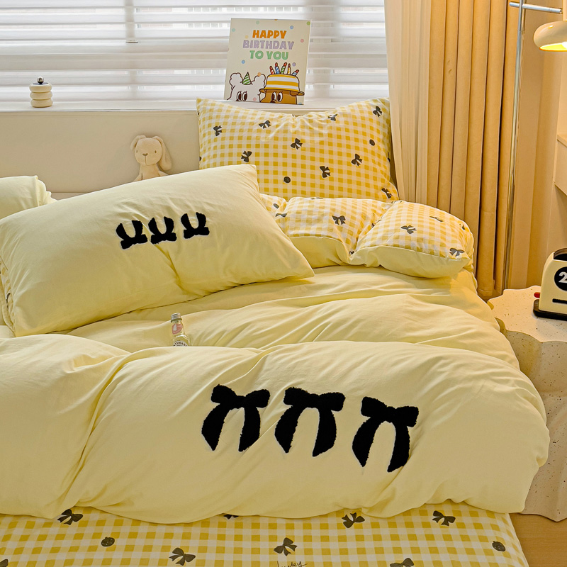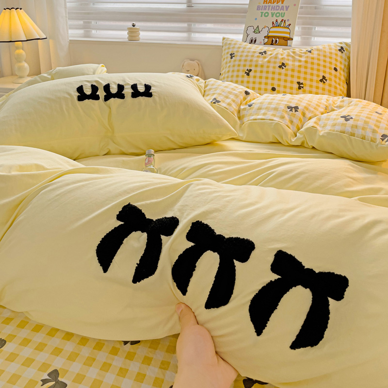 一霖家纺 2024新款高克重云朵棉毛巾绣印+绣小清新系列四件套蝴蝶结-黄