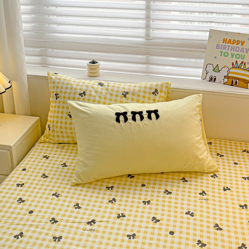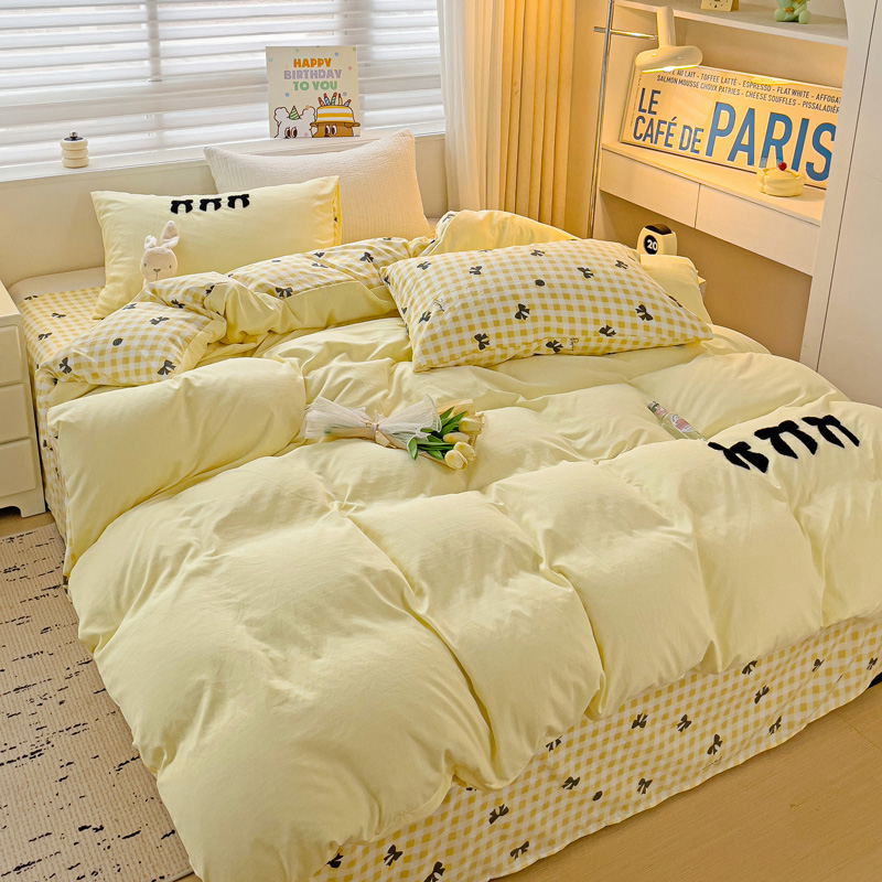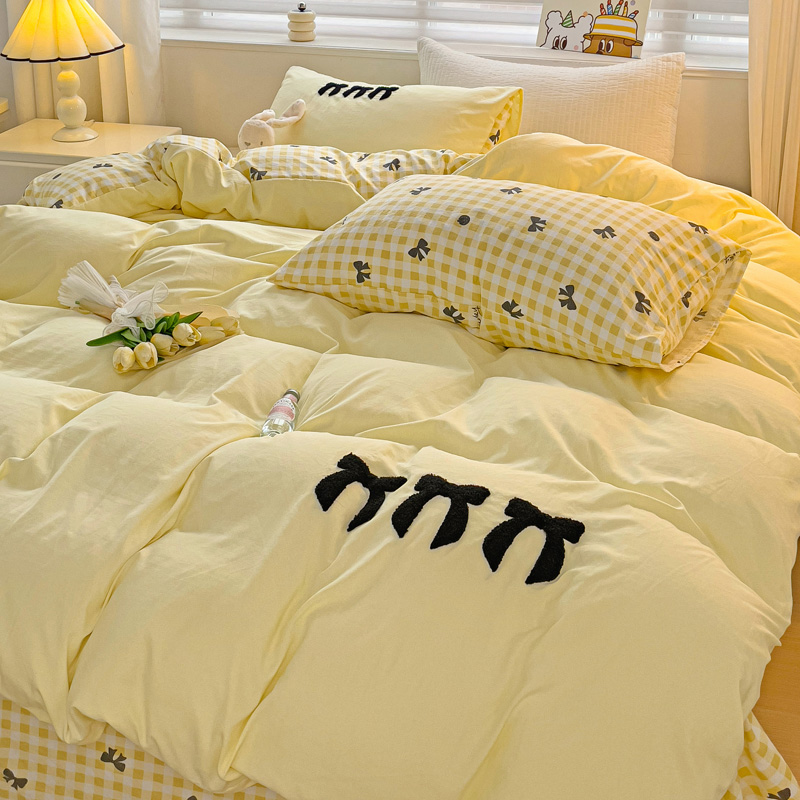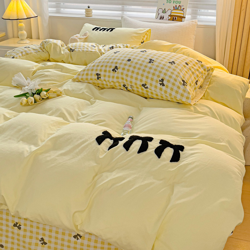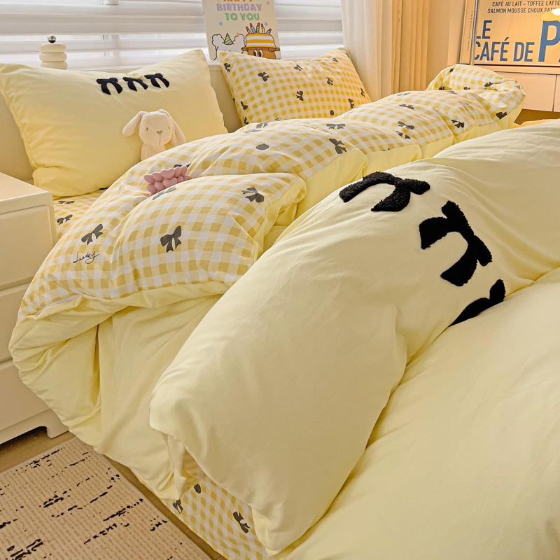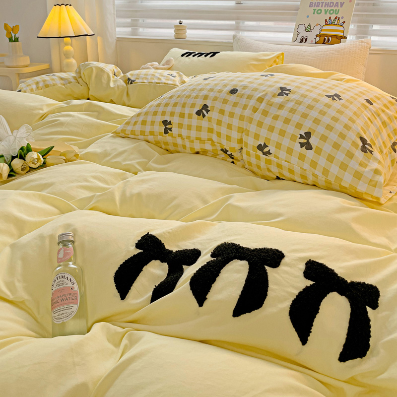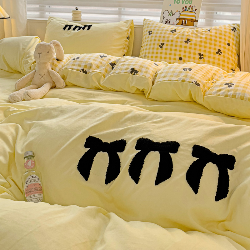 一霖家纺 2024新款高克重云朵棉毛巾绣印+绣小清新系列四件套蝴蝶结-黄