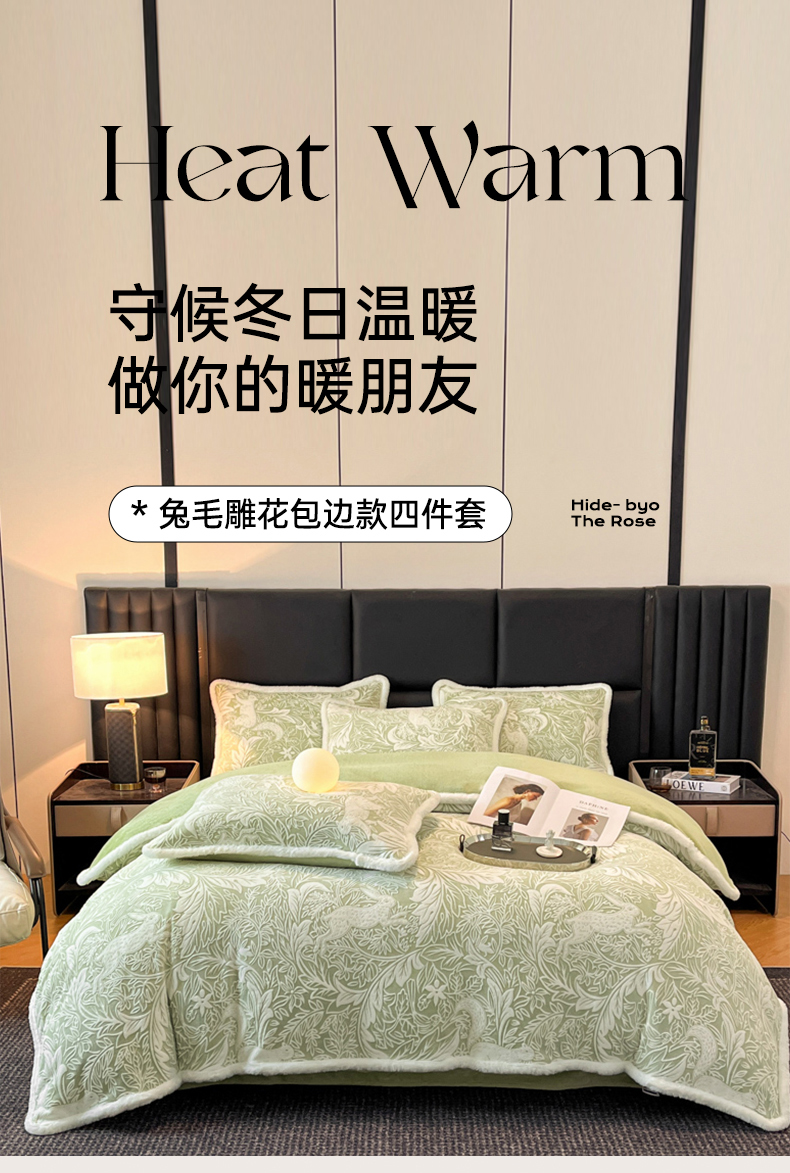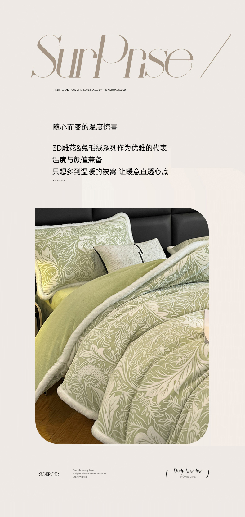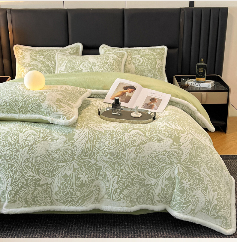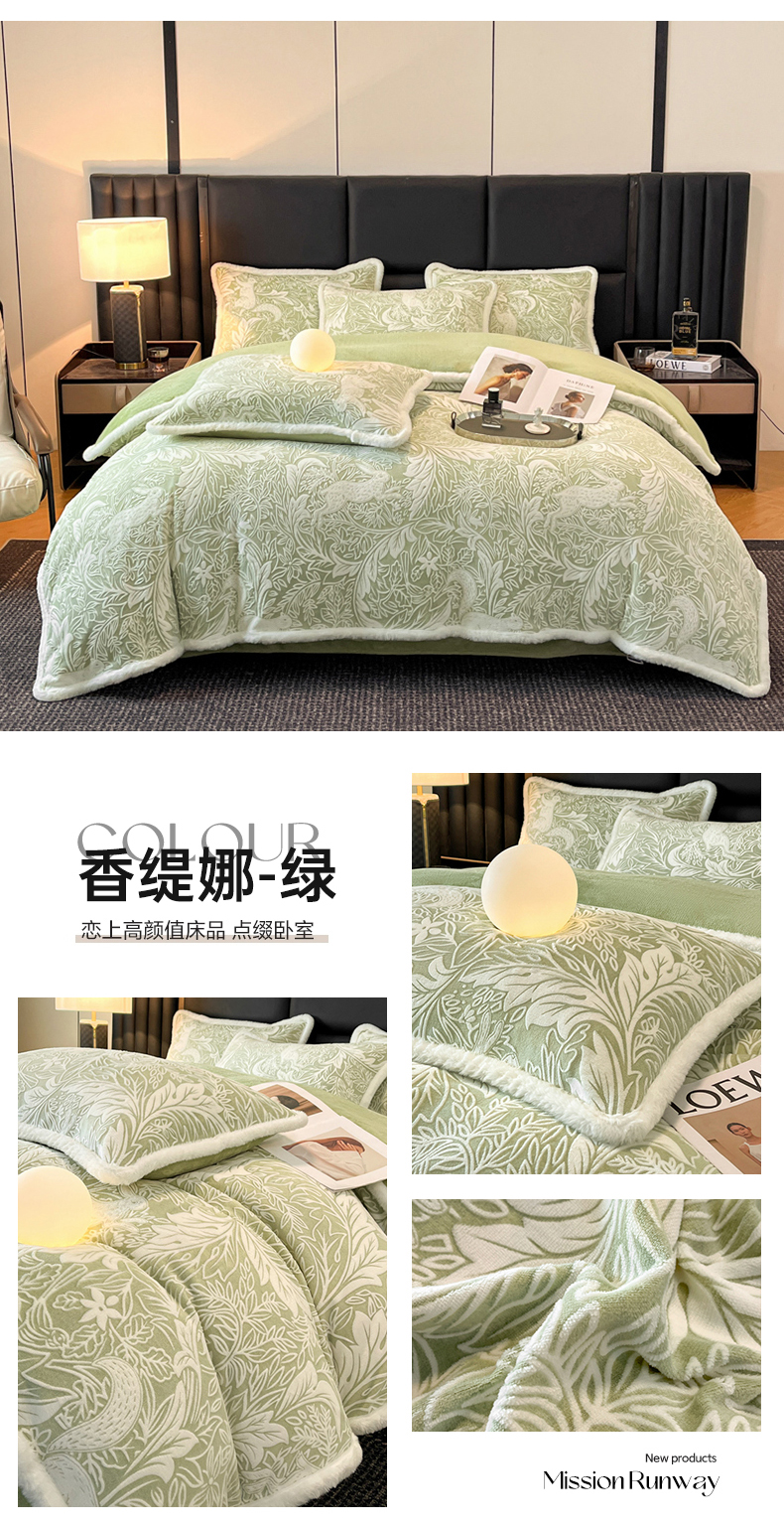 畅畅家纺 2025新款兔毛绒大包边雕花牛奶绒绒四件套 香缇娜-绿