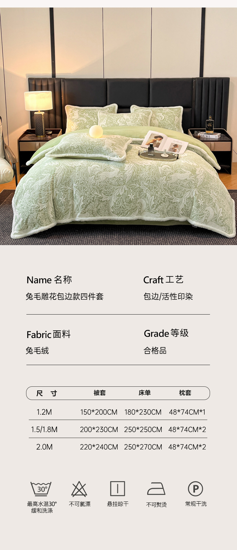 商品名称:畅畅家纺 2025新款兔毛绒大包边雕花牛奶绒绒四件套 香缇娜-绿
