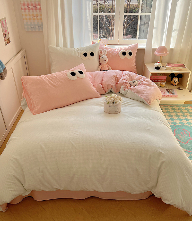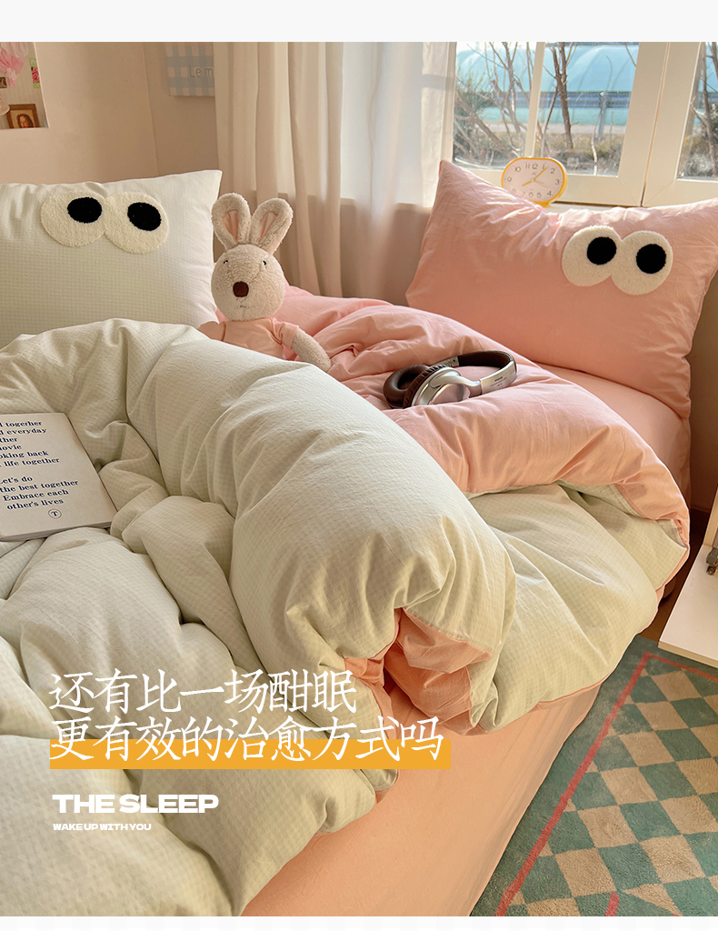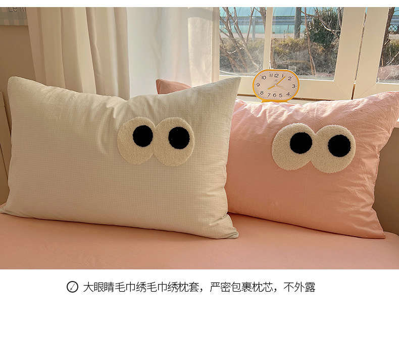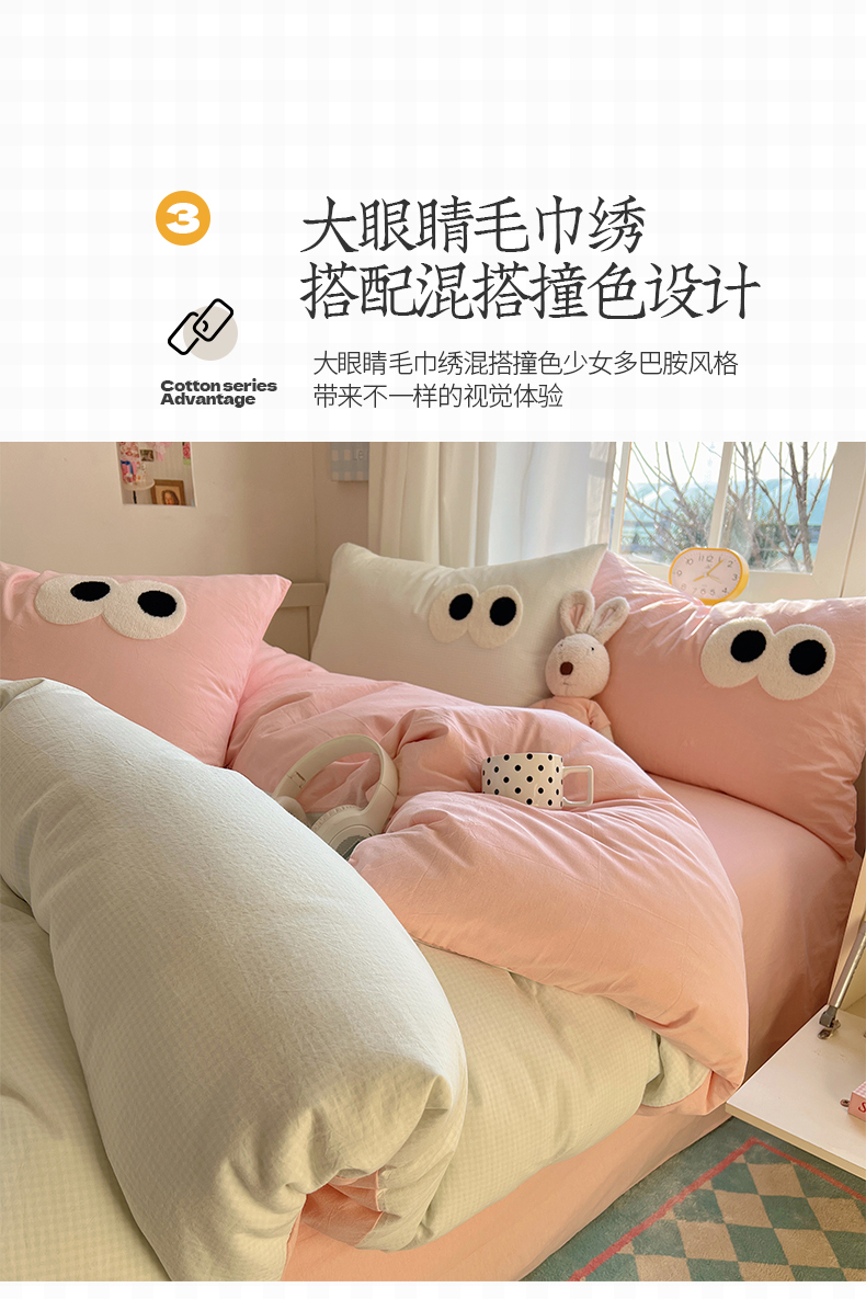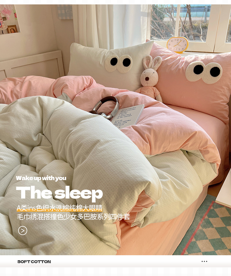 当前位置: 91家纺网 > 商品网购 > 床品套件 > 四件套 > 水洗棉四件套 > 桃子家居 2026新款A类ins色织水洗棉纯棉大眼睛毛巾绣混搭撞色少女多巴胺系列四件套 色织水洗棉-大眼奶绿粉粉