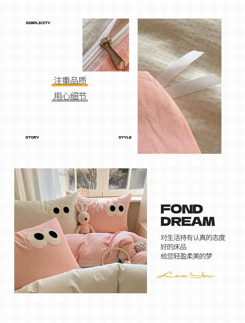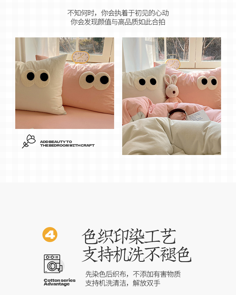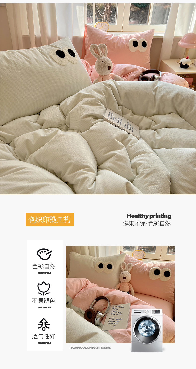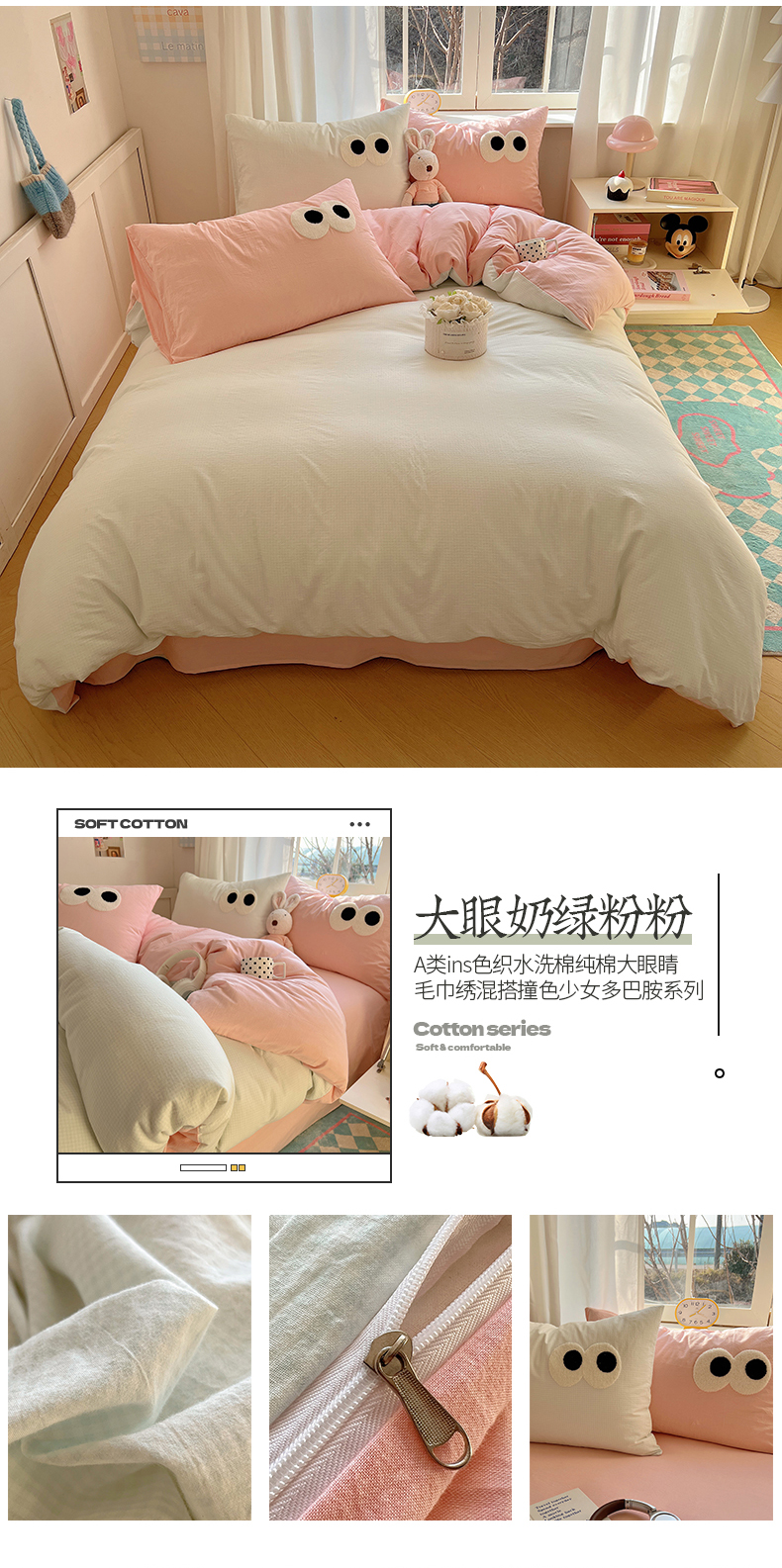 当前位置: 91家纺网 > 商品网购 > 床品套件 > 四件套 > 水洗棉四件套 > 桃子家居 2026新款A类ins色织水洗棉纯棉大眼睛毛巾绣混搭撞色少女多巴胺系列四件套 色织水洗棉-大眼奶绿粉粉