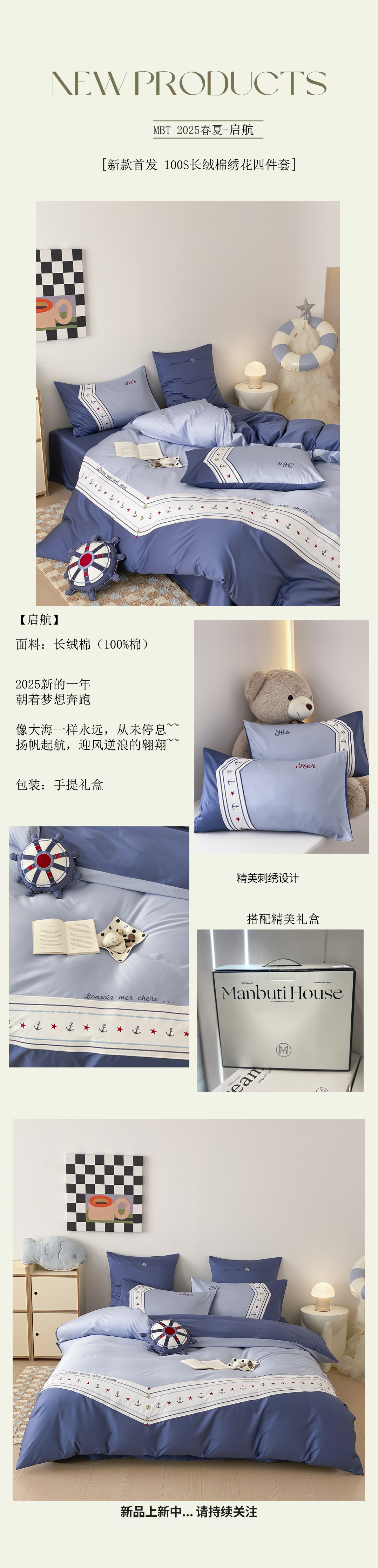 (总)曼布缇 2025春夏新款100s长绒棉工艺款绣花四件套-启航(券后338/378/398/起),启航