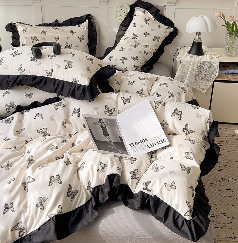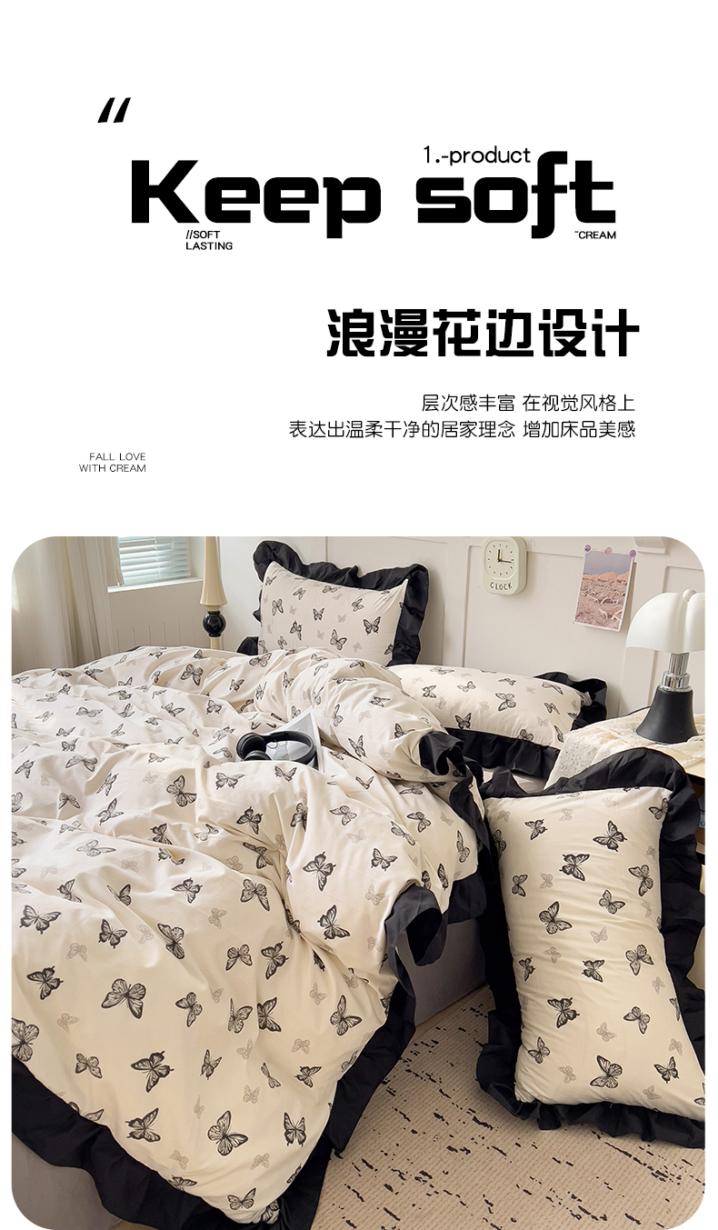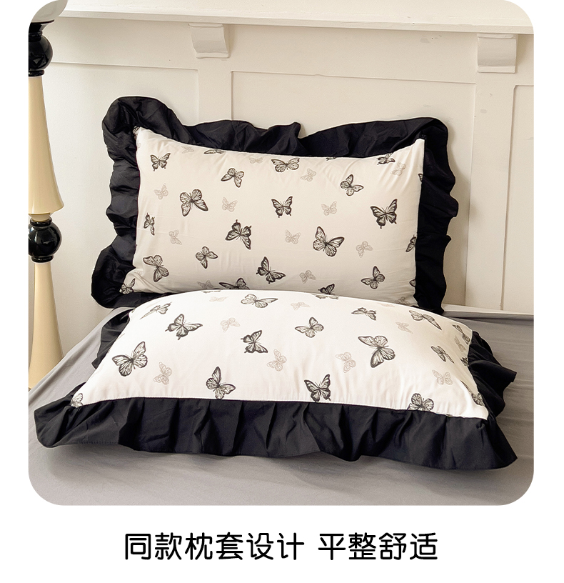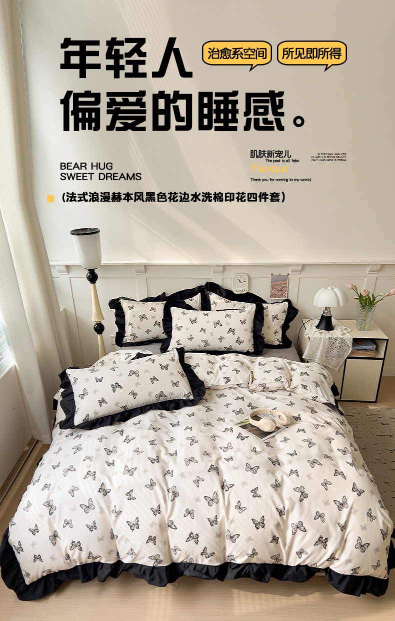 当前位置: 91家纺网 > 商品网购 > 床品套件 > 四件套 > 水洗棉四件套 > 艺玲家纺 2025新款韩版法式赫本风黑色花边水洗棉印花四件套 蝴蝶印记
