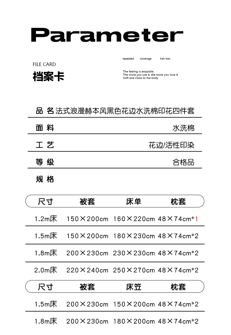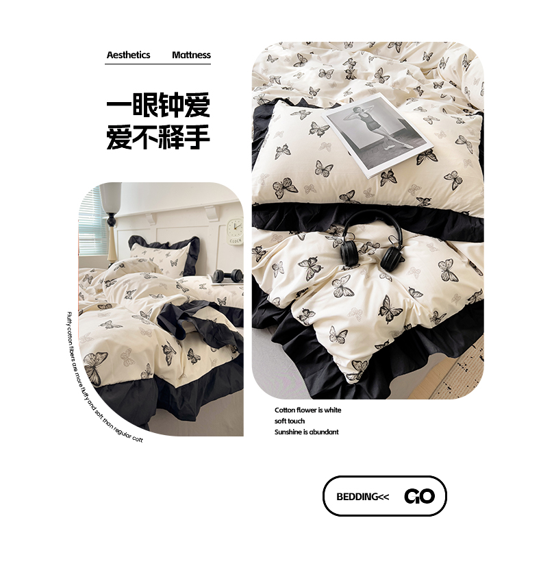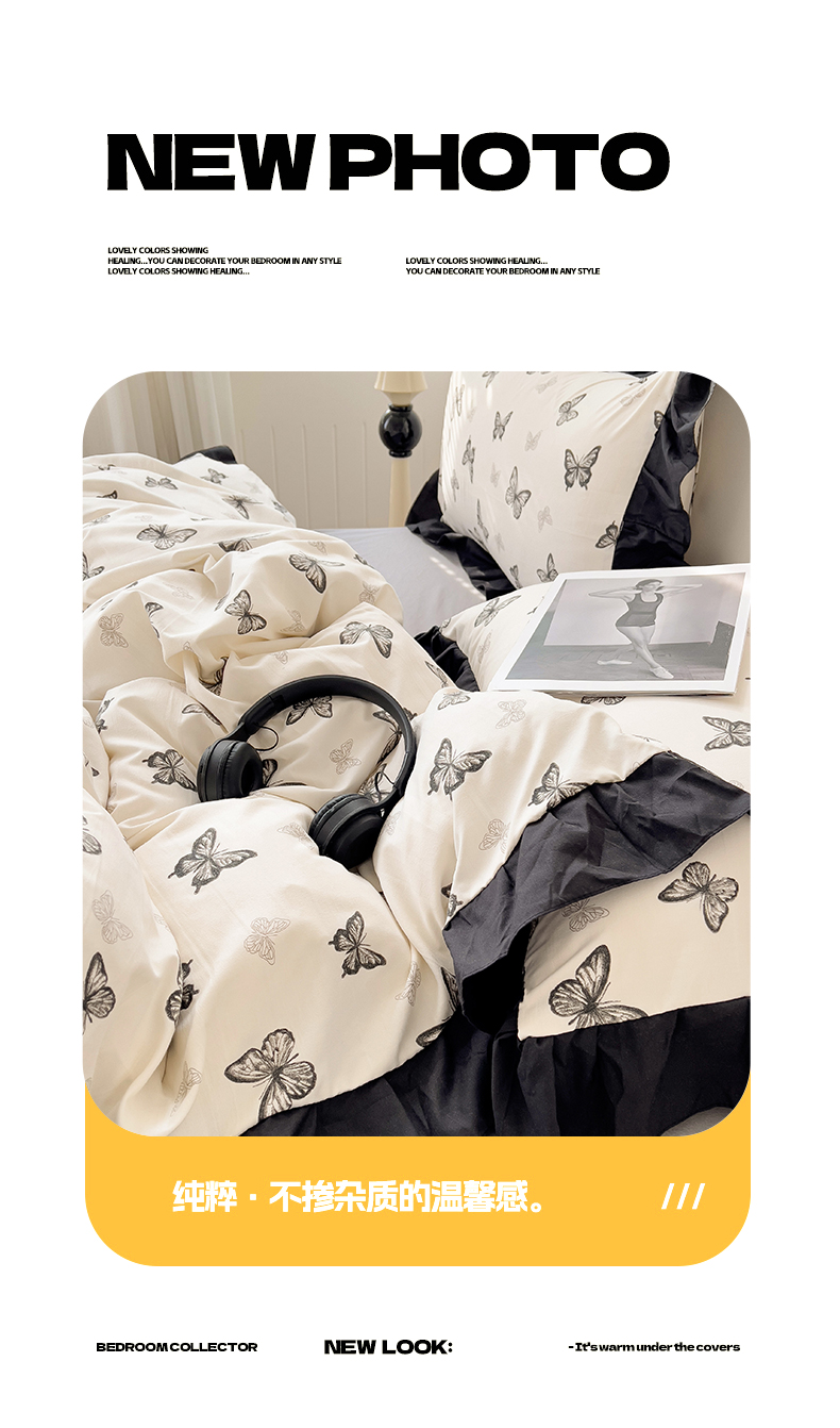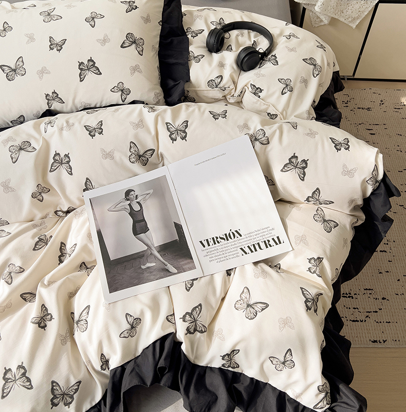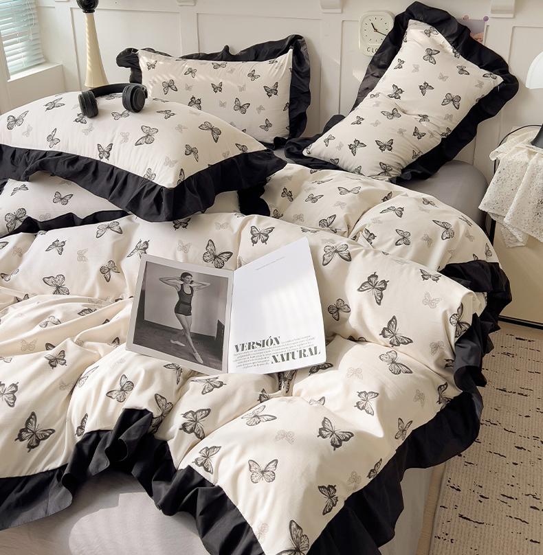 当前位置: 91家纺网 > 商品网购 > 床品套件 > 四件套 > 水洗棉四件套 > 艺玲家纺 2025新款韩版法式赫本风黑色花边水洗棉印花四件套 蝴蝶印记