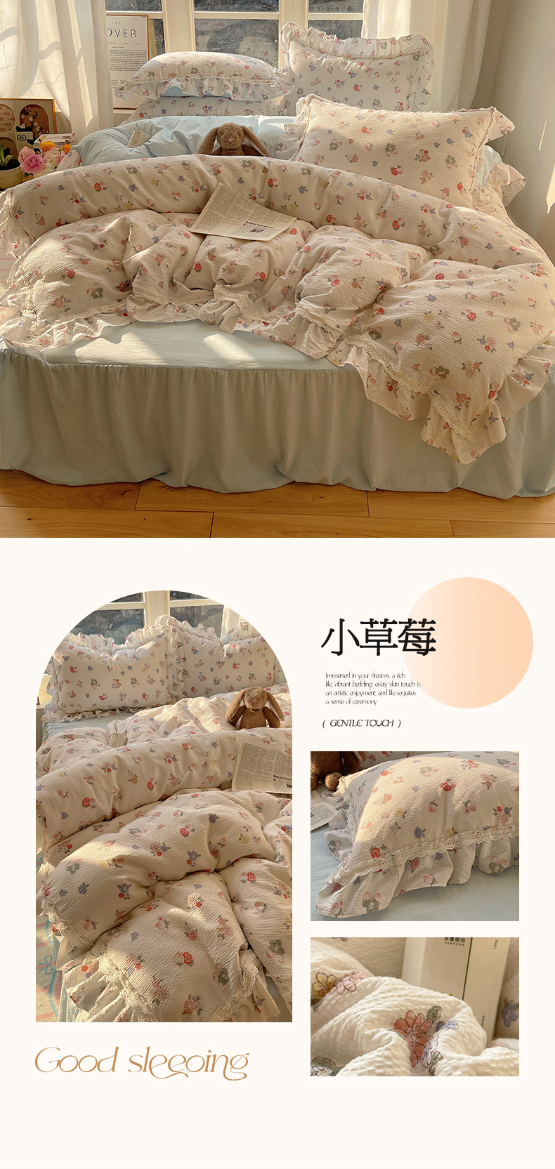 当前位置: 91家纺网 > 商品网购 > 床品套件 > 四件套 > 其它四件套 > 轻奢坊 2025新款法式泡泡棉床裙款四件套 小草莓