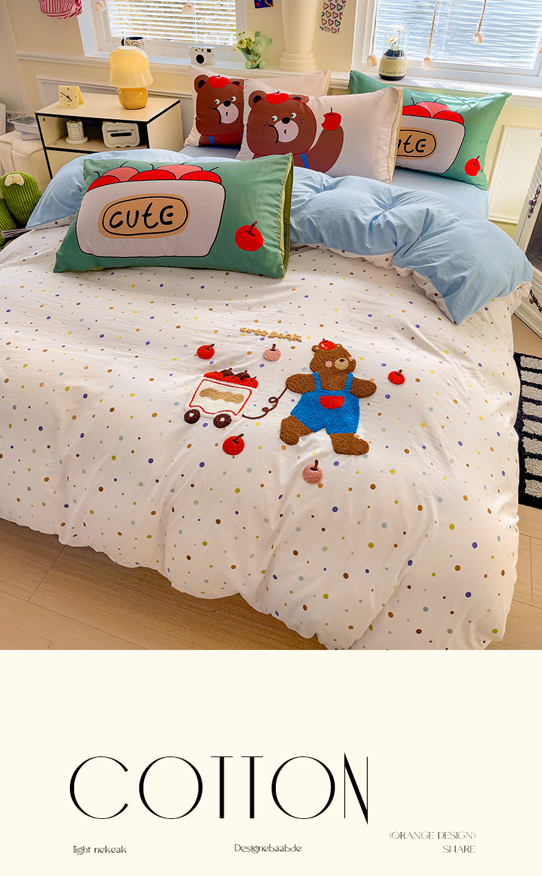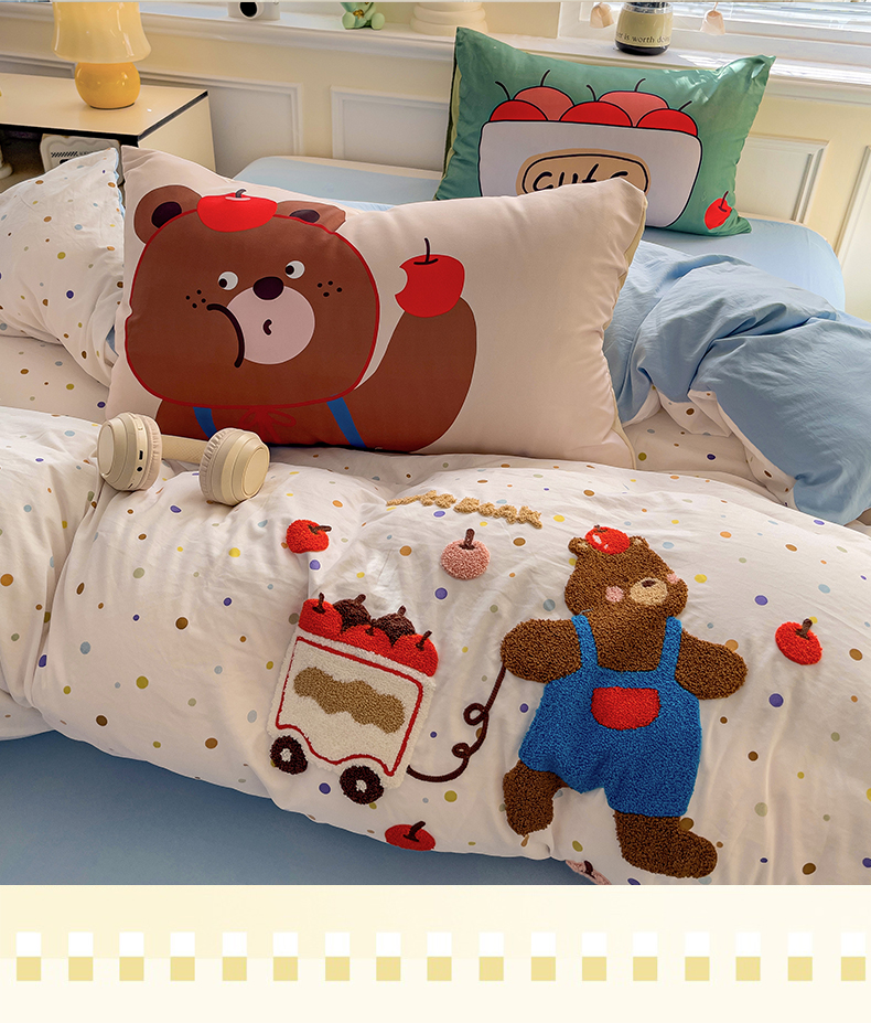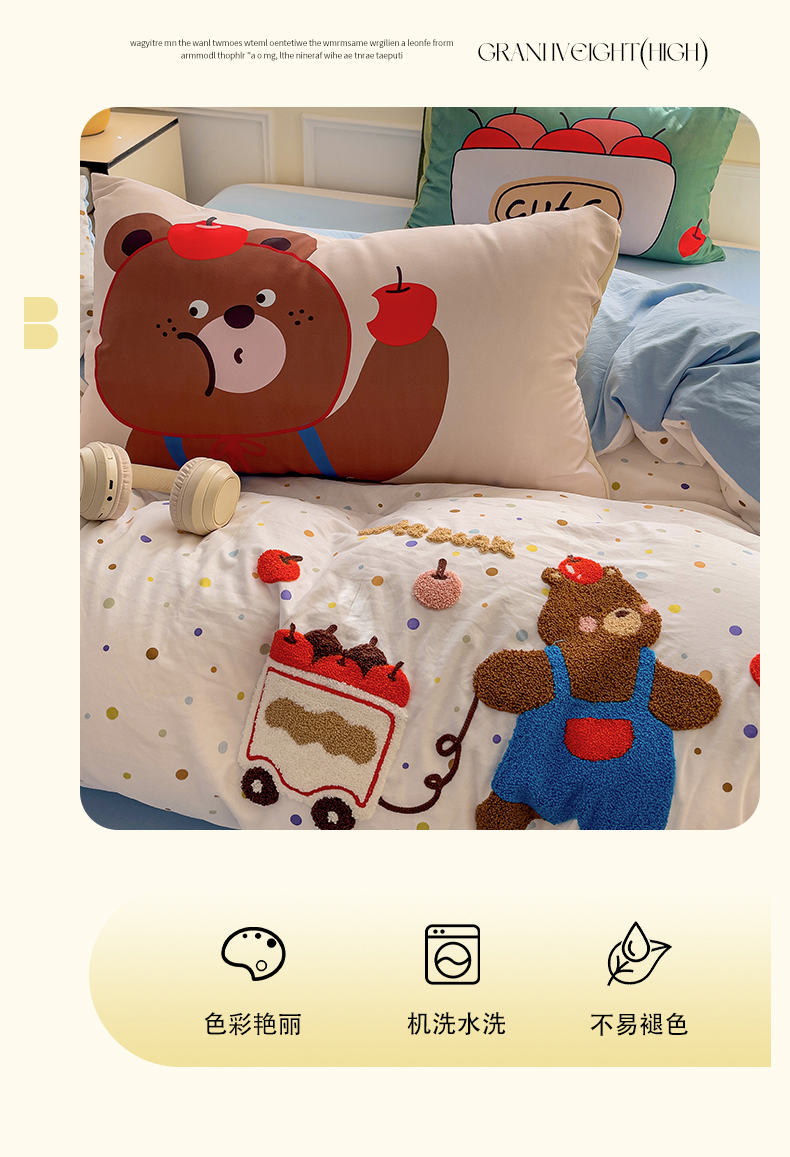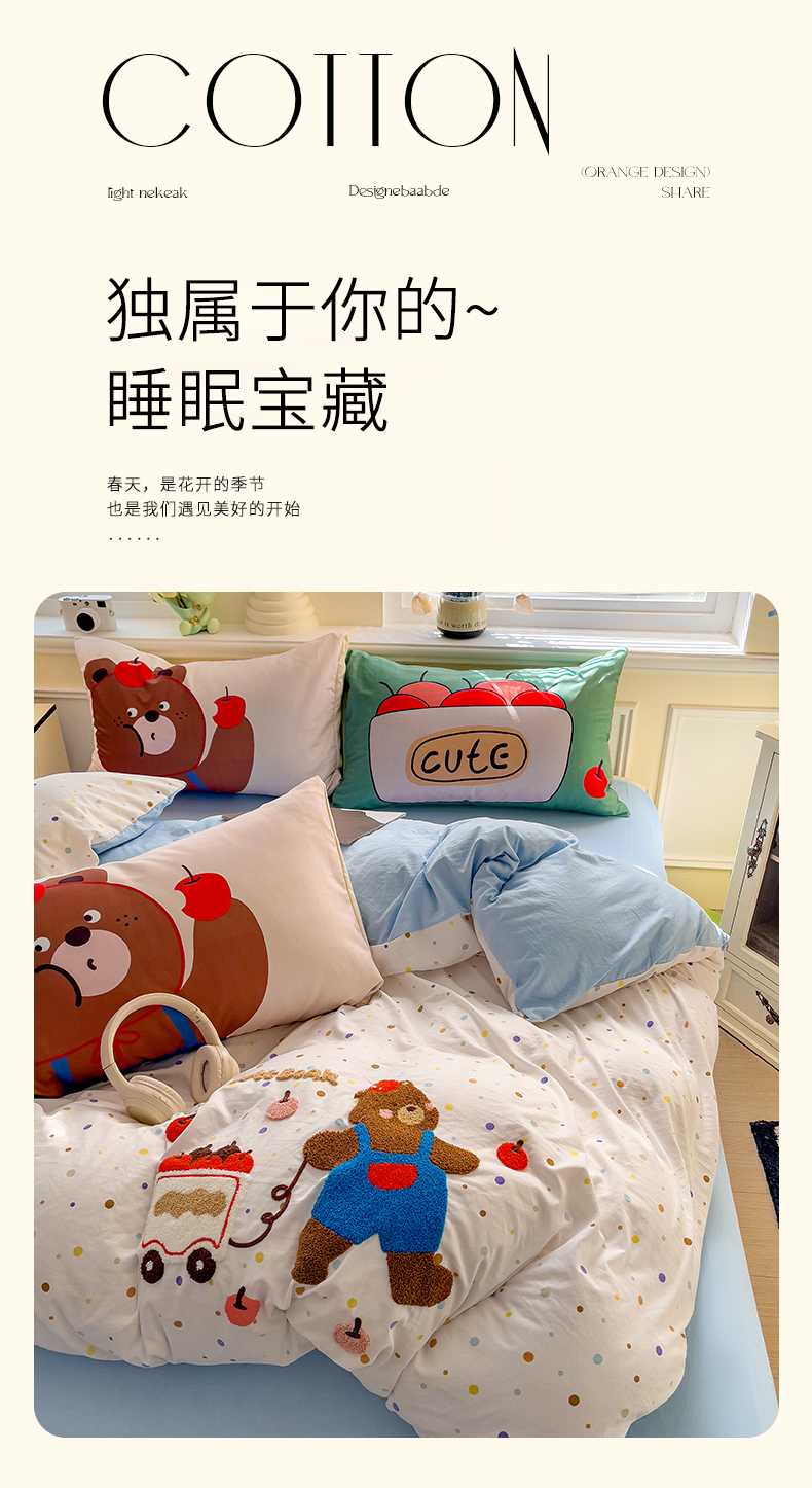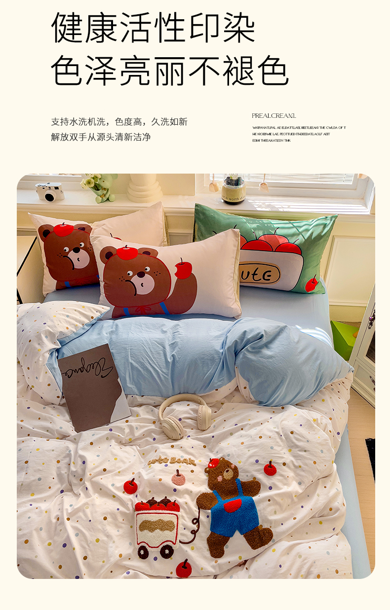 当前位置: 91家纺网 > 商品网购 > 床品套件 > 四件套 > 全棉普通四件套 > 尤米【提供买家秀】2025新款水洗棉大版卡通毛巾绣四件套 苹果熊-波点