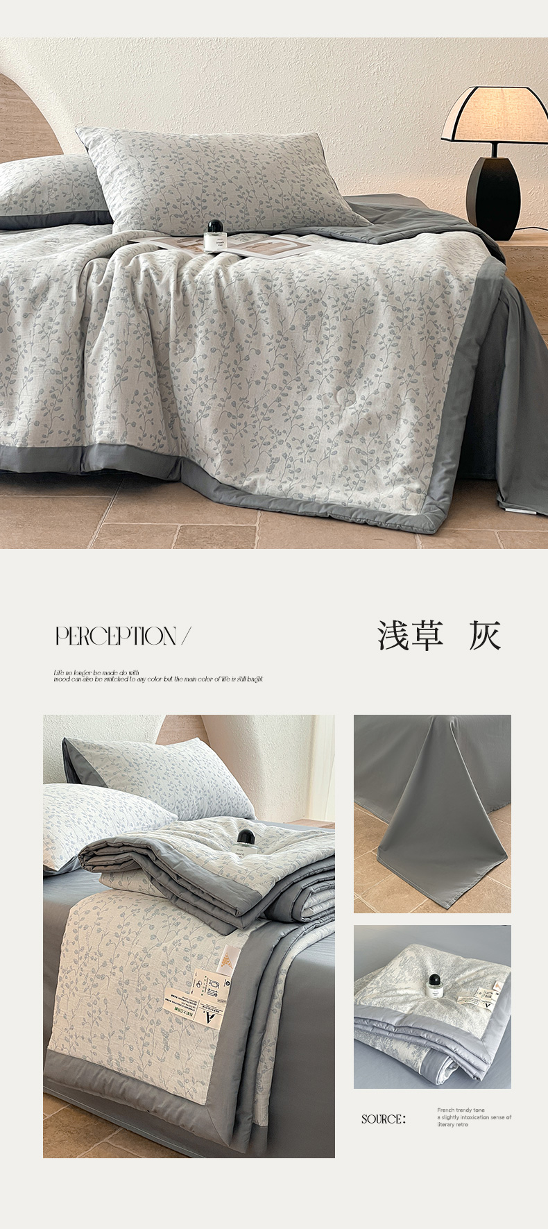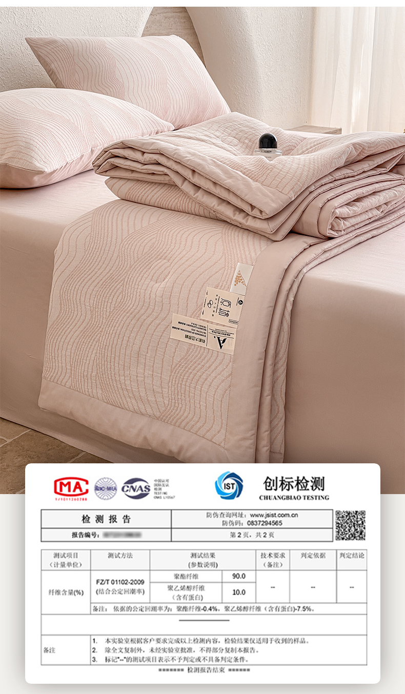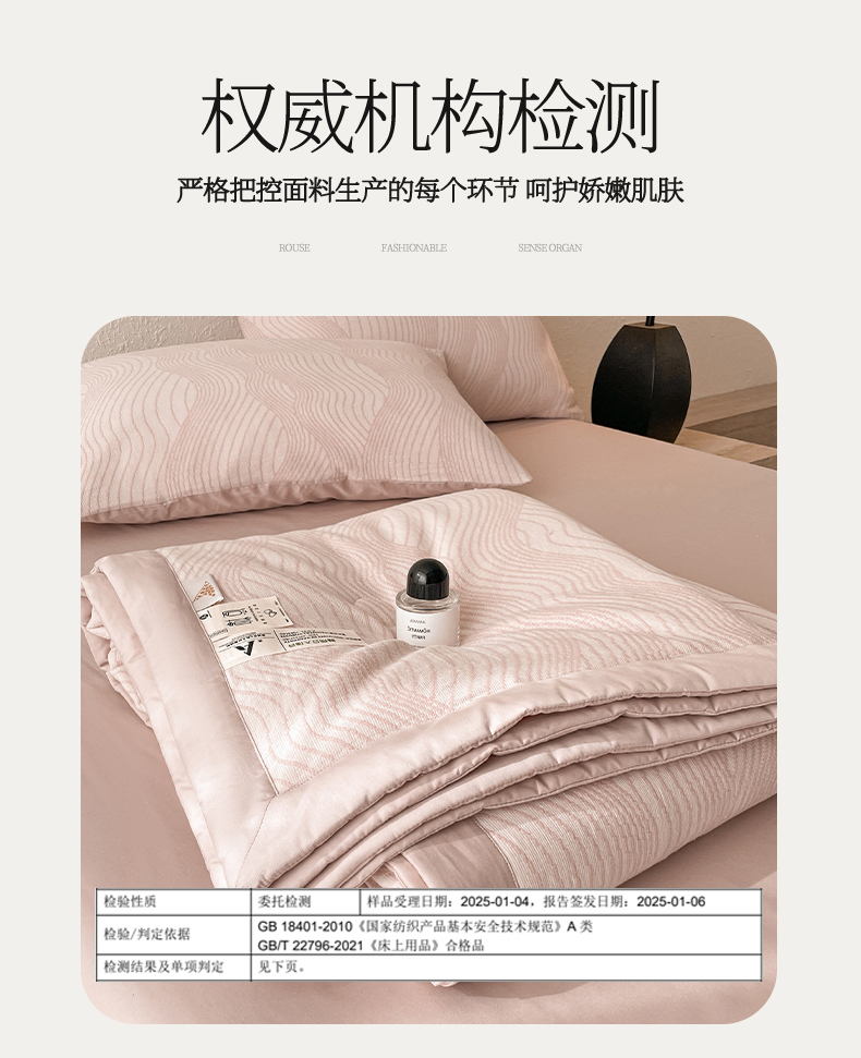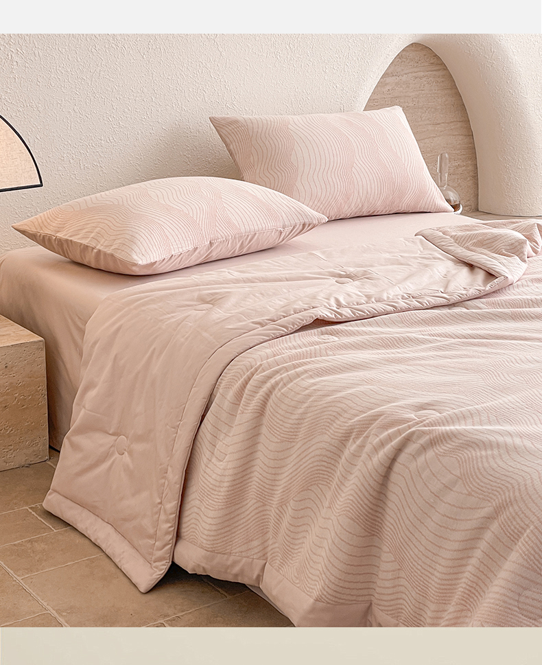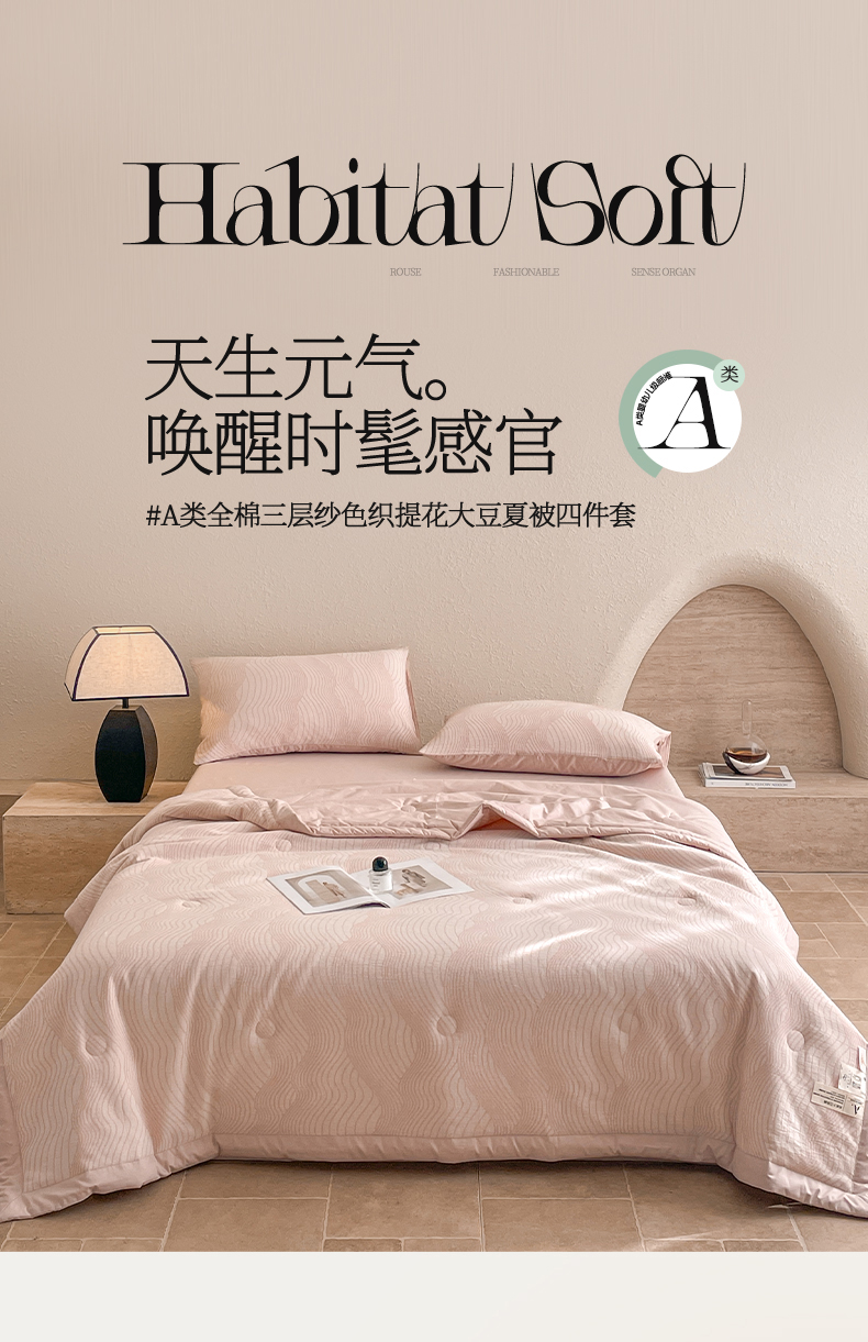 当前位置: 91家纺网 > 商品网购 > 被子 > 夏被 > 一加一家纺2025新款A类全棉三层纱色织提花大豆夏被四件套 波纹--粉