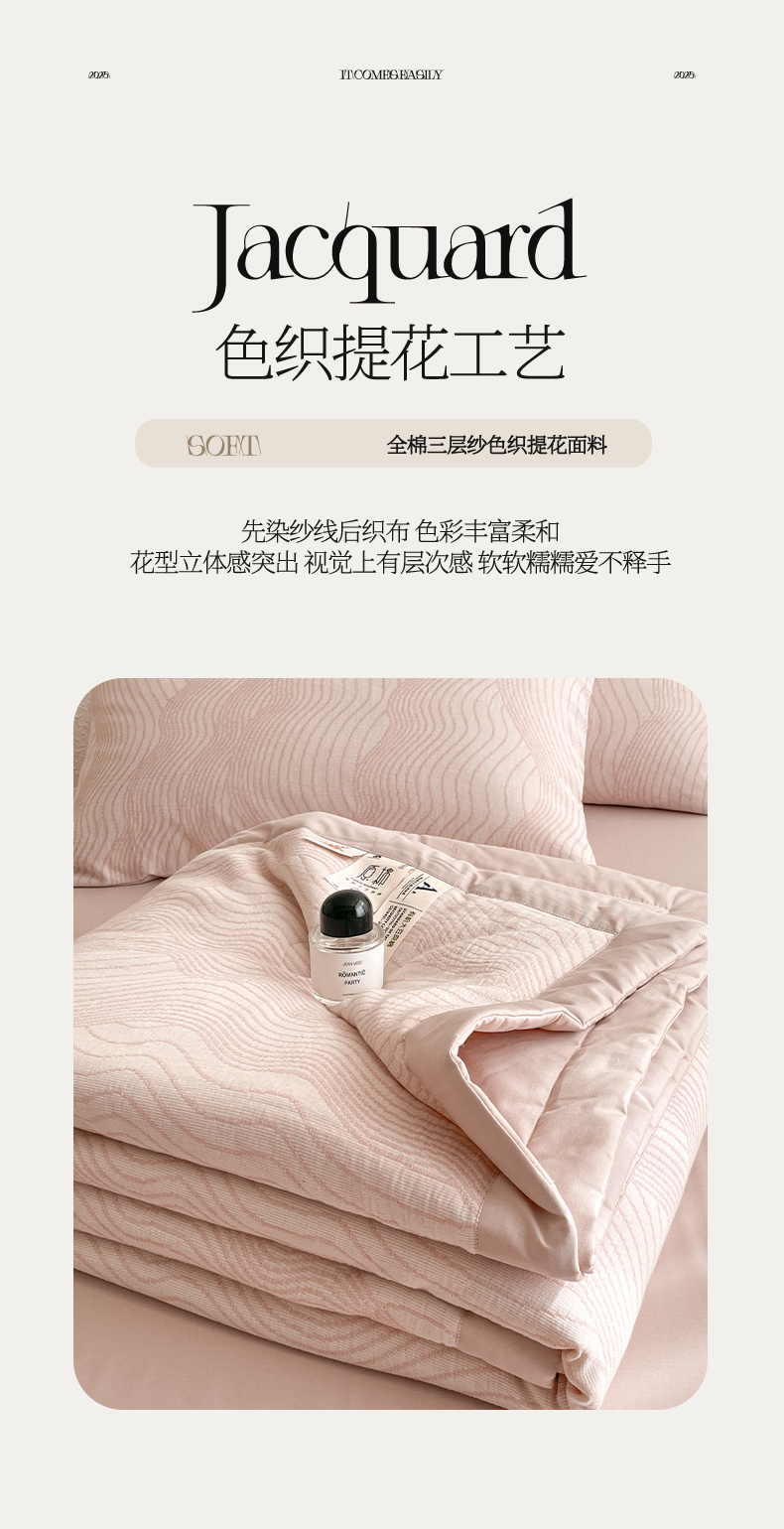 一加一家纺2025新款A类全棉三层纱色织提花大豆夏被四件套 波纹--粉