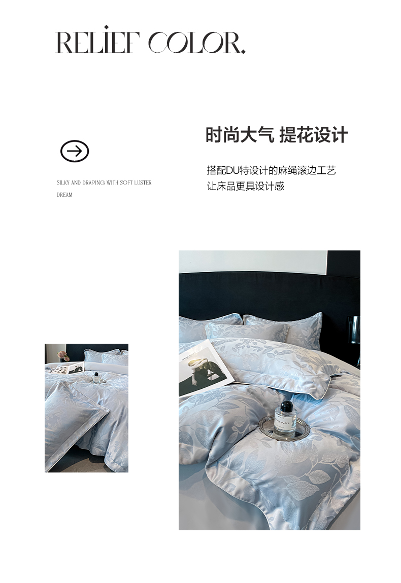 (总)米彩家纺 2025新款A类水洗真丝亮光浮雕花边四件套,粉香槟,粉玉,奶昔白,浅灰,天兰